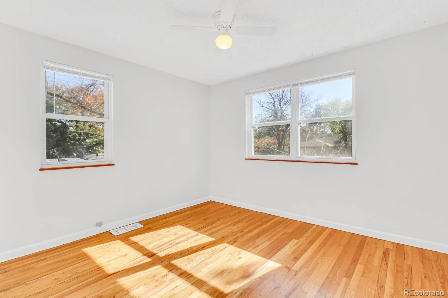 Two bright bedrooms with hardwood floors, roomy closets, and ceiling fans, plus convenient hallway storage drawers.