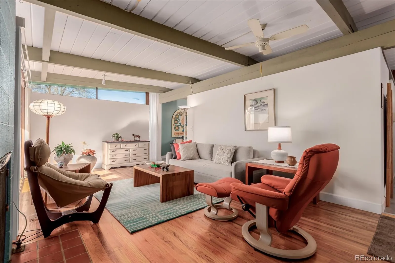 Bursting with mid-century charm and modern updates, this Denver gem invites you home! Pride of ownership shines throughout with a new 20 year roof (2025), new exterior paint (2025), new back yard fence (2025), and new air conditioner (2025)—all surrounded by a beautifully landscaped yard with mature trees for shade and serenity. Step inside this ranch style floor plan to discover gleaming, real hardwood floors, and a spacious airy living room with a ceiling fan and wood burning fireplace perfect for entertaining or relaxing. Vaulted ceilings, mid-century modern windows, and beams decorate the main living area. Enjoy a light-filled addition off the main space that could become a home office or workout area. Large sliding glass doors let natural light pour in, with direct access to the backyard for easy outdoor dining. The kitchen features a stainless steel dishwasher and oven. You’ll also find three generous bedrooms, including an owner’s suite with a private full bath and balcony patio retreat. Thoughtful storage abounds with three hallway closets and an extra-deep attached one-car garage ideal for tools, gear, or hobbies. Whether you’re sipping coffee on the patio or enjoying evenings under the trees, this home balances comfort, function, and timeless design. Conveniently located near shopping, schools, parks, and trails—1310 S Dahlia Street is ready to welcome its next story!