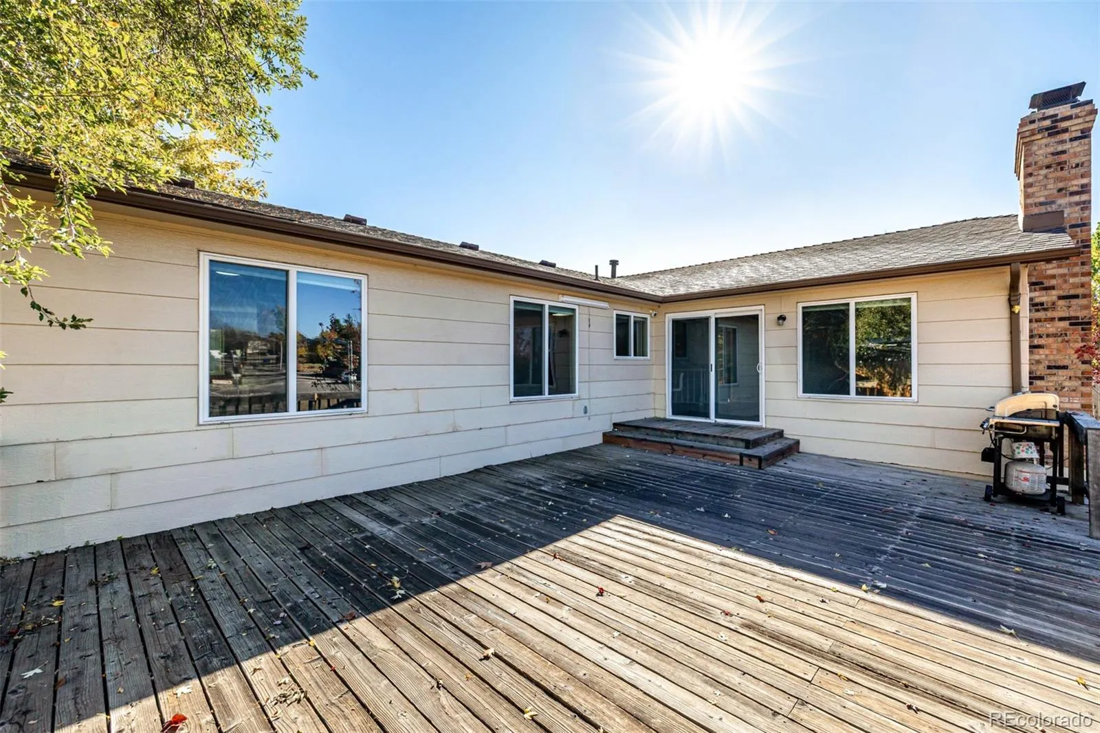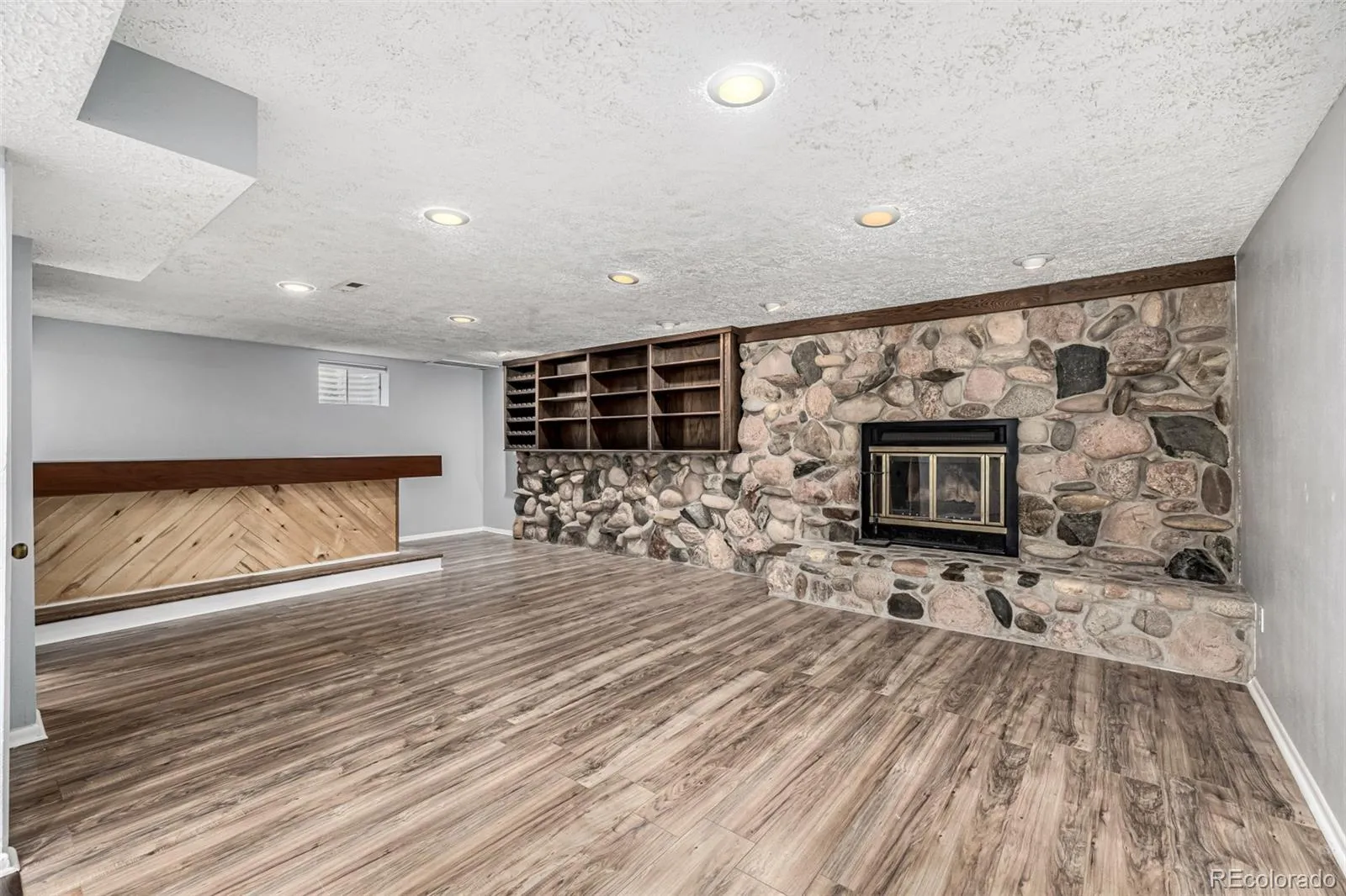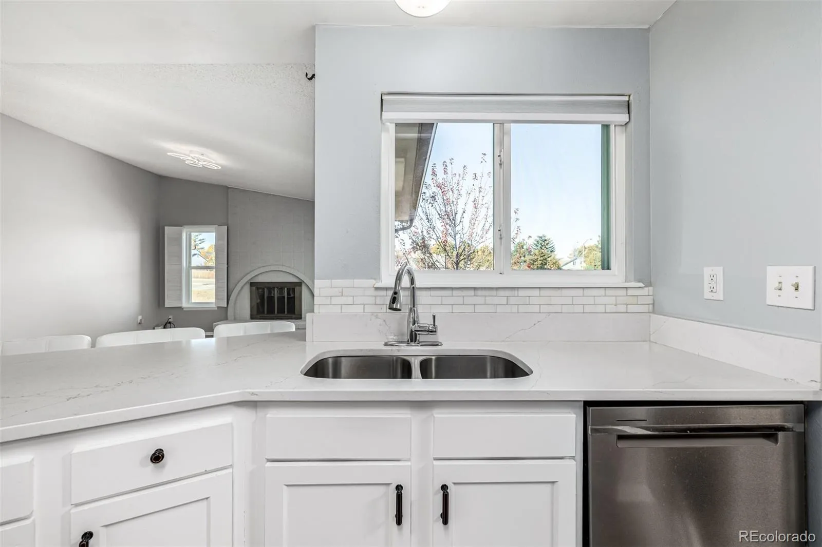 A refined home in the Cherry Creek School District offers an elegant blend of modern comfort and timeless simplicity. The exterior is approachable and classic, while inside, modern plank flooring introduces a sense of warm and seamless continuity as it leads through connected spaces. The living room centers around an oversized picture window that frames the quiet neighborhood and draws natural light in. Just beyond, the dining room enjoys a view of the backyard, creating the sense of indoor and outdoor spaces in conversation. The kitchen feels iconic in both character and function. Chic white cabinets, a subway tile backdrop, and stainless appliances form a composition both stylish and enduring. A breakfast bar peninsula provides an intuitive connection between kitchen + family room, creating an open environment ideal for gatherings. The family room features an expressive white brick fireplace flanked by windows, adding depth, light, and a subtle note of sophistication. The primary bedroom feels calm and well proportioned with generous natural light, an ensuite bath with dual sinks, and a walk in closet. Two additional main level bedrooms enjoy the same thoughtful design, with excellent closet space and functional layouts. The finished basement expands the living potential significantly. A secondary living room with a stone-faced fireplace, built-in wet bar, and integrated shelving adds dimension, making this level perfect for recreation, film nights, or future vision. Additional rooms and storage create flexibility for evolving needs. Outdoors, a substantial wood deck overlooks the yard, while a paver patio below introduces a second outdoor zone. With no neighboring homes directly behind the property, the space feels open and usable, perfect for quiet mornings, evening conversations, or entertaining. A rare opportunity in the Cherry Creek School District, this residence offers modern updates, intuitive flow, and spaces that support connection, comfort, and ease.