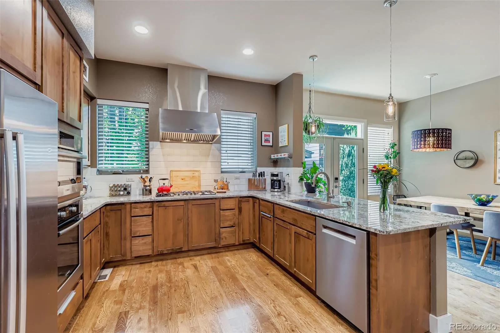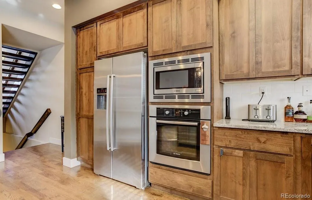 Welcome to 8734 Martin Luther King Blvd, this stylish contemporary townhome is ideally located directly across from Central Park. The large pave-stone patio welcomes you to this stunning 3 bed, 4 bath home replete with thoughtful updates, tasteful finishes, and a layout that lives effortlessly across three levels. The main floor features hardwood floors throughout this open floor plan which includes a spacious living room with 10′ ceilings, cozy fireplace and, custom shelving. The adjoining dining area is bright and open with access to the outdoor patio and additional seating at the island bar. The kitchen boasts granite counters, professional 5-burner gas cook-top and hood, built-in convection oven with microwave and 42″ walnut cabinetry. The private fenced patio is ideal for a serene morning coffee, or hosting gatherings with family. Upstairs, the primary suite features two walk-in closets and en-suite 5-piece bath with oversized tub, tile floor/shower surround. Relax on the private balcony with views of the park and a glimpse of the mountains! The second bedroom, a second full bath, plus a loft office area which would also serve quite nicely as a reading nook, plus the laundry closet with a full sized washer and dryer and storage affords ultimate convenience and completes the upper level.The fully finished basement features a family room and a very comfortable guest quarters with a bedroom, a walk-in closet, and an egress window, plus a 3/4 bath. A two car detached garage offers additional storage and there is ample guest parking in front on a private street. The new owners will enjoy the close proximity of Stanley Marketplace, Eastbridge Town Center as well as the Town Center on 29th. Central Park residents also have access to community amenities which include a sprawling 43-acre park, an extensive network of trails and bike paths, a clubhouse, fitness center, parks, pools, and tennis courts. Don’t miss this incredible opportunity!