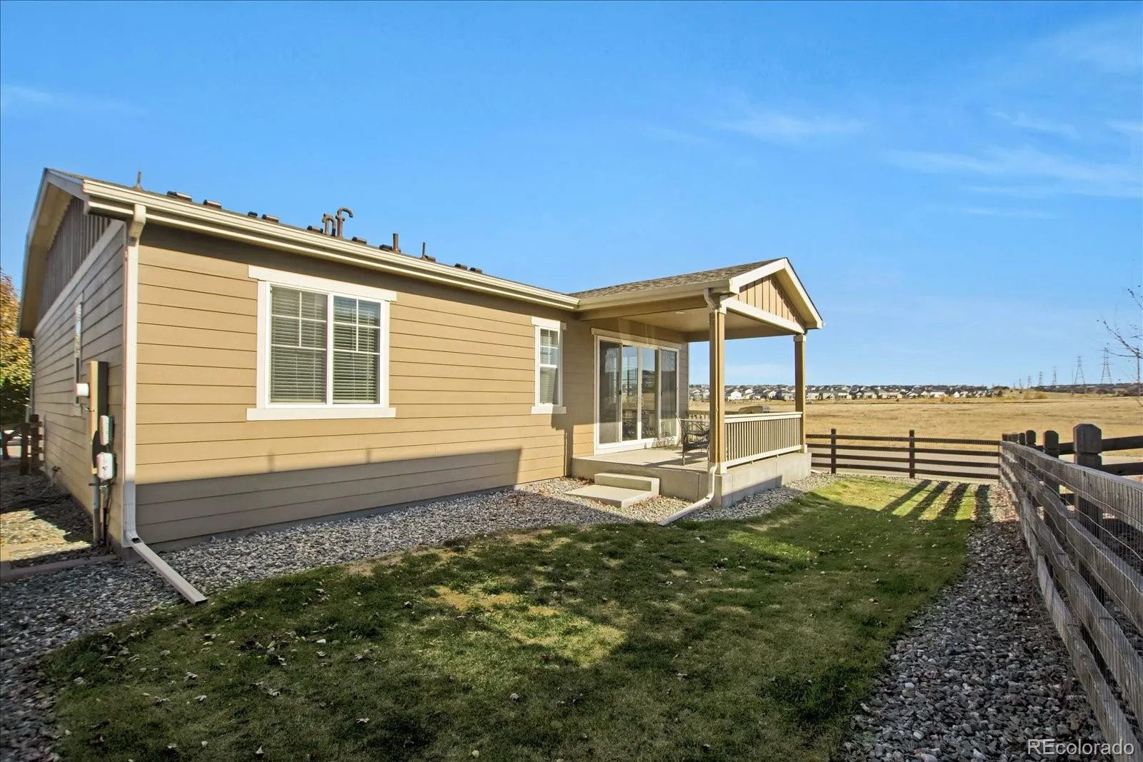 Welcome home to this beautiful 3 bedroom, 2 full bath Copperleaf ranch built in 2018 in the Cherry Creek School District! This single-story home sits on a desirable corner lot and offers open-concept main level living with tall ceilings, a spacious kitchen that opens to a great room that can accommodate a large sectional couch and dining table and has great natural light from oversized sliding doors. Step out to the covered deck overlooking open space — your own private retreat for morning coffee or evening sunsets. The primary suite features a private en suite bathroom with double sinks, private toilet room, large shower, and ample vanity and wall storage. There is a large walk-in closet with ample storage space. Two additional bedrooms and a full bath with tub provide flexibility for guests or a home office or even a roommate situation. Enjoy the Copperleaf community amenities including a pool, clubhouse, and playground, and appreciate being walkable to neighborhood schools. The fully fenced yard, attached 2-car garage, and move-in ready convenience with all kitchen appliances plus washer and dryer included make this home a standout. The roof was replaced in October 2025 and the HVAC has been cleaned and serviced in October 2025 (See Supplemental Docs). Ideally located near E-470, Southlands Shopping Center, and local parks, this Copperleaf gem offers comfort, style, and amazing access to schools, highways and shopping! Schedule your showing today!