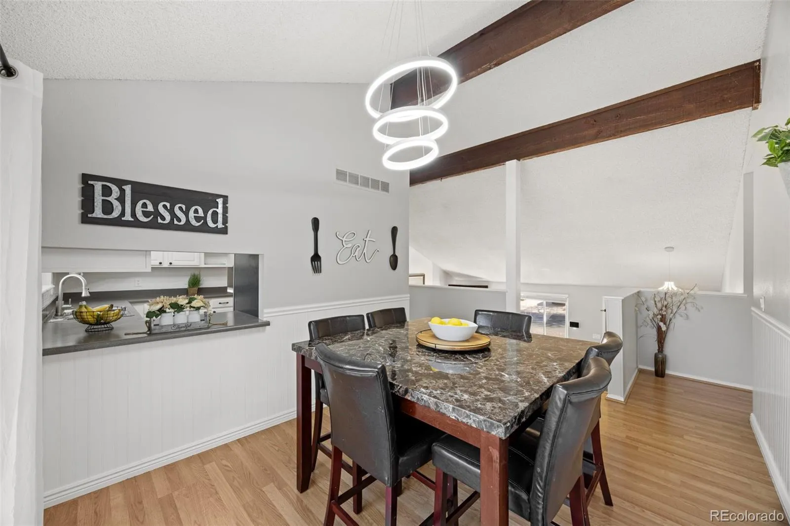 This updated 5-bedroom, 3-bath tri-level offers 2,390 square feet of thoughtfully designed living space. The main level feels open and airy with vaulted ceilings and wood beams that bring a modern farmhouse touch. New luxury plank flooring runs throughout, creating a clean, cohesive flow from room to room.