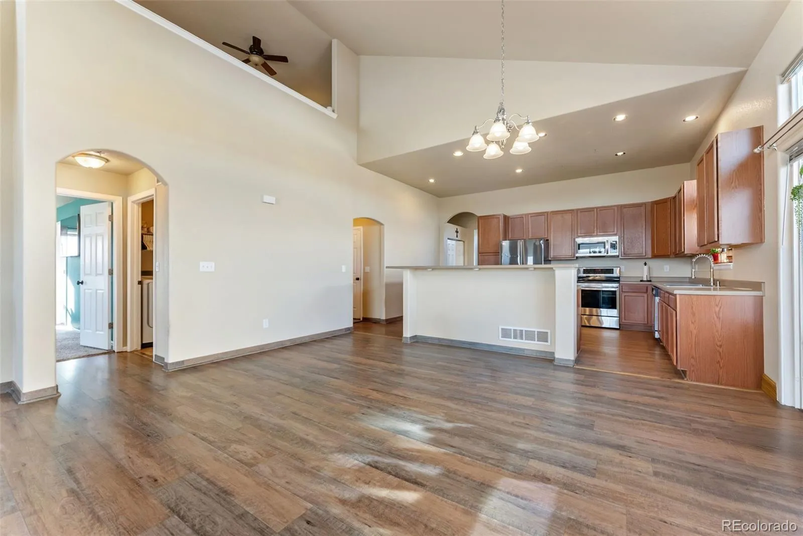Discover the charm and elegance of this 6-bedroom, 4-bath 2 story home with finished walk-out basement nestled in a scenic and amenity filled neighborhood with a large almost a quarter acre lot. Conveniently located close to restaurants, shopping, parks, golf, and Rec Centers. With its open floor plan, high ceilings, and abundant natural light, this home offers spacious living at its finest. As you step inside, you’ll notice the practically new LVP flooring and a spacious flex room that could be used as an office, formal dining or play room! The expansive kitchen catches your eye, with stainless steel appliances, and a large L-shaped island — perfect for gathering around and creating memories. The kitchen island and pantry provide ample storage and convenience, while the adjacent dining and living areas flow smoothly for easy entertaining. The main level master bedroom is a true sanctuary with ensuite bath featuring a spa shower, large soaking tub and a large walk-in closet, offering convenience and luxury. Conveniently placed the laundry room is right next to the master bedroom and basement access. Upstairs is a loft that overlooks the main level and two bedrooms and a full bathroom. Downstairs, the finished walk-out basement impresses with a large family room great for entertaining. Completing the basement is another full bathroom and an additional large three bedrooms. This beautiful home is located in the sought-after Falcon D49 school district, combining thoughtful design with practical upgrades such as central air conditioning, 2025 new roof and gutters, and a 2 car expanded garage. With every detail carefully considered, this home is ready for you to move in and start making it your own. Plus conveniently located for access to Peterson Space Force Base, Air Force Academy, Schriever Air Force Base, and Fort Carson Army base. Schedule your tour today to experience the beauty and comfort this home offers!