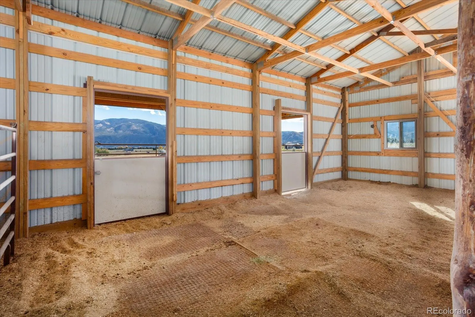 A 6-stall barn (54′ x 40′) with classic horse stall doors makes this property ideal for horses or flexible use. Inside, an elegant foyer welcomes you to an open, light-filled floor plan. The main-floor primary suite includes a spacious en-suite bath and a French-door room that’s perfect for an office or art studio.