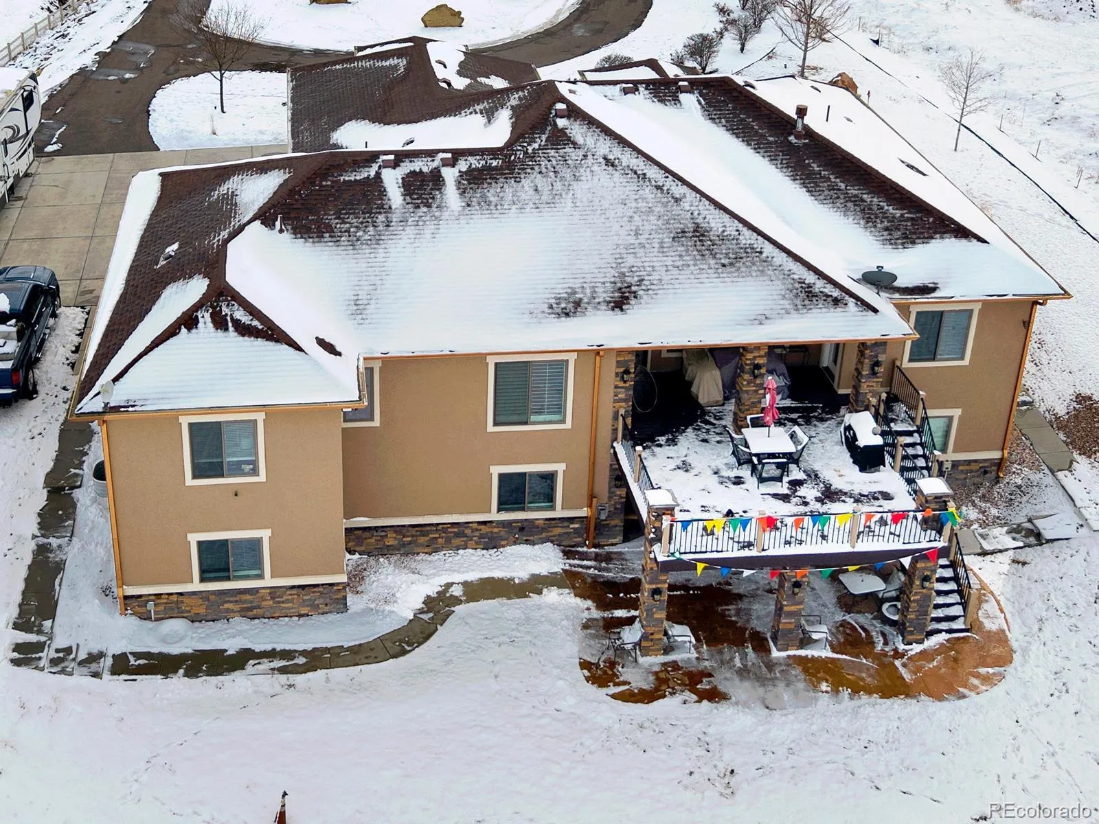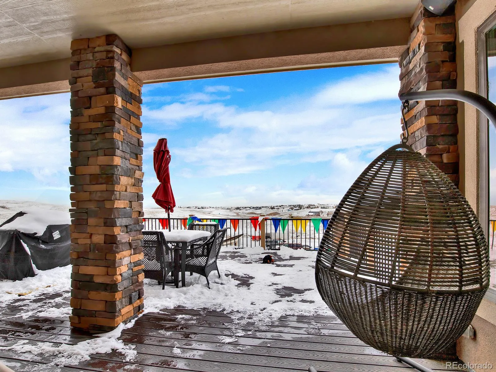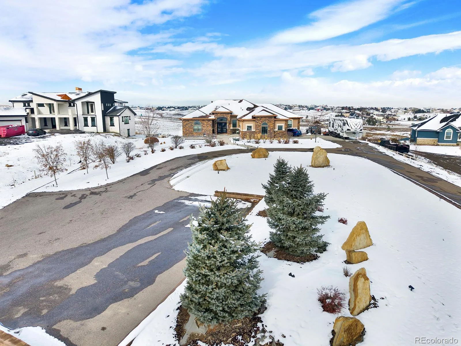 Set in an exclusive enclave of about fifteen homes, this remarkable ranch-style retreat offers nearly 6,000 sq ft of refined living with vaulted ceilings, two cozy fireplaces, and panoramic mountain views, all wrapped in low-maintenance zero-scape landscaping perfect for those who love to lock and go. The expansive circle driveway provides abundant guest parking, dedicated RV space, and hookups, along with a flat, prepped area ready for a future outbuilding to store toys and gear. Inside, a chef’s kitchen shines with stunning granite countertops and premium cabinetry, while the main-level primary suite offers private deck access for peaceful mornings. The walkout basement becomes the heart of entertainment with a 10-ft granite bar, full movie room, and a versatile dance-studio-turned-home-gym for fitness and creativity. Moments from Riverdale Dunes Golf Course and major commuter routes, this home delivers a lifestyle of space, comfort, and effortless Colorado living.