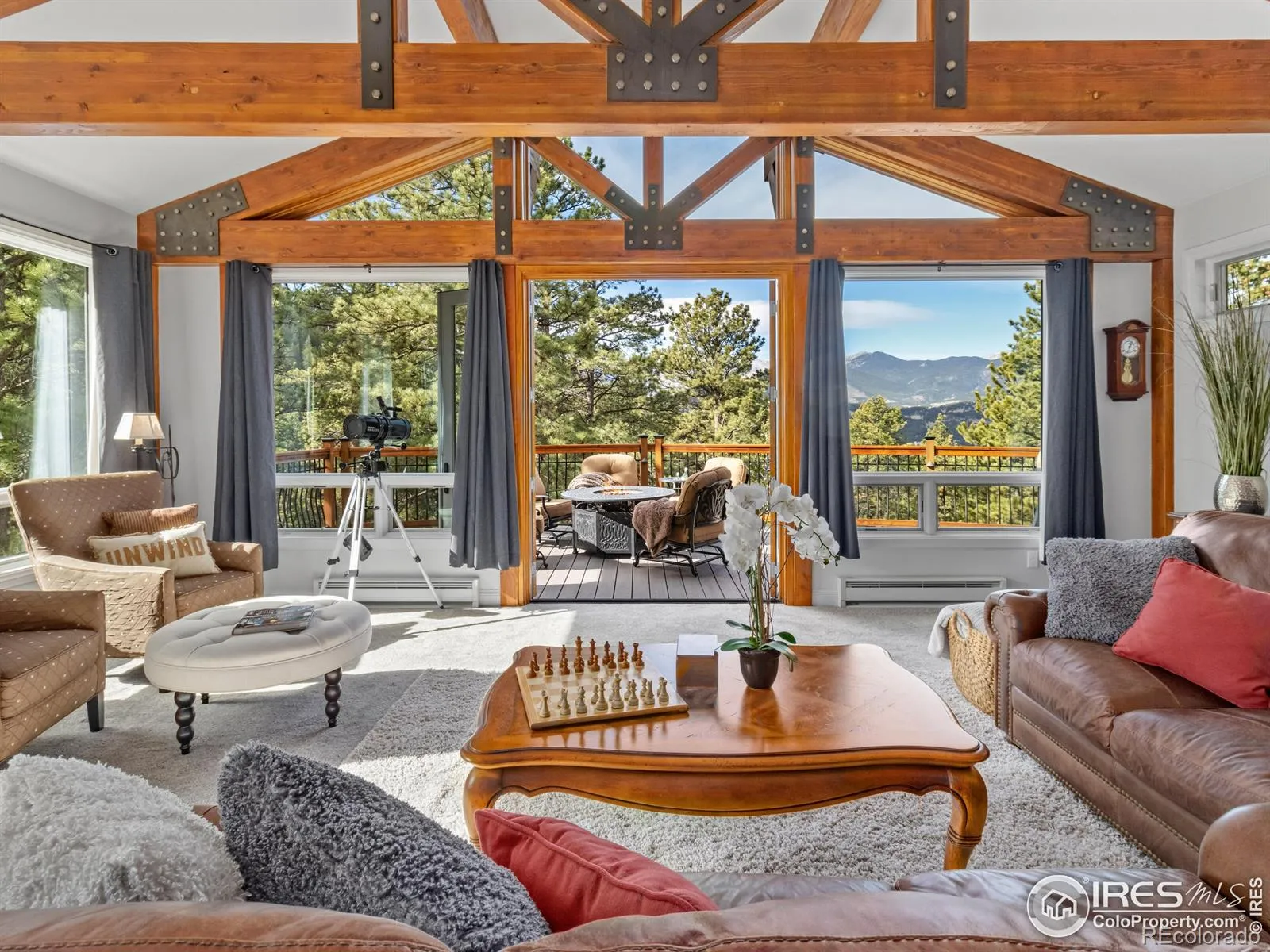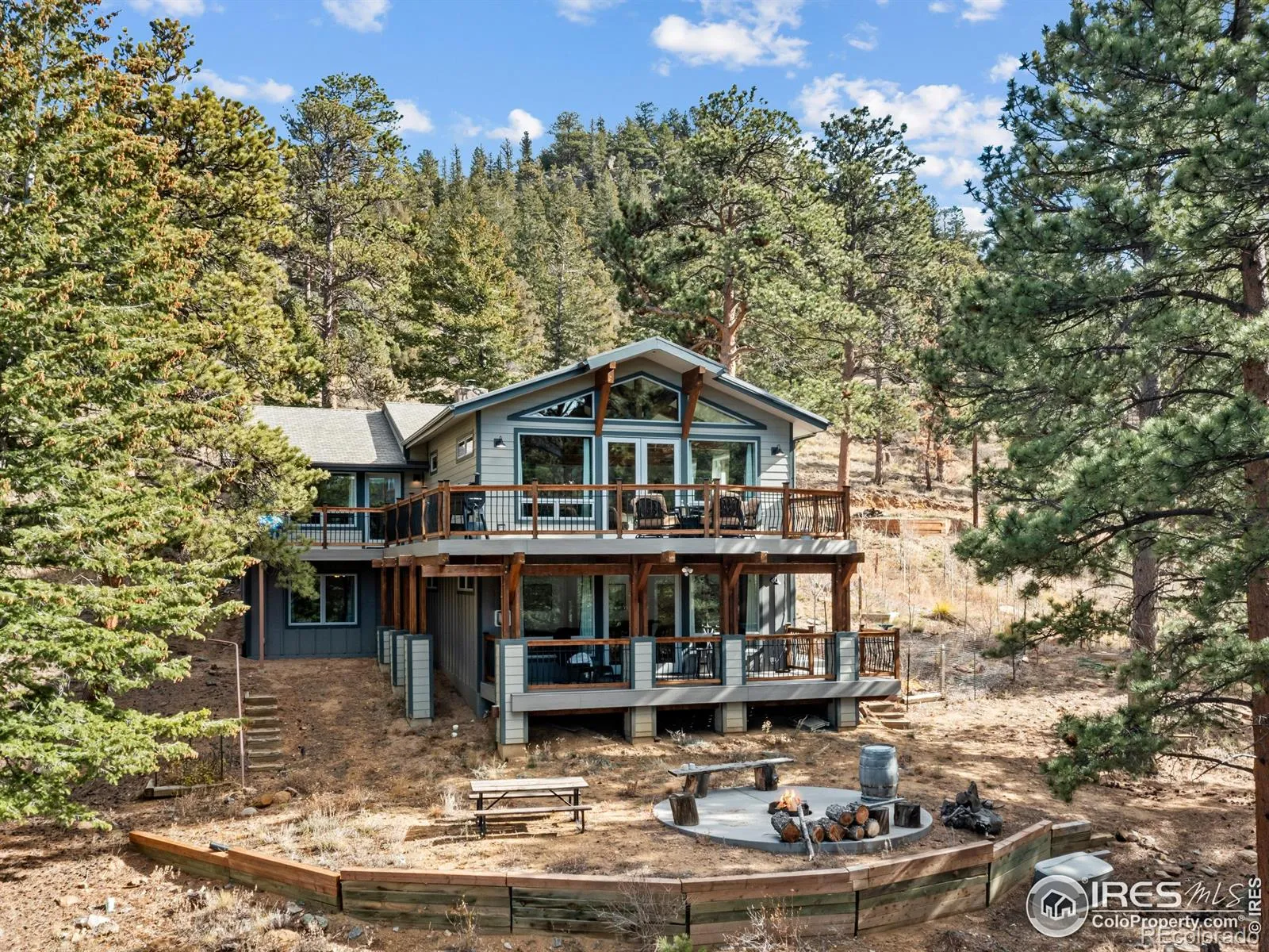 Set high above Estes Park with panoramic mountain views in every direction, this exceptional four-bedroom, three-bath retreat embodies the spirit of Estes itself-rooted in nature, crafted with heart, and designed for comfort in every season. From its architectural turret entry to its mountain-sourced stone fireplaces, the home balances rustic character with refined living and provides main floor living. Inside, a complete interior refresh showcases soft natural light through Pella UV-protected windows. The kitchen pairs GE Cafe and GE Profile appliances with Bianco Antico granite counters, Northern Star designer lighting, and abundant storage for effortless entertaining. Heated floors extend through the kitchen, baths, and hallways, creating quiet warmth year-round. The primary suite invites calm with a soaking tub and mountain views, while two laundry areas add convenience. Energy-smart upgrades include spray-foam insulation, a 50-gallon heat pump water heater, and a 1,000-gallon propane tank for lasting efficiency.Outdoors, nearly twenty acres unfold into open sky and evergreens-your own trailhead for hiking, wildlife, and sunrise views. The wrap-around Trex deck is made for gatherings around the firepit, with space beneath for a future jacuzzi. Hardie Board siding and Korten steel accents stand strong against the alpine elements, while the oversized garage with workshop and built-in dog run add everyday ease. Just minutes from Rocky Mountain National Park, downtown Estes, and Mary’s Lake, this is mountain living rooted deeply in place and built with genuine heart.