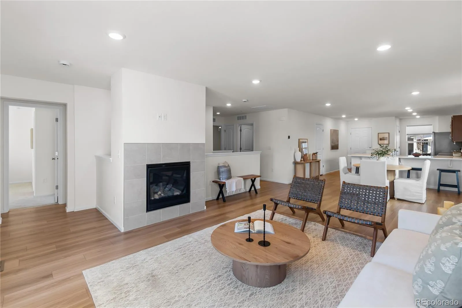 Built less than five years ago, this contemporary home offers an open-concept layout designed for today’s lifestyle. The bright, modern kitchen features quartz countertops, stainless steel appliances, and rich wood cabinetry—flowing seamlessly into the dining area and spacious living room, complete with a cozy gas fireplace. Large windows fill the space with natural light, creating a warm, inviting atmosphere.