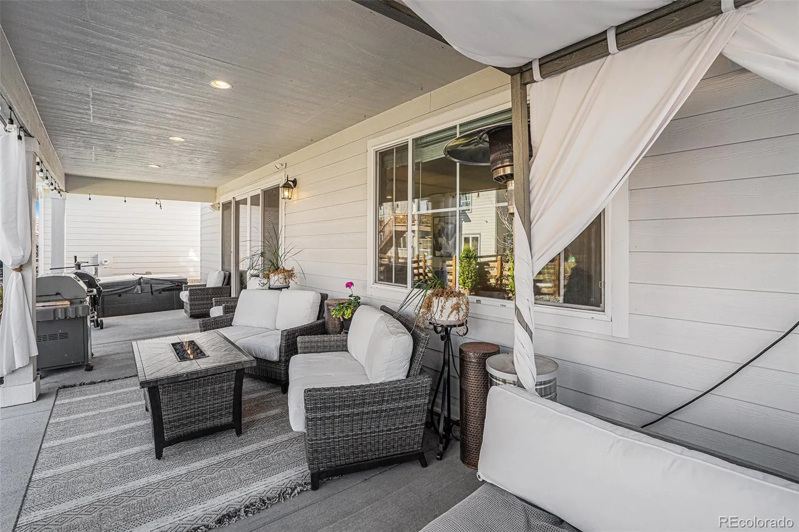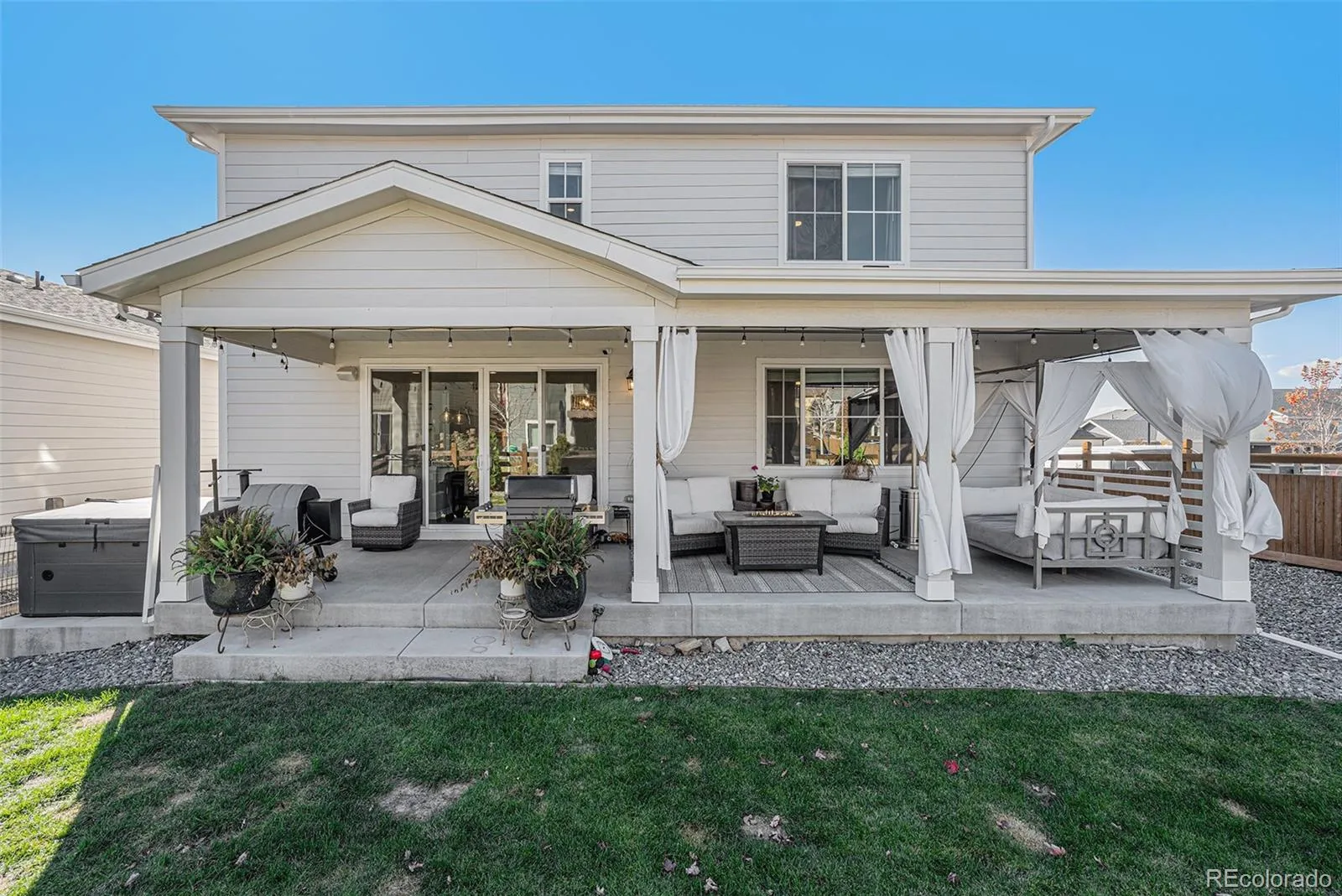 Wide-plank engineered wood floors lead through an open main level centered around a sleek linear fireplace and built-in surround sound — a space that draws people in. The expanded sliders open fully to a peaceful patio and beautifully landscaped yard, creating an easy connection between indoor comfort and outdoor relaxation.