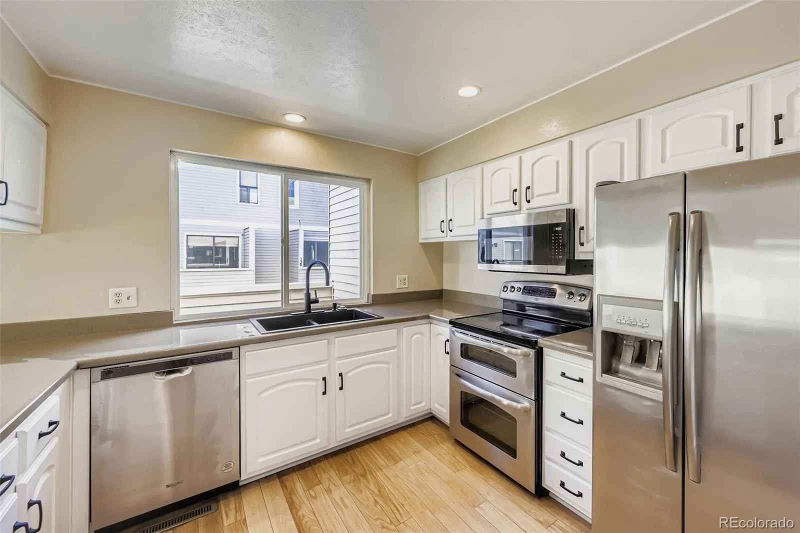 Don’t miss this 3 Bedroom, 2 1/2 bath condo with over 1700 finished square feet PLUS RARE tandem 3-car garage with room for that small 3rd car or toys! Awesome central location with shopping/bus line/highway nearby. Spacious living room with 2-story window wall (quality window shades to allow light in or not), cozy fireplace nook/reading space. Opens to outdoor space fenced patio. Handy nicely finished hall powder room, then updated kitchen w/silestone surface, engineered wood veneer flooring, new appliances and accesible laundry closet with washer/dryer and cabinets! Kitchen opens to oversized dining room with options for multiple use, plus there is a nice balcony space for morning coffee or hanging out! Upper level features large primary bedroom with its own 3/4 bath and walk-in closet. Additional 2 bedrooms have full hall bath and nice separation from primary suite. Beyond basement utility and storage room, the garage is great flex space for two cars plus a third small car/toys option. New AC Unit (condenser on roof). This unit is very livable as it is with nice kitchen and bath upgrades, or bring your future remodel ideas with you.