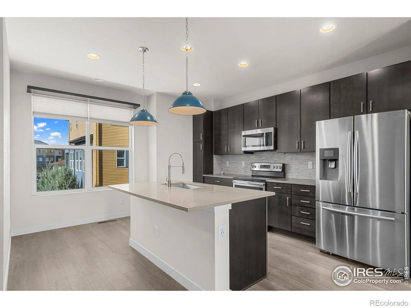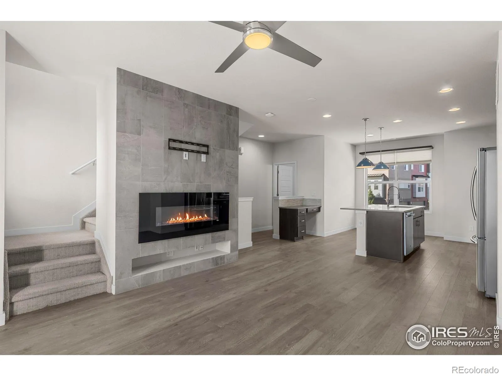 Discover effortless, modern living in this stylish and contemporary townhome nestled in the vibrant and sought-after Arista community in Broomfield. Ideally located just a short walk to Redpoint Community Park, and neighborhood dining, coffee spots, local brewery, and the transit at Arista Town Center, offering unparalleled convenience to both Boulder & Denver. Designed for comfort and ease, this beautifully maintained home perfectly blends low-maintenance living with sophisticated finishes and a convenient 2-car attached garage. Step inside to find an open-concept main-level living space with wide-plank grey-tone LVP flooring and abundant natural light. The inviting living room centers around a sleek, modern electric fireplace creating the perfect atmosphere for relaxing or entertaining. The adjoining kitchen showcases espresso cabinetry, quartz counters, stainless appliances, and an under mount sink. A large center island provides ample seating space, while a built-in desk nook offers a convenient area for work or study. A stylish powder bath completes the main floor. Upstairs, the spacious primary suite features a walk-in closet and private ensuite bath. The second bedroom is equally comfortable and sits adjacent to a full bathroom and laundry space with included stackable washer & dryer. Additional highlights include a covered balcony off the main-level living space, perfect for morning coffee or evening happy hours, and a covered front patio offers extra outdoor enjoyment. Enjoy a true “lock-and-leave” lifestyle and LOW HOA FEES in this desirable community with a dynamic mix of restaurants, shops, entertainment, and parks, all within walking distance. Easy access to Hwy 36 makes commuting to either Denver or Boulder effortless, from this low-maintenance, move-in ready home in a thriving community.