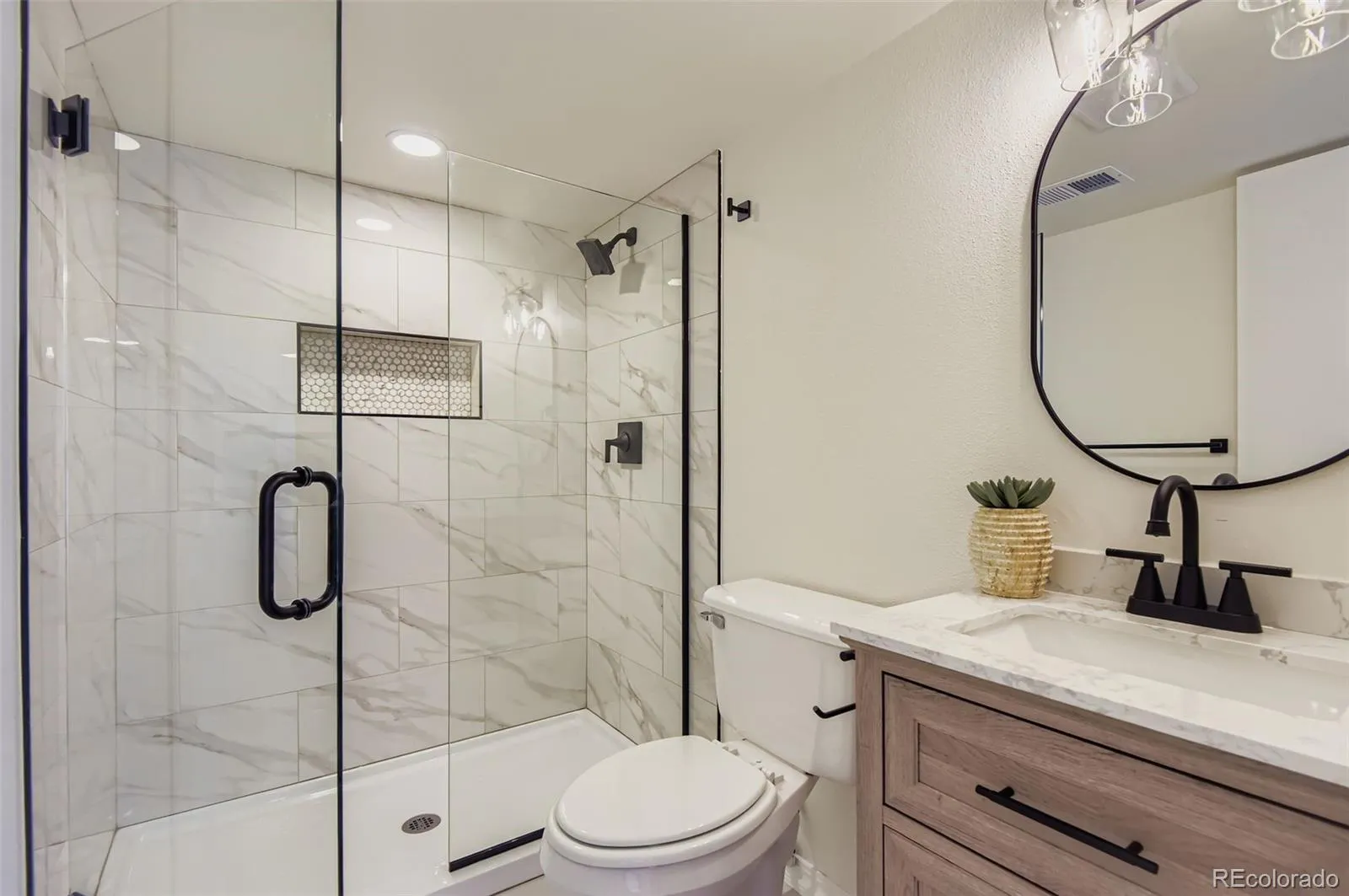 A fully updated walk out ranch perched on a hilltop in Greenwood South with views of DTC! New: paint interior, exterior, faux wood floors, carpet and light fixtures. This residence has three bedrooms, two bathrooms, laundry room, open family room, dining room and fireplace on the main floor. New kitchen cabinets, quartz countertops, and stainless steel appliances, highlight this open kitchen concept with peninsula island. Primary suite has new tile, 6 foot double vanity, plumbing fixtures, and a walk in closet. Large covered patio looks onto this double lot of over 19,000 square feet almost 1/2 acre. Extra off street parking perfect for RV or a boat. Two fireplaces one on the lower level has updated bathroom and new carpet. Lower level has 425 sqft storage room. Greenwood Village elementary school in the Cherry Creek school district.