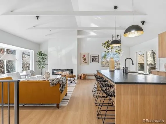 Modern Boulder Retreat on an Expansive Corner Lot with Mountain Views! Every inch of this Boulder home has been thoughtfully reimagined and rebuilt with designer precision. Nestled on an extra-large corner lot surrounded by mature trees, this property captures stunning mountain views and a true sense of Colorado serenity. Inside, soaring vaulted ceilings span the kitchen, family, and dining rooms, flooding the open layout with natural light. Every surface reflects quality and craftsmanship — a perfect blend of modern sophistication and warm organic texture.
