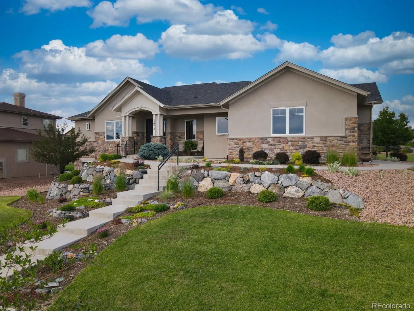 ***Custom Urban Farmhouse in Flying Horse – Rare Opportunity Under $1M*** Experience the rare chance to own the only true custom home in the prestigious Flying Horse community priced under $1 million. Unlike nearby ranch-style homes built from standard plans, this Urban Farmhouse-style ranch was individually designed & constructed with a one-of-a-kind vision, premium finishes & uncompromising attention to detail. Set on a beautifully landscaped corner lot, the home’s inviting covered front porch captures breathtaking Pikes Peak views—and even offers a front-row seat to Flying Horse’s 4th of July fireworks! Inside, enjoy a warm & balanced environment thanks to whole-house in-floor radiant heat, keeping every room evenly comfortable while maintaining low utility costs. The main level impresses with 10-ft ceilings, engineered hardwood floors, and a welcoming living room featuring custom Eden Oaks built-ins and a stone fireplace. The chef’s kitchen is an entertainer’s dream—featuring custom cabinetry, a massive 9’×13′ leathered granite island, level-6 granite countertops, a Sub-Zero refrigerator, convection microwave, and a built-in coffee bar. A roomy butler’s pantry with quartz counters and extensive storage adds both beauty and practicality. The primary suite a retreat w/ plantation shutters, a spa-inspired ensuite & a custom walk-in closet. A dining area, private office with sliding barn door, powder bath & laundry room complete the main level. Fully finished basement expands your living space with a large family room (pre-plumbed & wired for your future wet bar), a full bath & multiple bedroom suites—including an ensuite with walk-in closet, another with LVP flooring & a secondary suite with its own sitting nook & three-quarter bath. Additional highlights: • Class IV composite shingle roof • Insulated 3-car garage • 8-ft interior doors throughout • Central vacuum system • Low HOA fees • Proximity to Flying Horse parks, trails, and amenities!