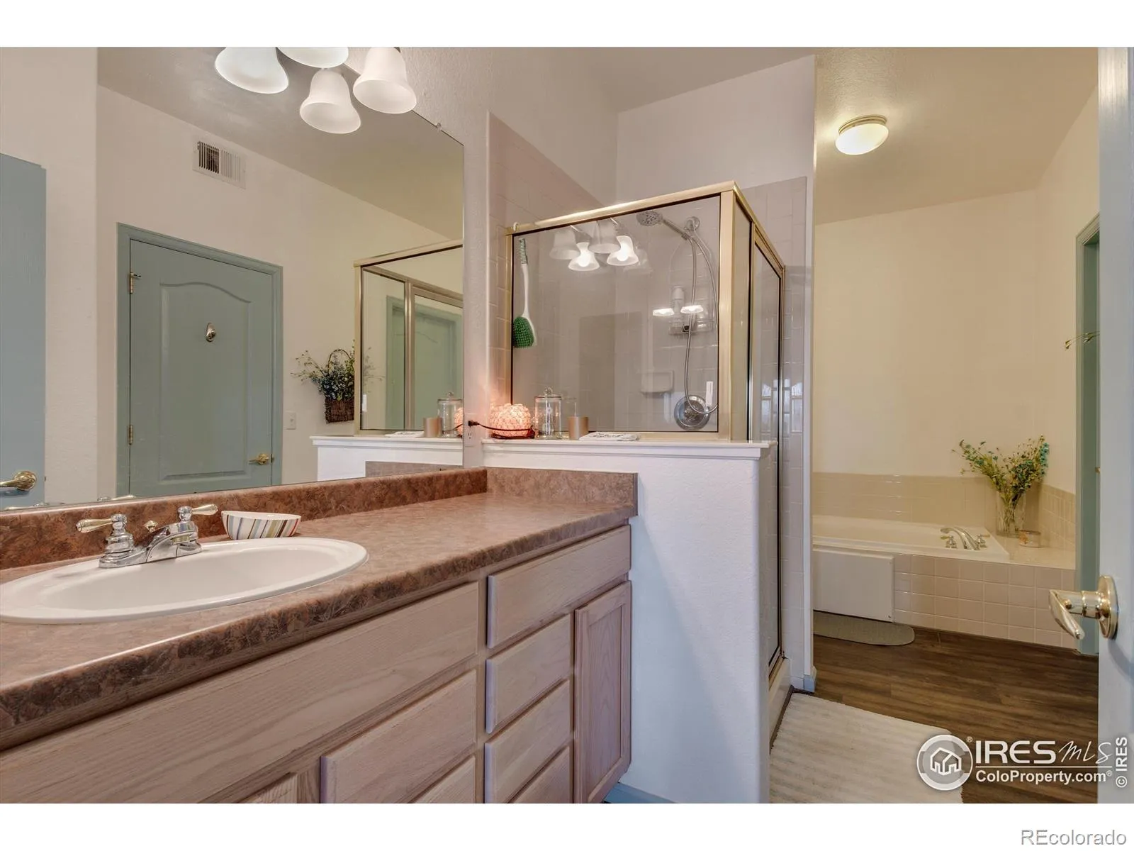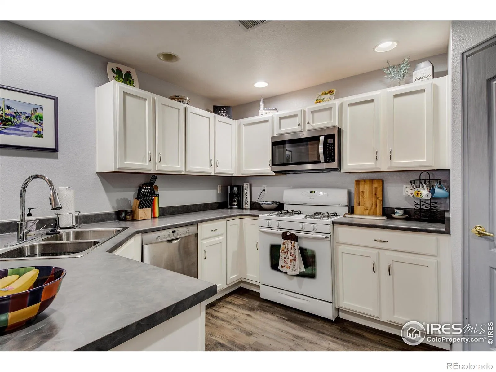 GREAT OPPORTUNITY to own upgraded 1-bedroom condo in coveted Sonoma Village at Ute Creek! Beautiful manufactured wood floors, remodeled kitchen with new counters and appliances, 5-pc primary bath w/jetted tub. Walk-in closet. Spacious primary bedroom and open living room with access to large covered balcony. Washer/dryer hookups. Vaulted ceilings. Private entrance and detached 1-car garage. Separate storage area. Fully landscaped courtyard to enjoy walking, sitting and recreation.