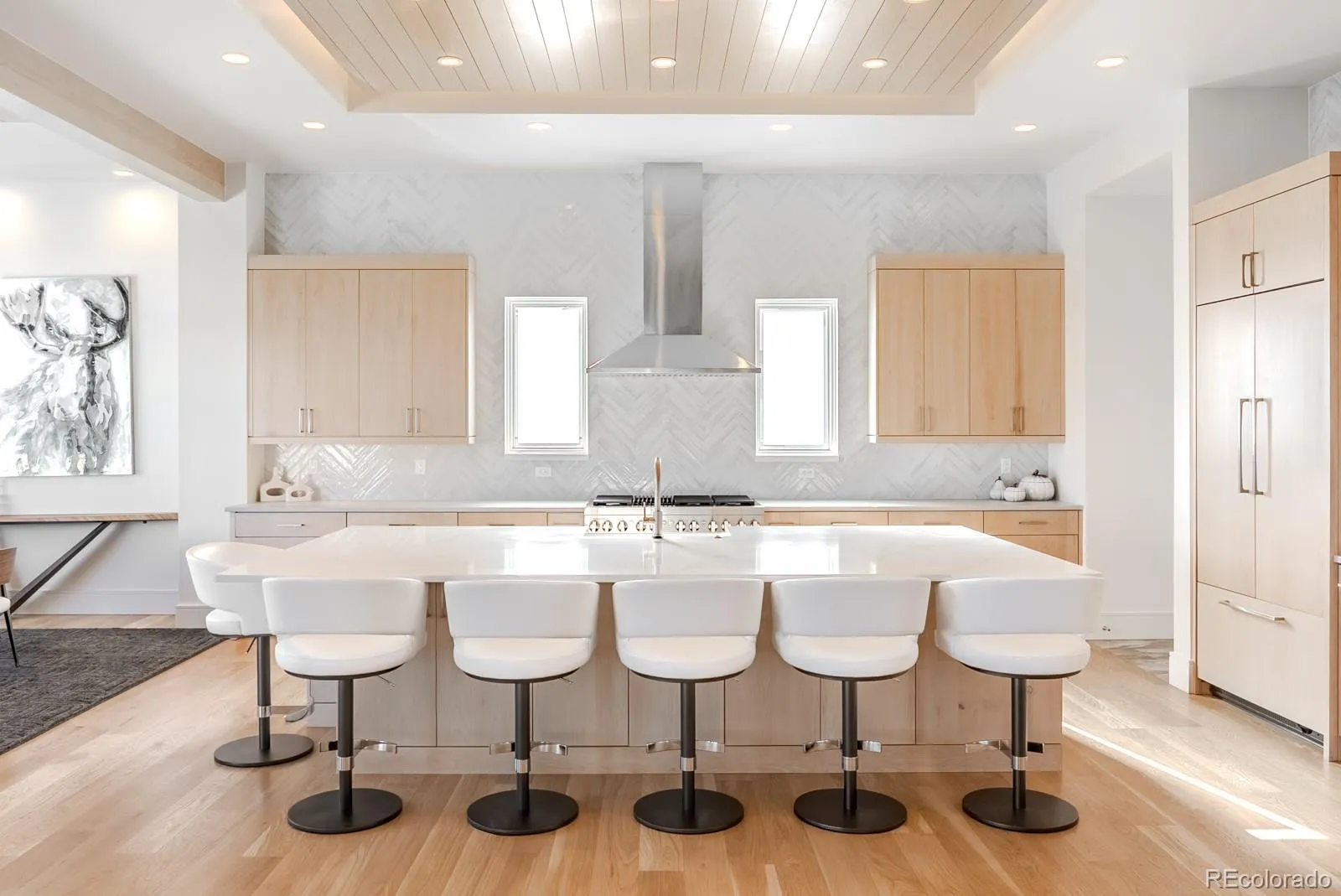 Privately elevated above the 12th and 15th fairways of the award-winning Ravenna Golf Club, this contemporary ranch estate commands an irreplaceable panorama of emerald greens undulating toward sparkling ponds, framed by dramatic red-rock formations and the Front Range beyond. Behind Ravenna’s gates lies an elevated lifestyle of wellness, social connection and refined luxury where fine dining, fitness and nature exist in perfect harmony. An architectural statement, the modern façade fuses smooth stucco planes, limestone accents and linear rooflines for a composition both contemporary and timeless. Inside, white oak floors lead through voluminous sun-filled spaces where light and clean lines converge in sophisticated balance. The great room rises twenty feet beneath beamed ceilings and clerestory windows anchored by a sleek fireplace and wall of glass opening to a vast terrace overlooking the golf course and mountains. The kitchen presents as a culinary studio blending an ethereal palette with design precision, featuring a floating white-oak drop ceiling, eleven-foot quartz island, a suite of professional-grade appliances and a wet bar seamlessly connecting to the great room for effortless entertaining. The dining area, office and dramatic powder bath each continue the theme of artistry and polish. The primary suite is a sanctuary of calm with terrace access and breathtaking views, complemented by a spa bath with freestanding tub, poured-concrete vanities and boutique-style dressing closet. A statement staircase guides to the walk out lower level—a world of leisure with a billiards and media lounge, flagstone fireplace and a luminous back-lit quartzite bar with an impressive wine column. Three bedroom suites and a rejuvenating dry sauna room complete the level. Outside, over $100,000 in new landscaping introduces a lush lawn, cascading terraced gardens and a full-length patio offering multiple destinations for gathering and savoring the home’s spectacular setting.