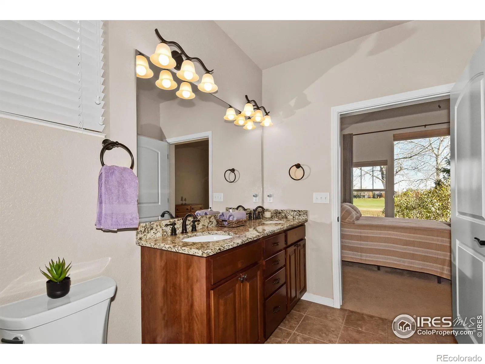 This stunning, impeccably maintained home backing to Ute Creek Golf Course is sure to impress! From the moment you step onto the inviting front covered patio & through the grand eight-foot entry door, you’ll be captivated by the quality and thoughtful upgrades throughout. Beautiful hickory-engineered hardwood flooring spans much of the main level, where you’ll find a striking staircase to one side and a bright home office to the other. The gourmet kitchen is a true showpiece, featuring granite countertops, a spacious center island, and premium Gold Series stainless steel appliances. Additional highlights include under-cabinet lighting, abundant cabinetry w/soft-close drawers, & generous double-door pantry. The open-concept layout seamlessly connects the kitchen to the living room, making it easy to cook and entertain at the same time. The living area features vaulted ceilings, large east-facing windows, ceiling fan, and pre-wiring for surround sound – perfect for relaxing or hosting guests. You’ll appreciate thoughtful details: Hunter Douglas blinds, tiled flooring in all baths & laundry, brushed bronze fixtures and hardware. The primary suite is equally impressive, with vaulted ceilings, large windows, a ceiling fan, and a luxurious en suite bath complete with a granite dual-sink vanity, tile-surround shower with bench, and a spacious walk-in closet. A stylish half bath with granite vanity and the main-level laundry add convenience. Downstairs, the expansive lower level offers a large family room with recessed lighting, surround sound speakers, and concrete egress window wells. You’ll also find a comfortable second bedroom, a beautifully finished three-quarter bath with tile surround, and a flexible storage or hobby space.