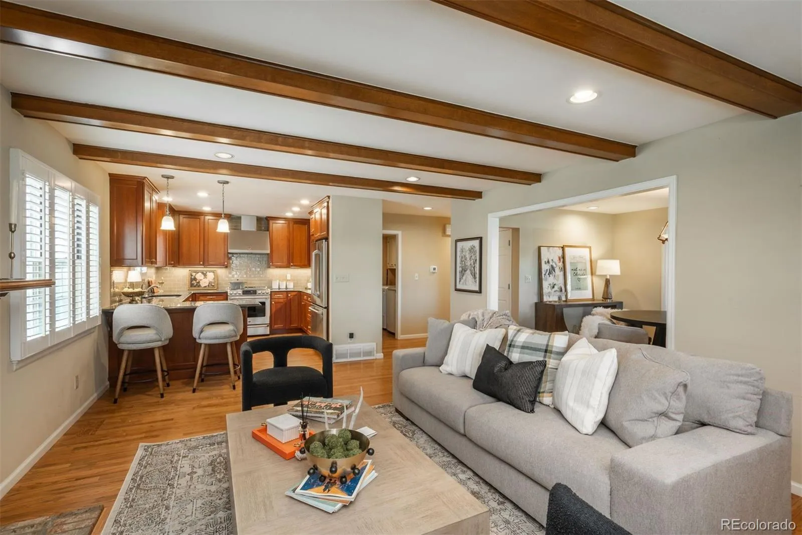 Welcome home to this warm, spacious townhome tucked away in the heart of Centennial. Nestled on a quiet, tree-lined cul-de-sac in the highly sought-after Homestead Village II community, this residence offers comfort, style, and convenience. Step inside to a bright, airy foyer where natural light pours in and hardwood floors set a welcoming tone. The formal living room invites you to relax and unwind, flowing effortlessly into a dedicated dining area ideal for gathering with family and friends. The adjoining family room feels both cozy and stylish with charming wood beams and a gas fireplace that becomes the home’s heart on cooler evenings. The upgraded gourmet kitchen will delight any home cook with custom cabinetry, high-end stainless steel appliances, gleaming granite countertops, and a breakfast bar perfect for morning coffee or casual meals. A convenient laundry room, powder bath, and access to a large covered balcony complete the main level, providing a peaceful outdoor retreat. Upstairs, the oversized primary suite offers a true getaway with a generous sitting area, walk-in closet, and beautifully updated five-piece bath featuring a walk-in tub for ultimate relaxation. A spacious second bedroom and upgraded ¾ bath accommodate guests comfortably, while the landing provides the perfect nook for a desk or quiet office. The walk-out lower level adds versatility with a generous recreation room ideal for movie nights, game days, or a play space. A third bedroom, full bath, and semi-finished flex room offer endless options for a gym, workshop, or office. Step outside to a large covered patio for year-round enjoyment. Near scenic parks, trails, and Little Dry Creek, you’ll love exploring the outdoors just moments from your door. With nearby shopping, dining, entertainment, and easy access to DTC and I-25, everyday living and commuting are a breeze.