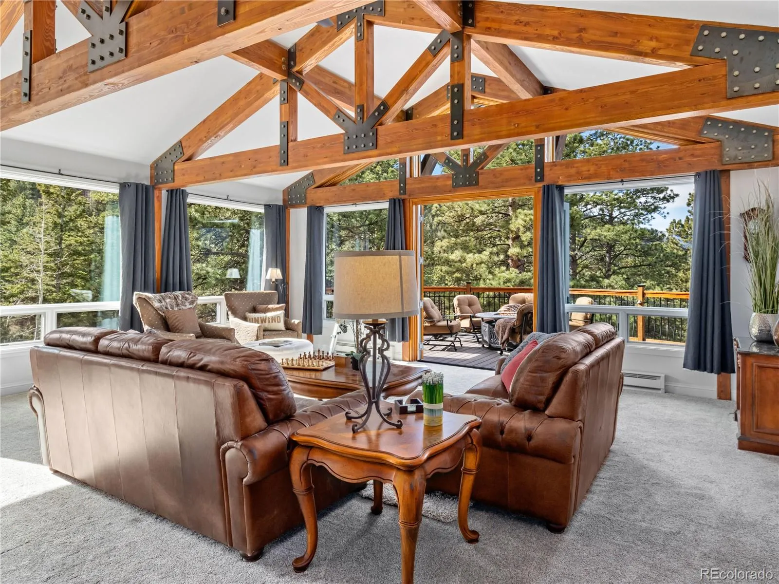 Set high above Estes Park with panoramic mountain views in every direction, this exceptional four-bedroom, three-bath retreat embodies the spirit of Estes itself-rooted in nature, crafted with heart, and designed for comfort in every season. From its architectural turret entry to its mountain-sourced stone fireplaces, the home balances rustic character with refined living and provides main floor living. Inside, a complete interior refresh showcases soft natural light through Pella UV-protected windows. The kitchen pairs GE Cafe and GE Profile appliances with Bianco Antico granite counters, Northern Star designer lighting, and abundant storage for effortless entertaining. Heated floors extend through the kitchen, baths, and hallways, creating quiet warmth year-round. The primary suite invites calm with a soaking tub and mountain views, while two laundry areas add convenience. Energy-smart upgrades include spray-foam insulation, a 50-gallon heat pump water heater, and a 1,000-gallon propane tank for lasting efficiency.Outdoors, nearly twenty acres unfold into open sky and evergreens-your own trailhead for hiking, wildlife, and sunrise views. The wrap-around Trex deck is made for gatherings around the firepit, with space beneath for a future jacuzzi. Hardie Board siding and Korten steel accents stand strong against the alpine elements, while the oversized garage with workshop and built-in dog run add everyday ease. Just minutes from Rocky Mountain National Park, downtown Estes, and Mary’s Lake, this is mountain living rooted deeply in place and built with genuine heart.
