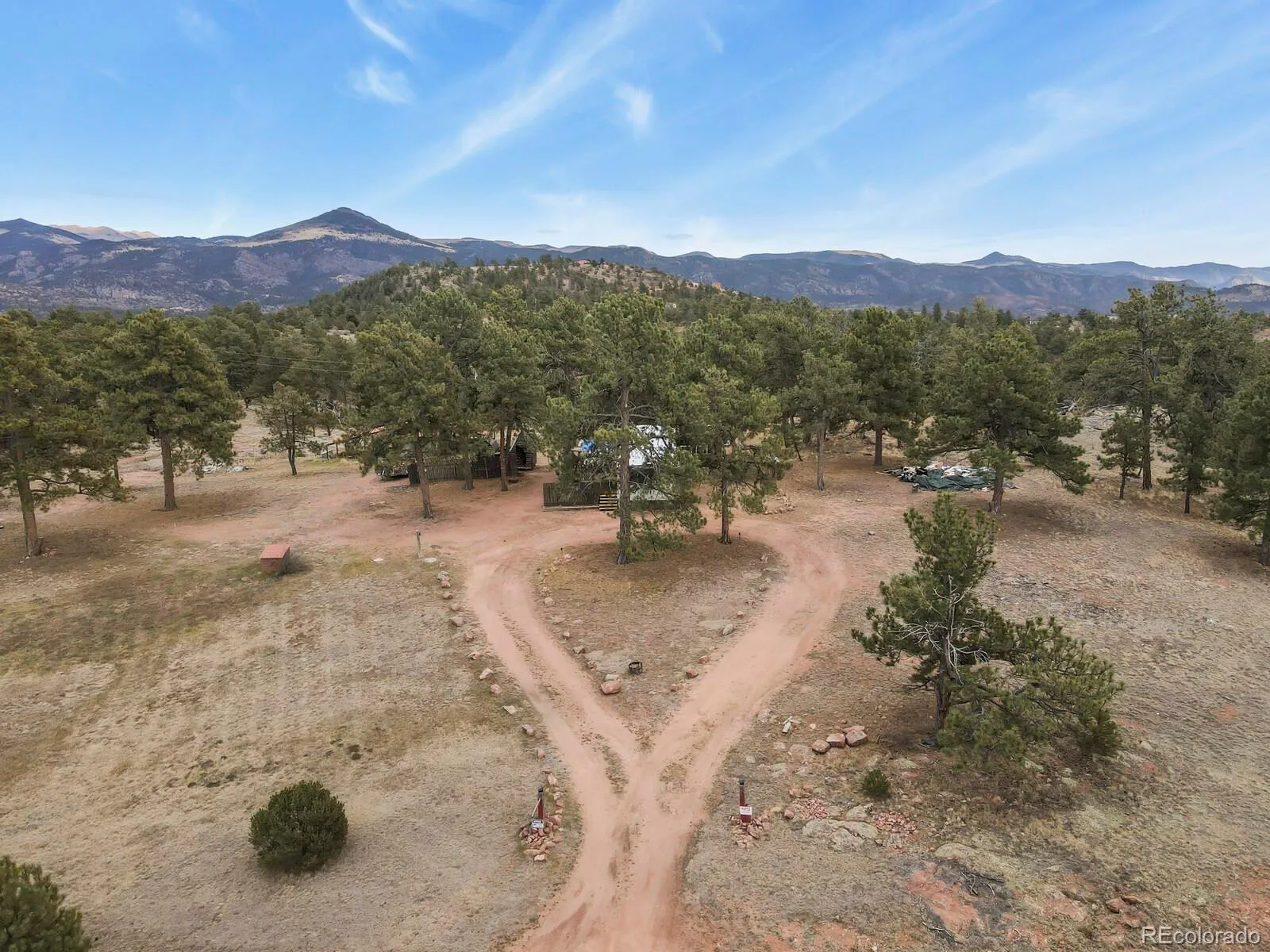 Your Colorado mountain retreat awaits! Nestled on two beautiful acres with a gentle mountain backdrop (and a Pikes Peak view!), natural rock outcroppings, and peaceful surroundings, this inviting home blends updated comfort with a true sense of simplicity and ease. The home has been mostly updated and comes with some furnishings and housewares so you can move right in and start enjoying mountain life. The kitchen offers stainless steel appliances, refreshed cabinets and countertops, and a kitchen island with a pot rack. The wood burning stove for chilly mountain evenings comes with wood to get you started. There are two bedrooms and one full bath, wood floors, as well as a top-notch whole-house water softener and filtration system. Outdoors, relax on the covered deck, take in the fresh mountain air, or explore your two acres of peaceful land accented by trees and rock outcroppings. You’ll love the three carports, storage sheds, and circular driveway with easy access and plenty of parking. No HOA means the freedom to create your mountain lifestyle your way—whether full-time living, a weekend getaway, or a furnished rental opportunity. Come see the view, feel the peace, and make this affordable mountain gem your own.