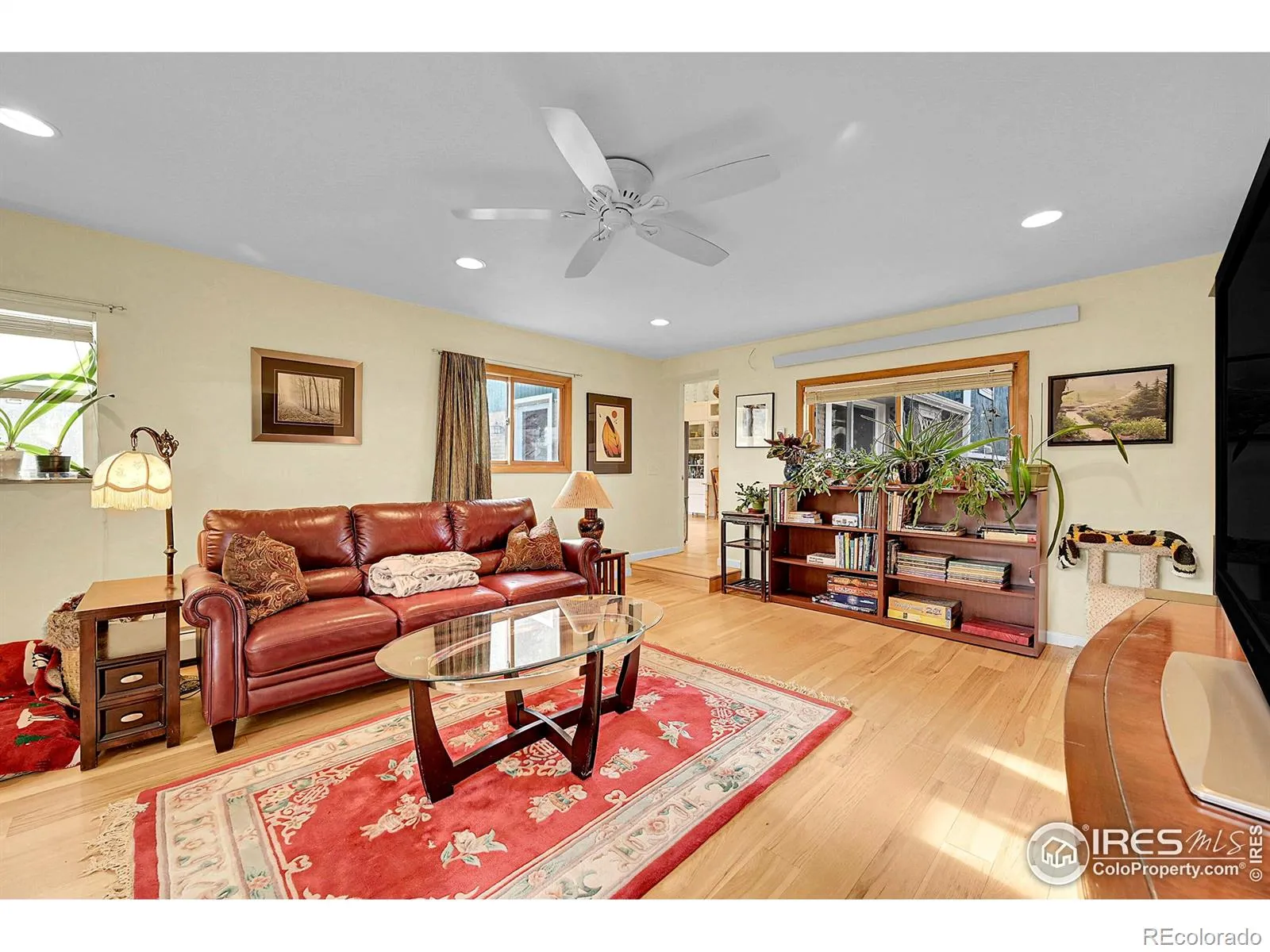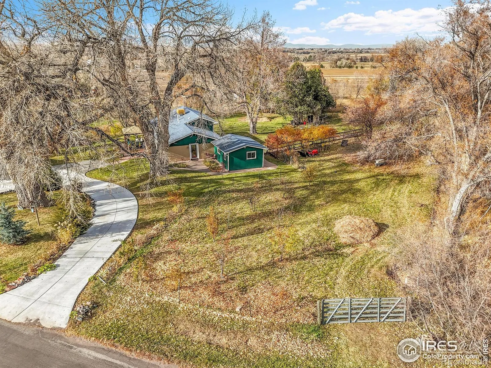 Country serenity meets contemporary comfort in this beautifully reimagined retreat just minutes from town. A new circular drive framed by mature trees and lush landscaping sets a friendly tone as you arrive. Fresh paint and owned solar panels enhance both the home’s aesthetics and efficiency. The inviting front porch, shaded by a pergola, is the perfect place to enjoy golden Colorado evenings in the quiet setting. Inside, soaring ceilings, a statement rock wall, and a wood-burning stove create a sense of rustic elegance in the living room. The updated eat-in kitchen impresses with premium appliances, generous pantry storage, and vaulted ceilings, while the bright dining area opens to a patio made for effortless indoor-outdoor entertaining. The private lower-level primary suite feels like a sanctuary with pastoral views, a sitting area, walk-in closet, and convenient laundry. Upstairs, two additional bedrooms and a versatile bonus room offer flexible living-ideal for a home office or creative studio. Set on a picturesque lot with mountain vistas, this property is a dream for nature lovers and hobby farmers alike, featuring a fenced yard, orchard, pasture, chicken coop, and two-stall barn. A rare opportunity to enjoy refined country living without sacrificing proximity to everything you love.