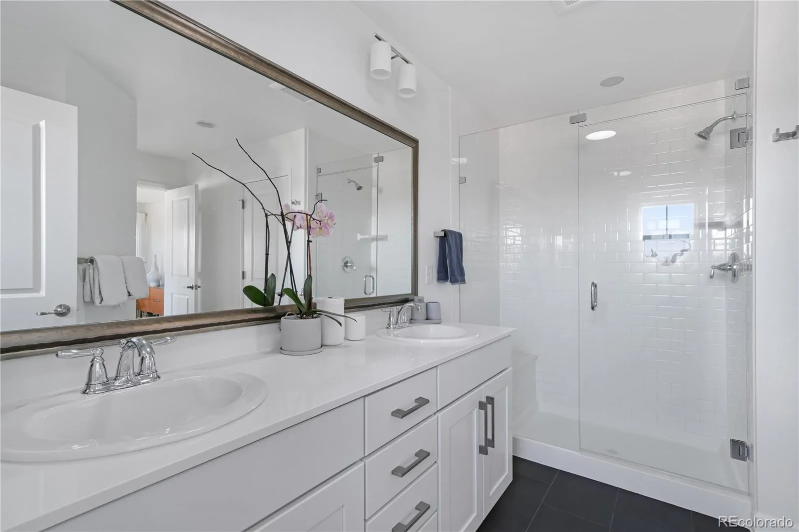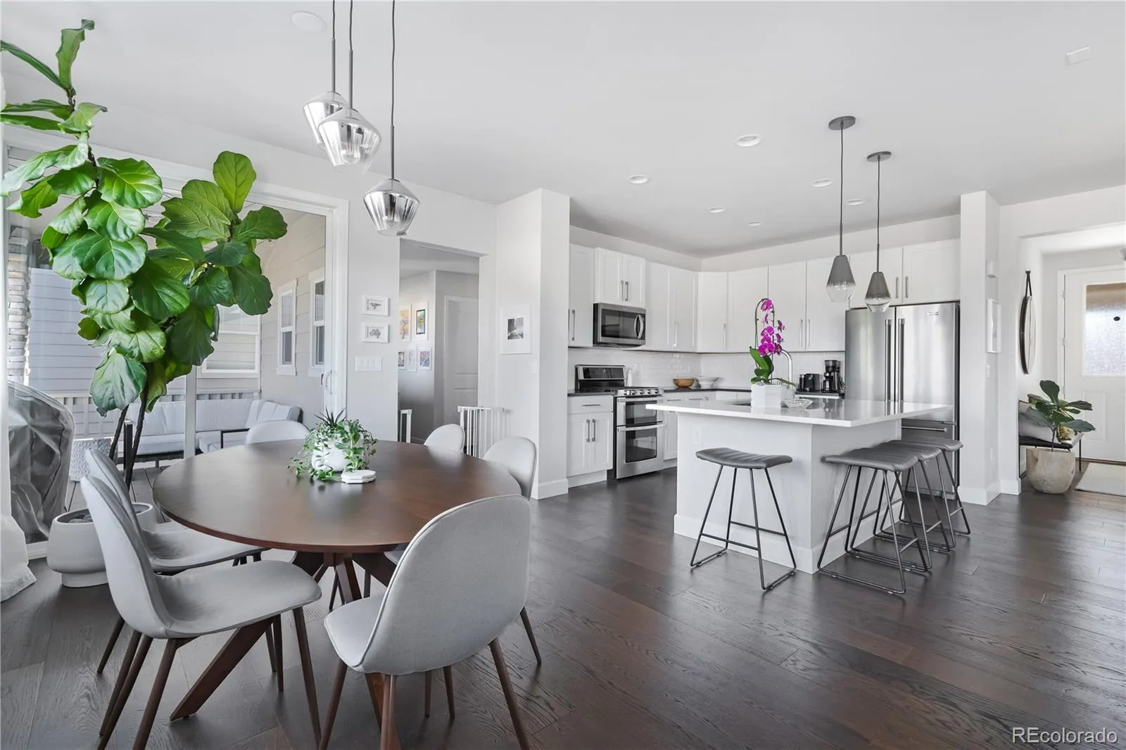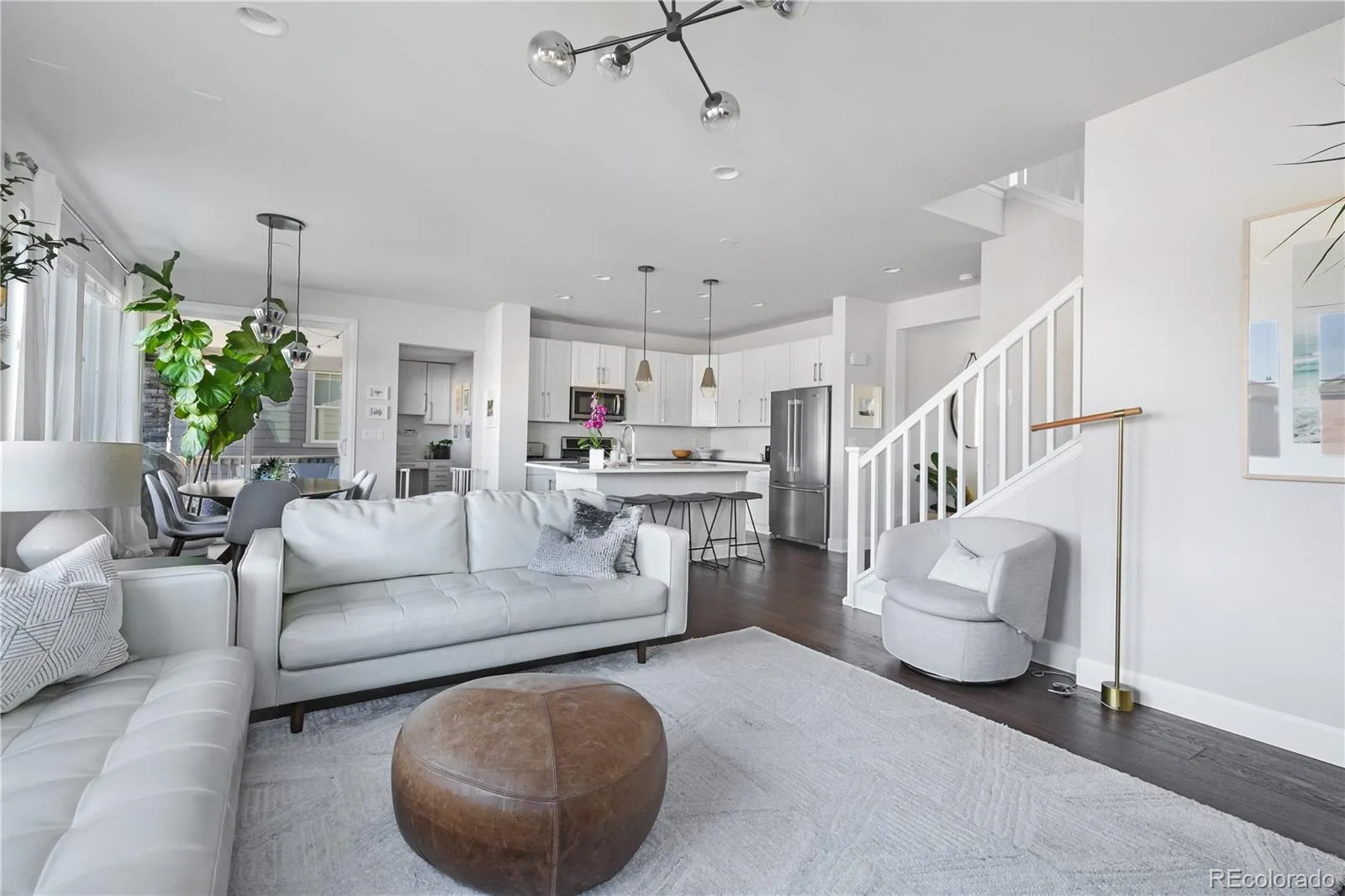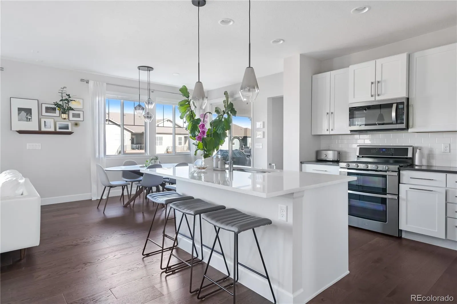 www.15551W49th.com – Discover the perfect blend of modern convenience and Colorado’s natural beauty in this stunning home, ideally situated in the sought-after Gardens at Table Mountain neighborhood in Golden. Situated on a private drive, this residence offers designer finishes, an open floor plan, elevated ceilings, abundant natural light, and views of North Table Mountain. A private office with French doors provides the ideal work-from-home space, while a discreet powder room is tucked off the entryway. The bright and inviting living room flows seamlessly into a gourmet kitchen, complete with a large center island with seating for four, stainless steel appliances including a gas range and French door refrigerator, white shaker cabinetry, timeless subway tile, and elegant quartz countertops. The dining area is adjacent to a covered Trex-style deck that leads to a newer patio and beautifully landscaped, low-maintenance backyard—perfect for outdoor dining & entertaining. Conveniently located off the kitchen, the mudroom includes a built-in office to provide everyday functionality and effortless flow. Upstairs, the spacious primary suite captures mountain views and features a spa-like bathroom with dual sinks, a frameless glass shower, and a generous walk-in closet. Two additional bedrooms, a full bath, and a dedicated laundry room with custom shelving & cabinetry complete the upper level. The garden-level basement, finished in ‘21, offers flexible living with a bright family room, fourth conforming bedroom, stylish ¾ bath, and a flex space currently used as a home gym. The custom bar with floating shelves and beverage fridge makes it an entertainer’s dream. Enjoy community amenities including a pool, multiple parks, trails, and open space—all within easy reach of top-rated schools, downtown Golden’s shops and restaurants, and nearby hiking and biking trails. Quick access to major highways ensures effortless commutes and weekend adventures alike.