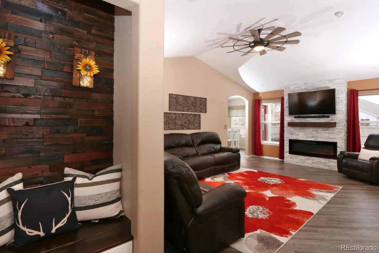Step inside to discover sun-drenched rooms featuring vaulted ceilings that enhance the spacious feel of the home. The home has a thoughtful and inviting layout. Recent updates include a stunning rock wall with electric fireplace, wood mantle and space for a TV mount, luxury vinyl flooring and a kitchen remodel that boasts elegant quartz countertops, glass tile backsplash and modern appliances, ensuring both style and functionality for culinary enthusiasts.