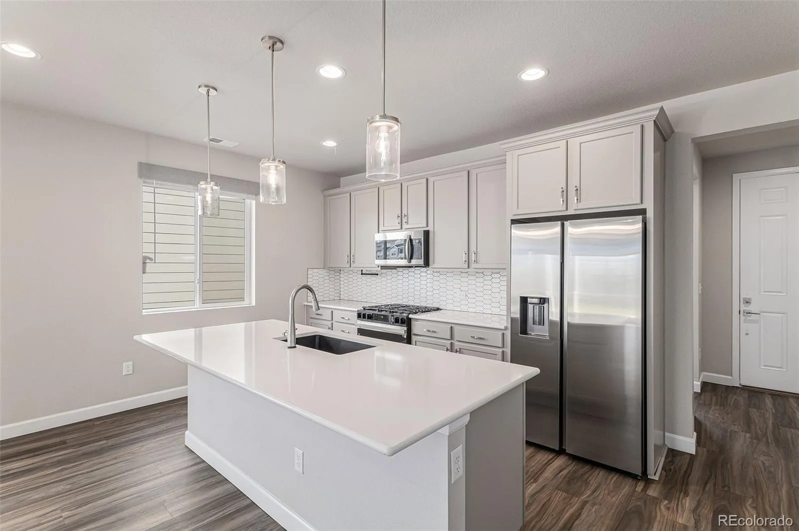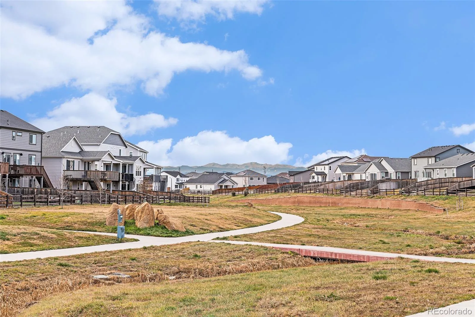 Welcome to this beautifully maintained 3-bedroom, 2-bath ranch-style home, perfectly situated on a greenbelt with stunning mountain views! Bright and inviting, the open-concept design is ideal for today’s lifestyle. The modern kitchen features brand-new Samsung stainless steel appliances, including a gas range, plus a spacious island, large pantry, and abundant cabinet space. The living and dining areas flow seamlessly together, creating a perfect setting for both everyday living and entertaining. The generous primary suite offers a private retreat with a stylish bath featuring designer tile finishes and a walk-in closet. Two additional bedrooms provide flexible options for family, guests, or hobbies, with a sleek secondary bath conveniently nearby. A non conforming 4th bedroom/office space near the front entry provides a quiet, functional workspace or 4th bedroom, and the large laundry room is thoughtfully positioned for easy access. Enjoy Colorado living at its best in the fully fenced backyard, which backs to the walking path and greenbelt and showcases a large covered patio—ideal for grilling with a natural gas line, gathering, or simply relaxing while taking in the mountain views. Additional highlights include a 2-car garage with ample storage and all the benefits of the Sky Ranch community, including parks and scenic walking trails. With convenient access to E-470, I-70, and DIA, this move-in-ready home offers the perfect blend of style, comfort, and location.
