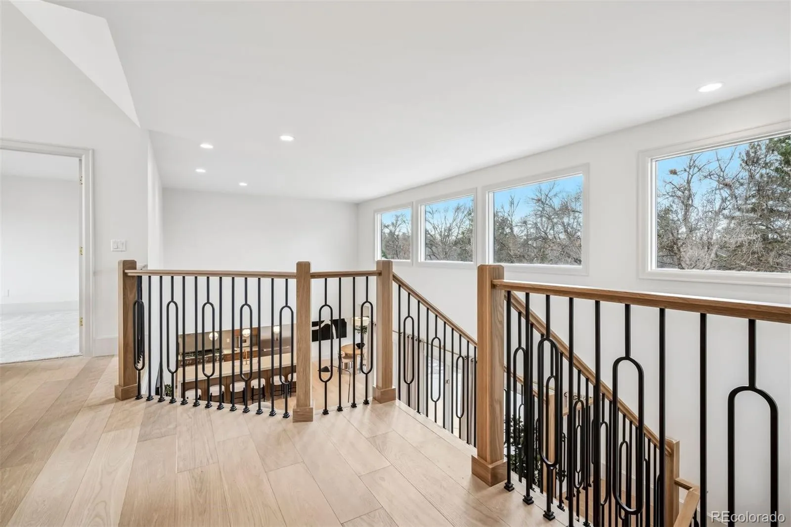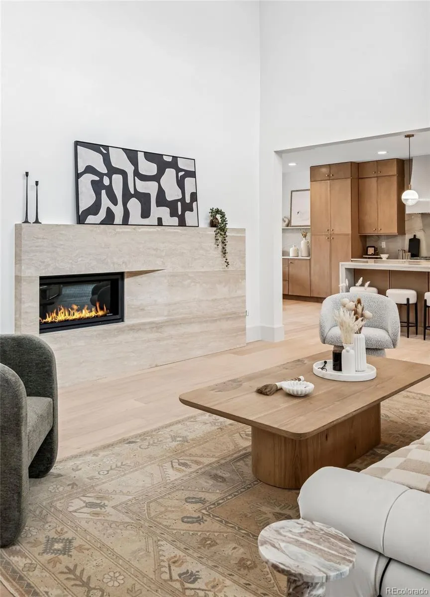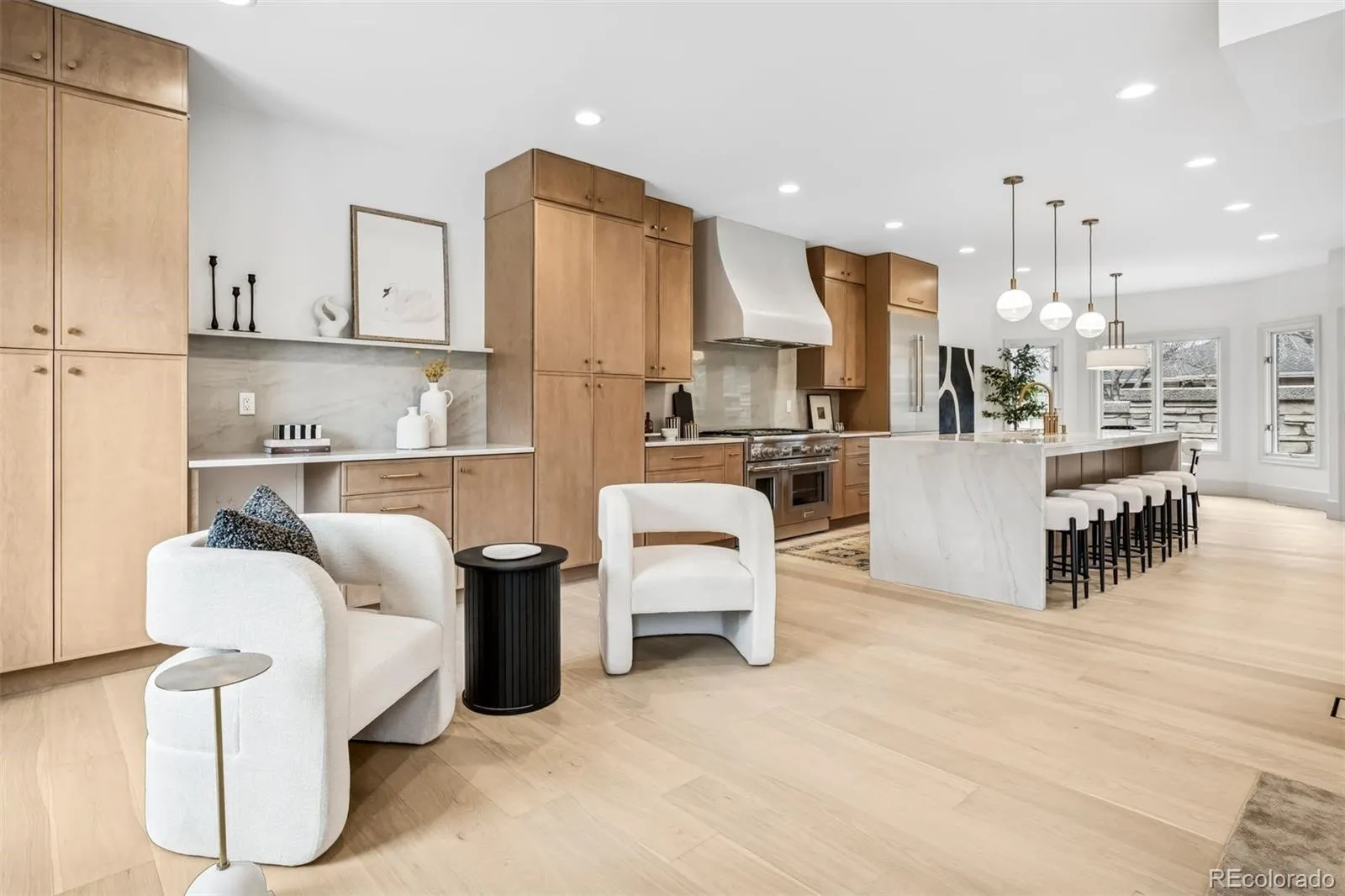 Located within the private gated community of Hyde Park, this newly remodeled home exemplifies sophisticated design, and thoughtful functionality. The main floor features an airy, open living room anchored by a custom stone gas fireplace with an 8″ mantle, a large formal dining room, a designer kitchen, and a dedicated office. A main floor primary suite and main-level laundry enhance both convenience and livability. The kitchen is a showstopper, designed with a custom 8″ beveled waterfall island, MSI “Milano” quartzite countertops, full slab quartzite backsplash, and a custom Venetian plaster hood. A Thermador appliance package, including a 48″ six-burner gas range and 42″ oversized refrigerator, complements the space, while a dry bar with mini fridge and 5″ stone shelf adds character and functionality. The primary suite impresses with tall ceilings adorned with decorative beams and dual closets with custom built-ins. Its spa-like bath continues the elevated finishes with custom half-slab quartzite shower surrounds and benches, heated floors with programmable thermostat, steam shower, and alabaster sconces. The powder bath showcases a custom integrated stone sink with wall-mounted faucet and an 8″ stone apron, highlighting the home’s attention to detail. Upstairs, the home offers three generously sized bedrooms and two full baths, while the partially finished basement adds a media room, fifth bedroom, and full bath, providing flexibility for family or guests. Additional highlights include EV-ready 240V service in the garage, 8′ solid-core doors throughout the main level, and 8″ white oak engineered flooring, creating a home that balances luxury, comfort, and functionality in one of Denver’s most coveted private communities.