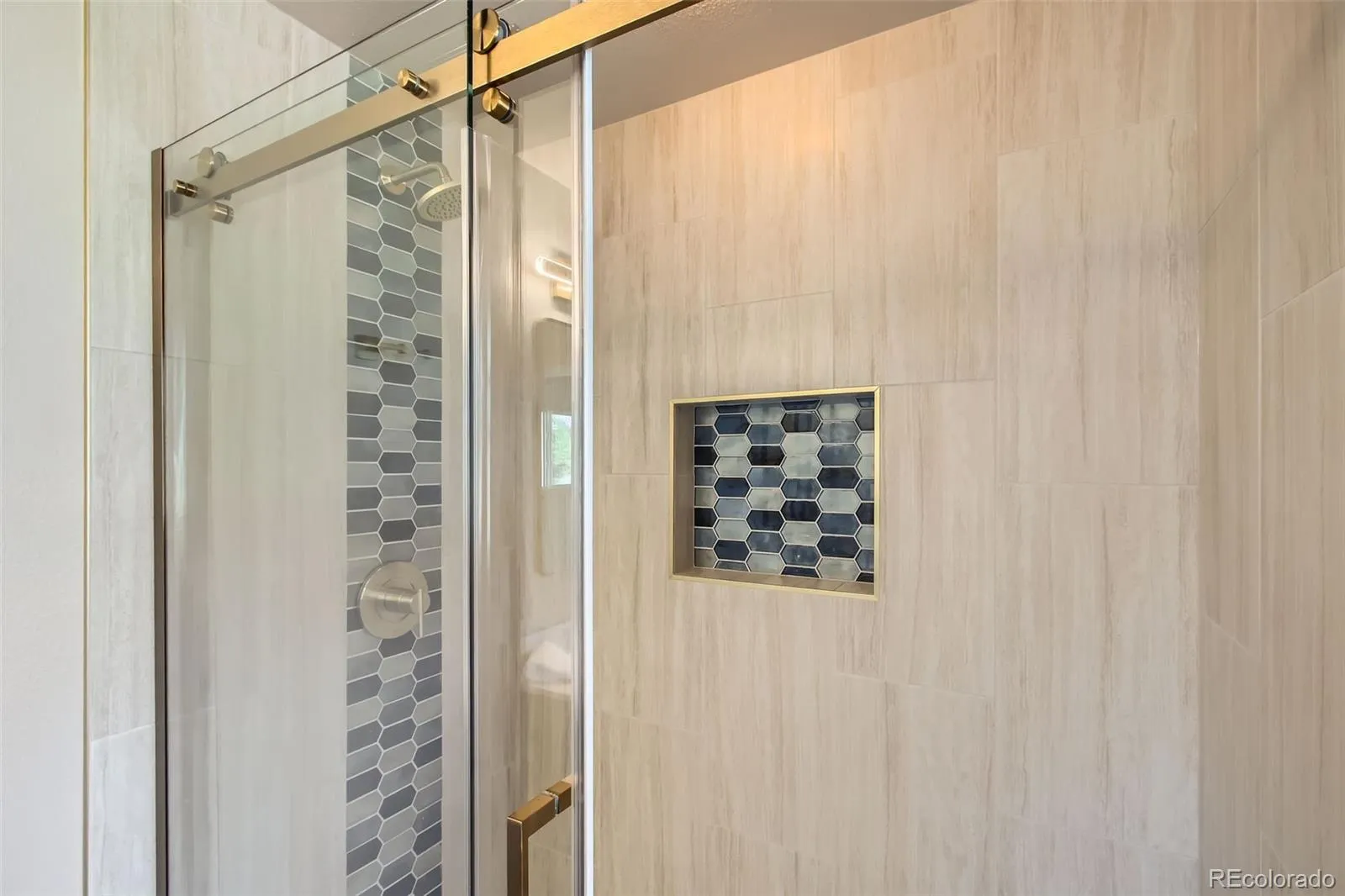 bathrooms have been entirely renovated with sleek tile work, gold finishes, and a luxurious dual vanity in the