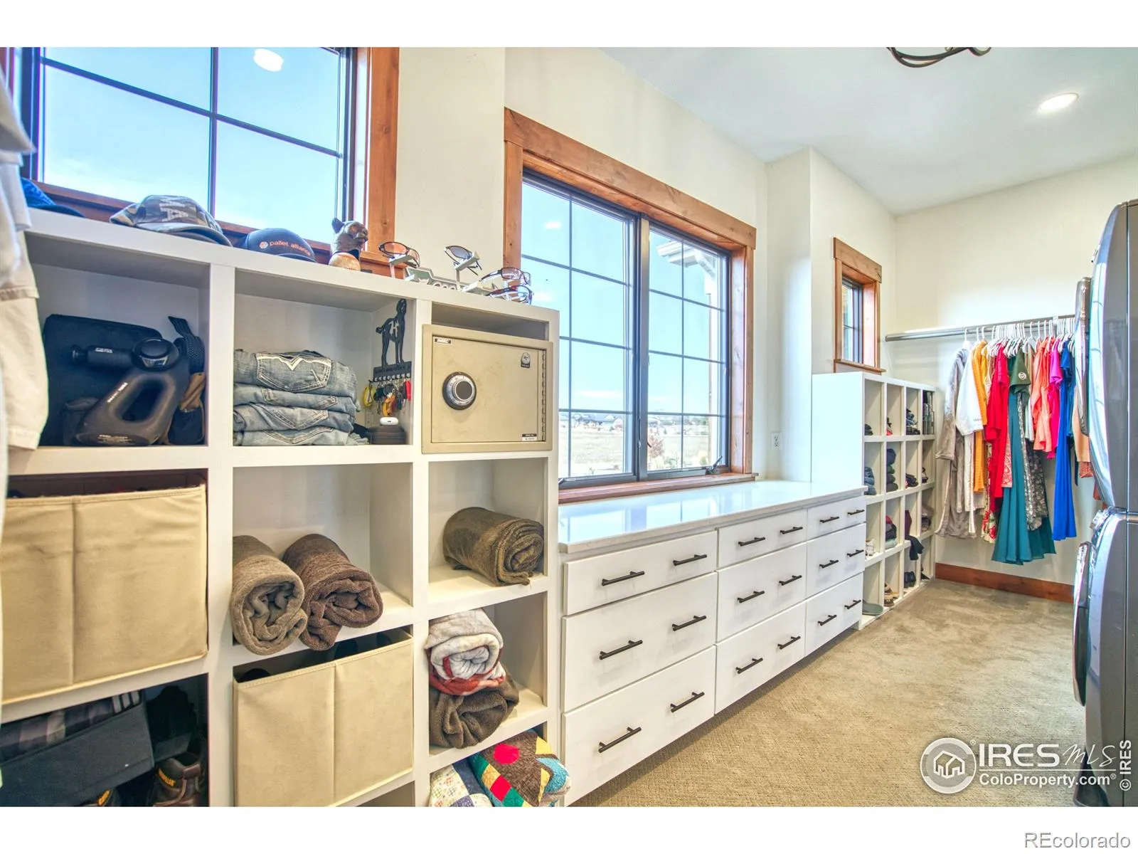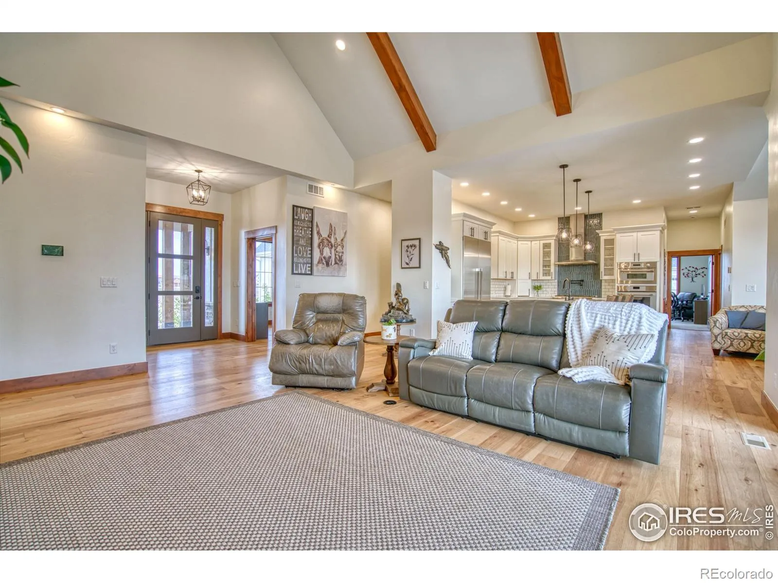 Enjoy the perfect blend of comfort and scenery at this beautiful home with unobstructed mountain views. Built in 2023, this exceptional custom home offers over 5,900 total square feet, including 4,871 square feet of beautifully finished living space. Complementing the main home is a versatile 40’x80′ (3,200 SF) outbuilding that includes a 1,000-square-foot accessory dwelling unit (ADU) and a 2,200-square-foot heated shop.The open-concept design of the main home, features four bedrooms, three bathrooms, and an oversized, fully finished three-car garage. The primary suite opens to the patio and includes a spa-inspired bath with in-floor heating and a custom walk-in closet with built-ins and laundry. The gourmet kitchen showcases Thermador appliances, a pot filler, sizable pantry, custom wine storage, and a large island perfect for entertaining. Additional highlights include an office with mountain views, two bedrooms with a Jack-and-Jill bath, and a second laundry with half bath. Above the garage, a finished 600-square-foot bonus room with a mini-split is ideal for a gym, guest suite, or media room. The 60% finished basement offers a wet bar and a160-square-foot vault. The adjoining shop features two 14-foot doors, in-floor heating, upgraded insulation, a high-efficiency furnace, half bath, and UV lighting for cleaner air. Built in 2021, the ADU features a full kitchen, living and dining areas, one bedroom, one bath, laundry, in-floor heating, and high-efficiency A/C. A fenced patio offers outdoor privacy, while the upper level provides an additional 1,000 square feet and a flexible room perfect for an office or studio. Set on 2.96 acres, the property offers a fenced yard, open pasture, raised garden beds, multi-zone sprinkler and drip systems, and over 100 trees and nearby detention pond protects your stunning Front Range views. Outdoor living shines on the covered patio with an outdoor kitchen, fireplace, and hookups for TV, speakers, and a future firepit.