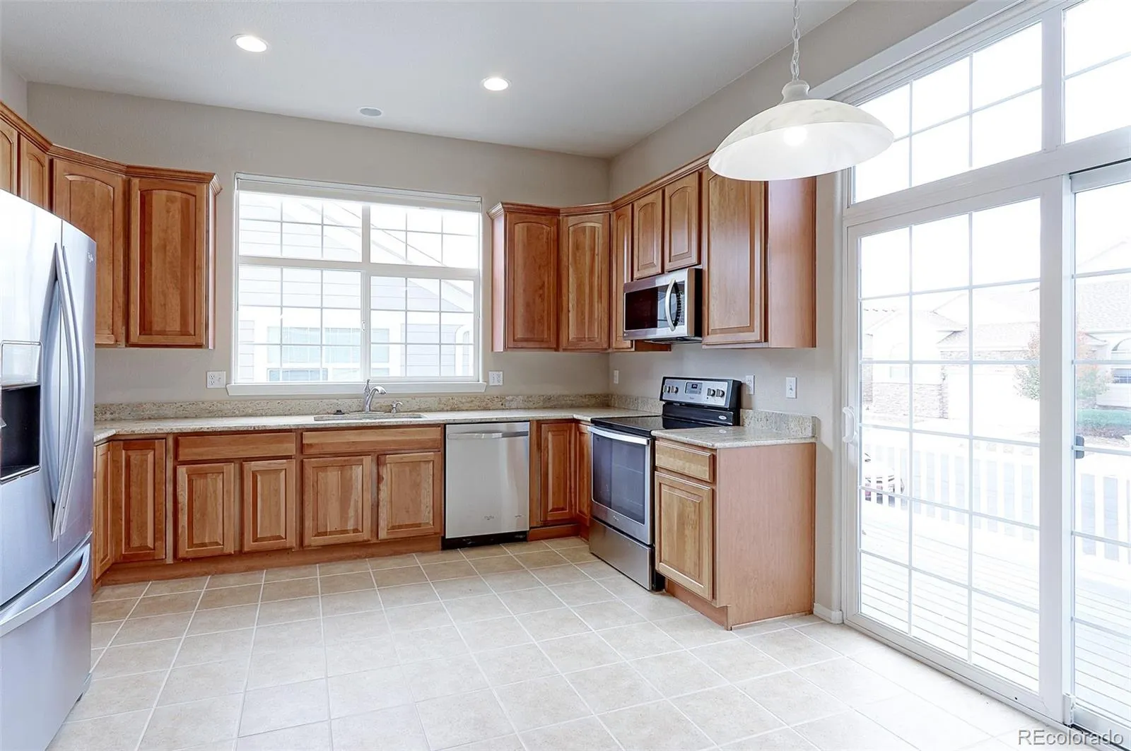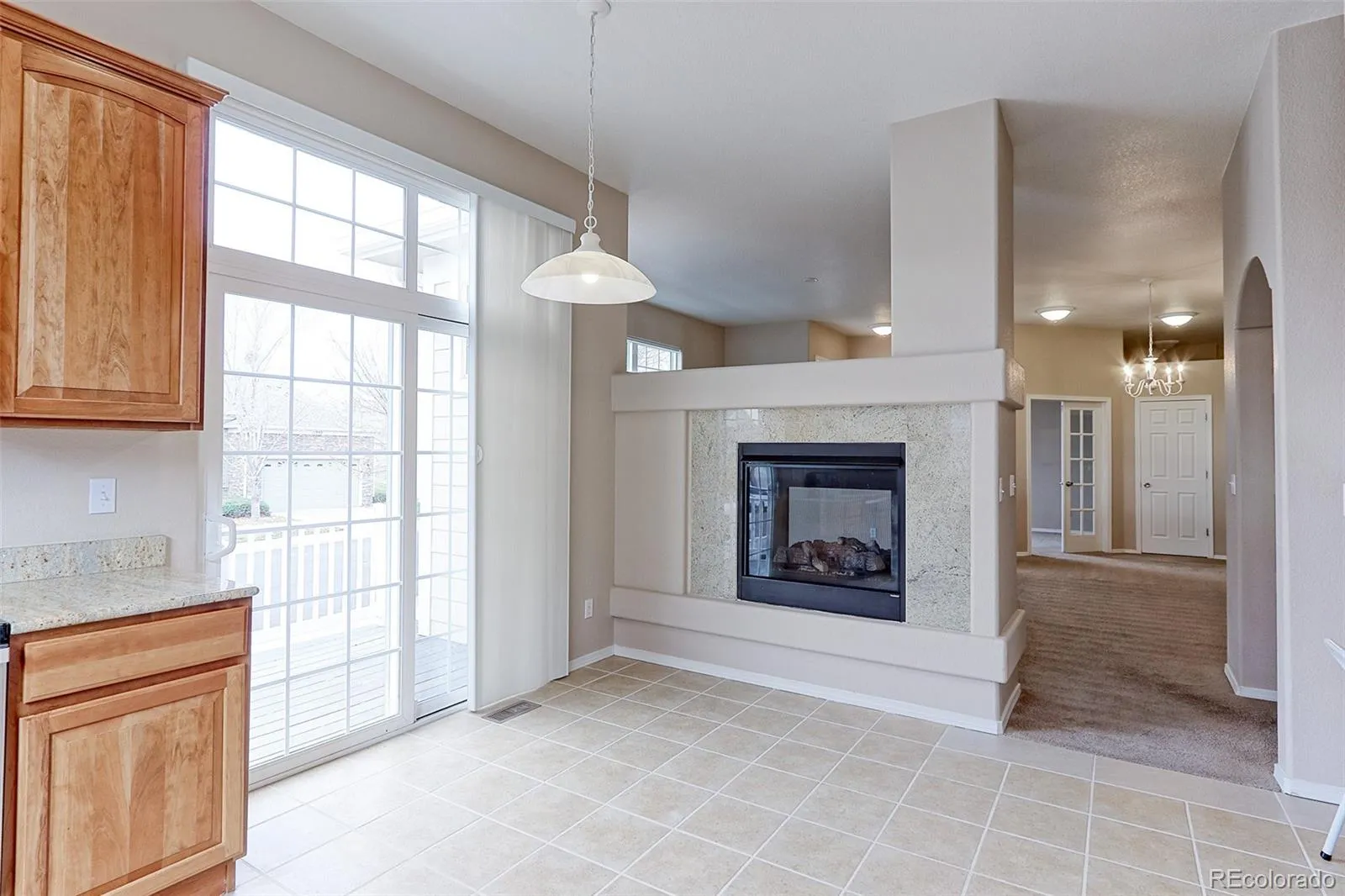 The main level includes an open kitchen with 42-inch cabinets, 2 lazy susans, and plenty of space for a dining table. A cozy double-sided fireplace connects the living area and kitchen, creating a welcoming ambiance throughout.