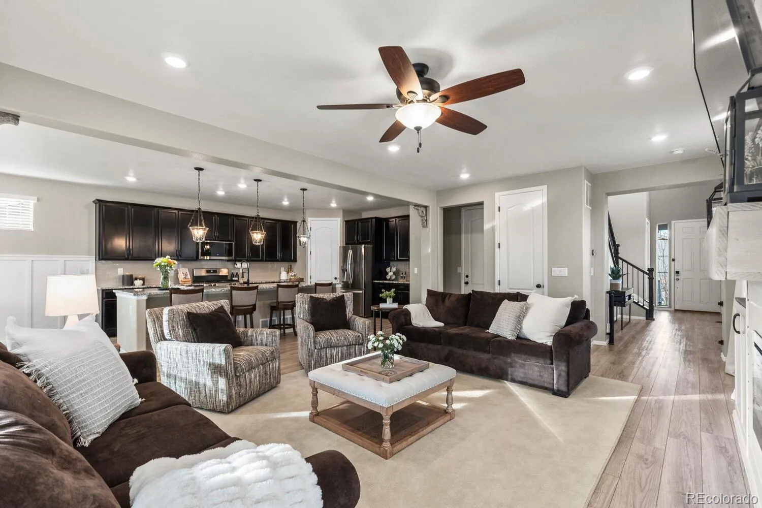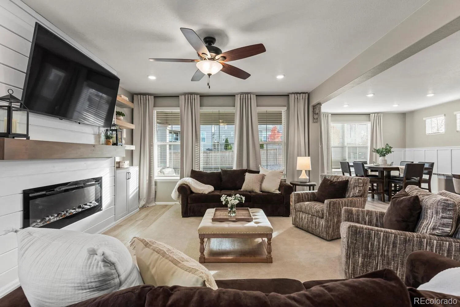 Step inside to a spacious two story entryway that sets the tone for the open concept main level. Throughout the entire home you’ll notice upgraded paint (no builder grade paint to be found!). The living room features custom built-ins and a cozy fireplace, flowing seamlessly into a modern kitchen with ample cabinet space and a large island—perfect for entertaining! The dining area features charming wood paneling and plenty of space for all your guests.