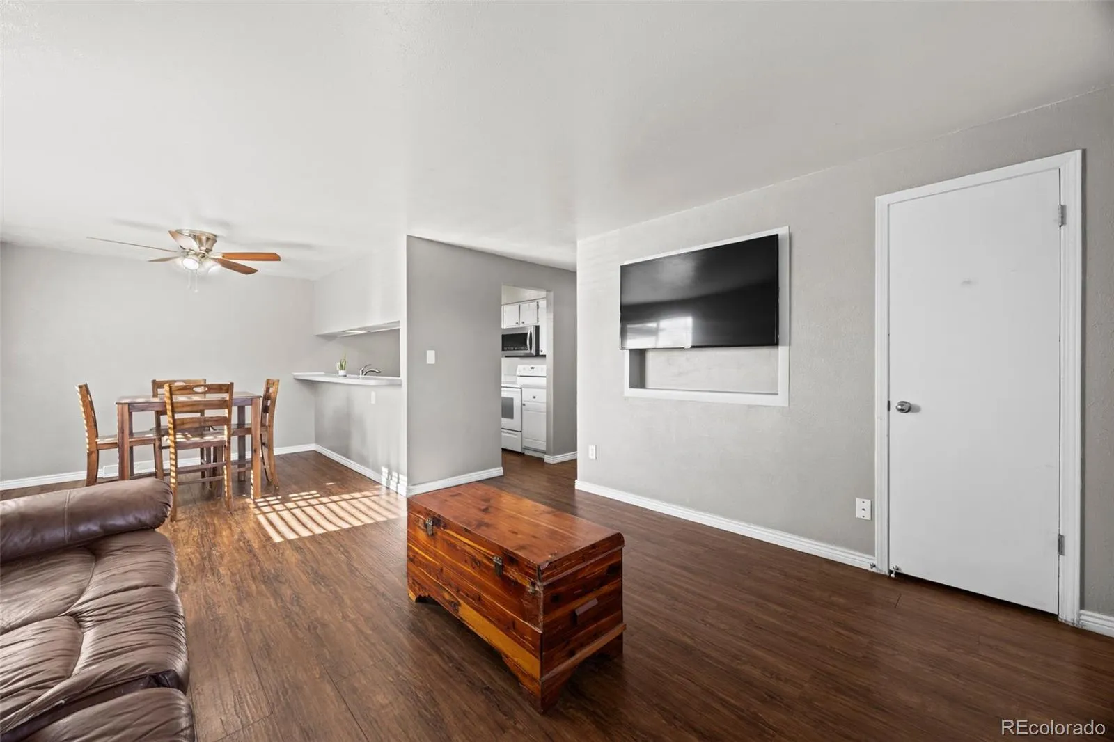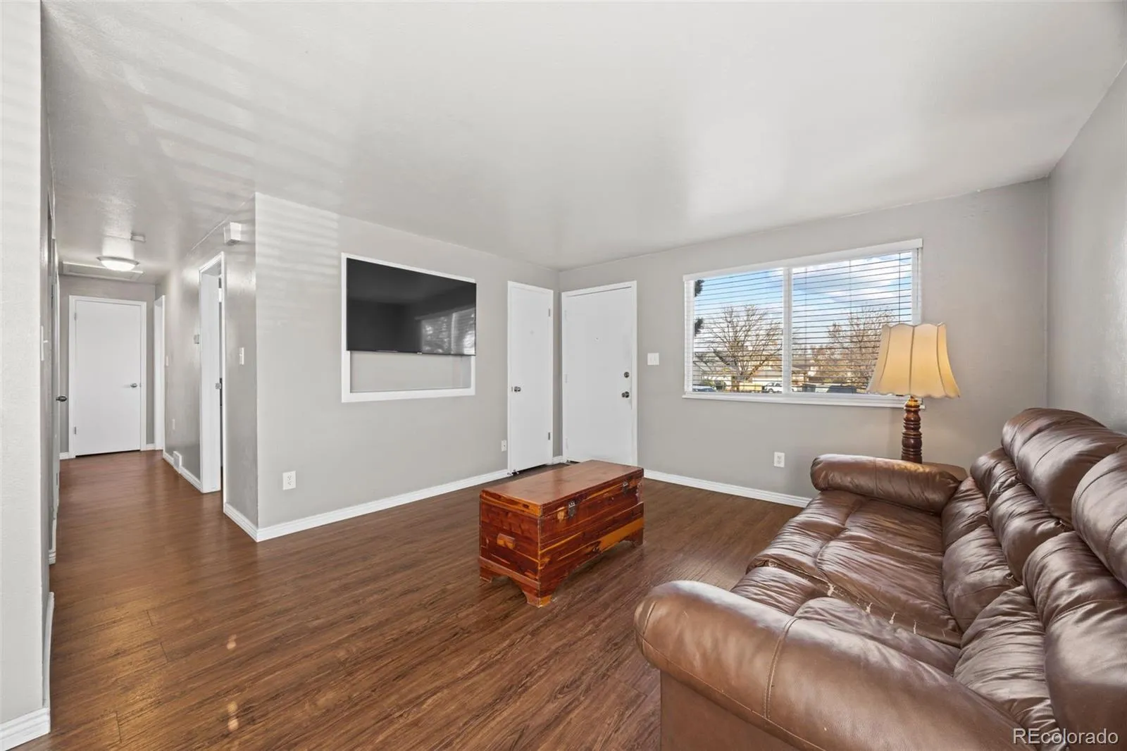 Welcome to 1192 S Eagle Cir #A, a charming move-in ready home that blends comfort, character and convenience in the heart of Aurora. This two bedroom, one bath gem is full of personality and sunshine, offering the perfect balance of relaxation and style. Step inside and feel at home in the spacious living area where natural light pours in from large windows, highlighting the inviting layout and warm atmosphere. Rich wood-style floors flow throughout the space, creating a modern feel that ties the home together beautifully. The kitchen is thoughtfully designed with plenty of counter space and cabinetry, making it both beautiful and functional. Fresh white cabinets, sleek appliances and a breakfast bar that opens to the dining area make this space ideal for anyone who enjoys cooking or entertaining. Both bedrooms are generous in size, offering comfort, privacy and ample closet space. The primary bedroom is impressively spacious with enough room to be comfortably split into two bedrooms if desired, giving you flexibility for future needs or guests. The second bedroom is perfect for guests, a home office or a cozy retreat. The bathroom is fresh and modern with a clean design that makes your morning routine effortless. The home sits on a corner lot with lovely green space and mature trees that add charm and privacy. Nestled in a friendly community, this home puts you close to everything that makes Aurora desirable. Explore nearby parks, enjoy local restaurants or spend an afternoon at Cherry Creek State Park. With easy access to major roads, commuting to Denver or weekend mountain getaways is a breeze. This delightful home is ready for its next chapter. Come fall in love with the warmth, charm and ease of living at 1192 S Eagle Cir #A.