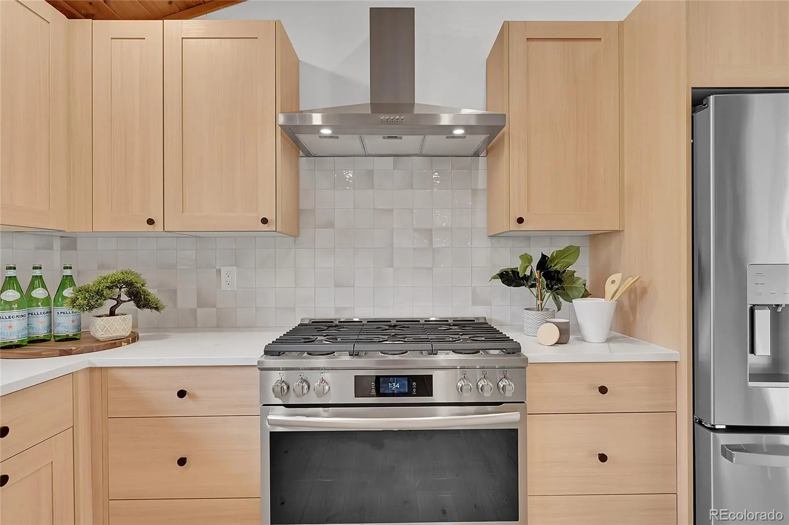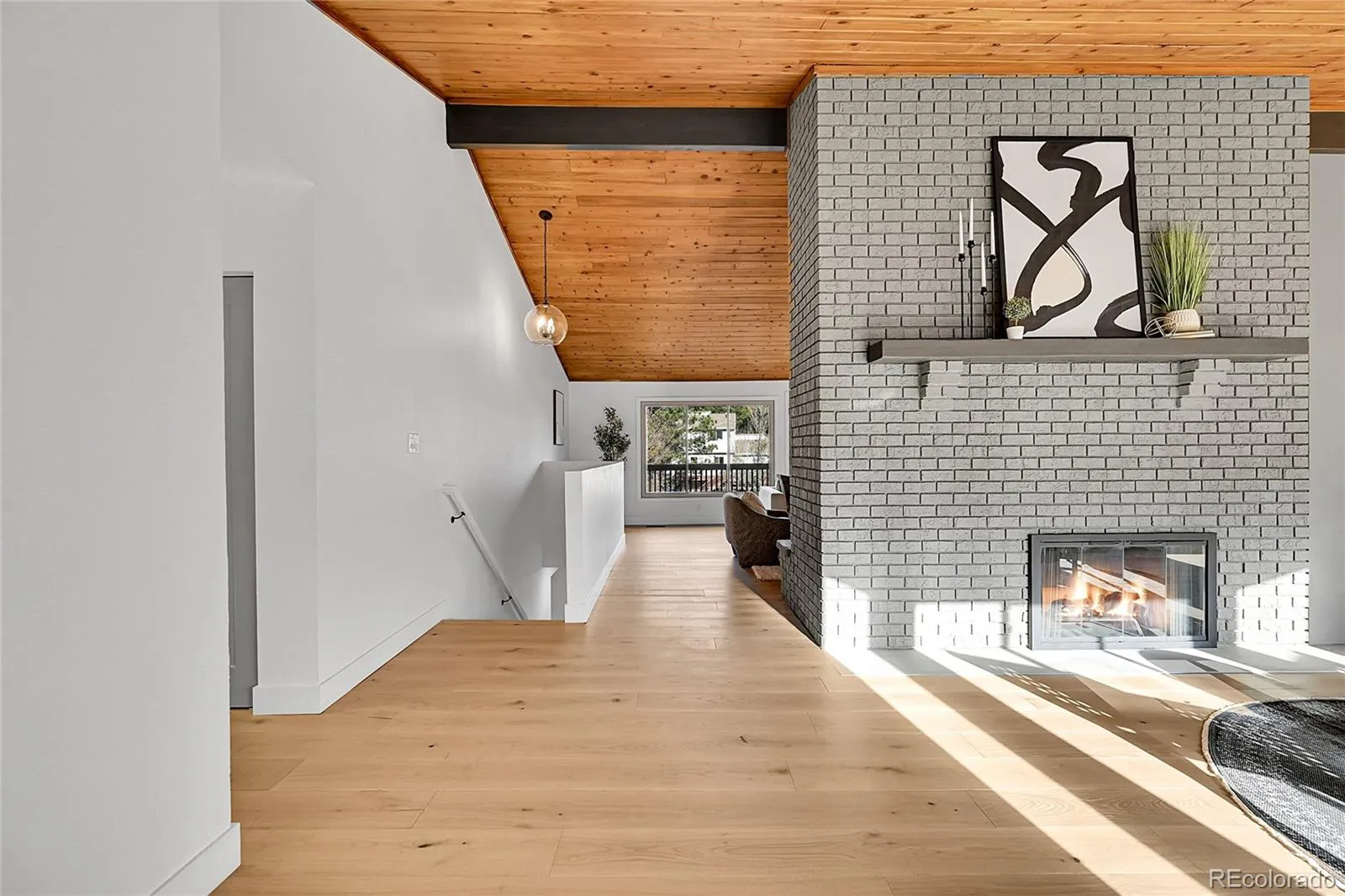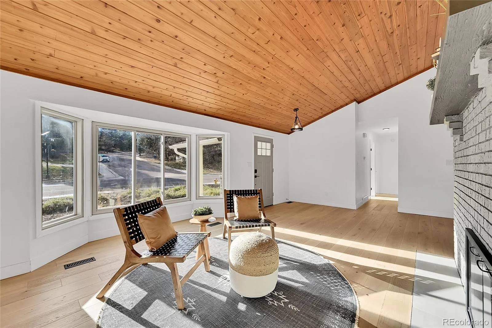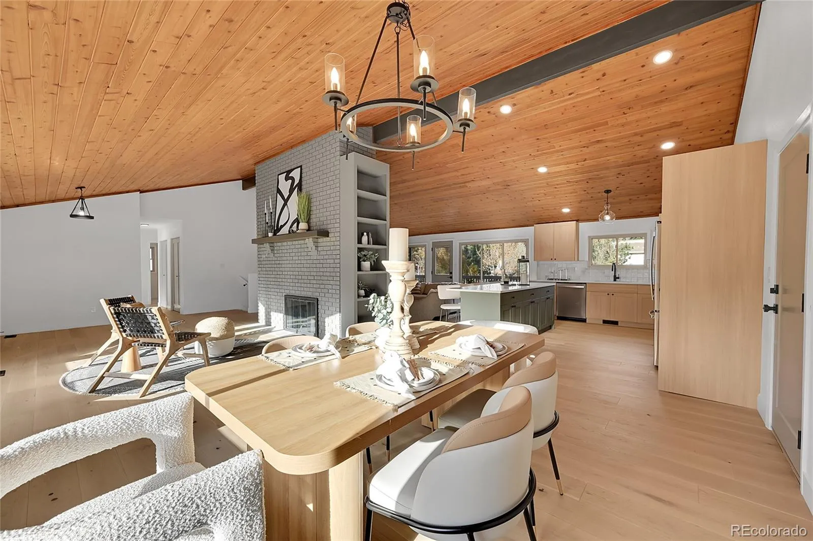 In the heart of Rockrimmon, this updated home blends architectural character with modern design. The entry opens to a vaulted great room with exposed beams, and wide-plank engineered wood floors. A dual-sided brick wall separates the entry and living space, featuring a fireplace on one side and a wood-burning stove on the other. The open floor plan connects the great room, living room, dining area, and a gourmet kitchen with a six-burner gas range, quartz countertops, custom cabinetry and tilework — perfect for gatherings or everyday living.