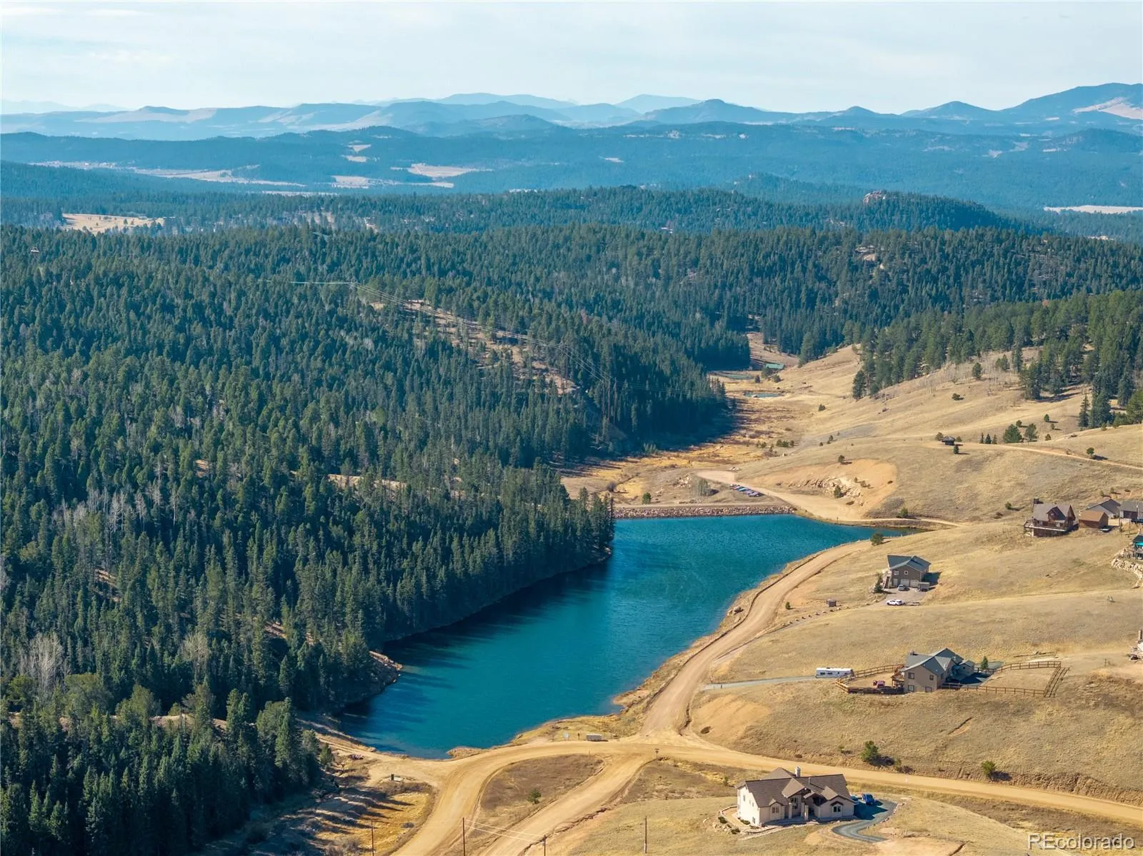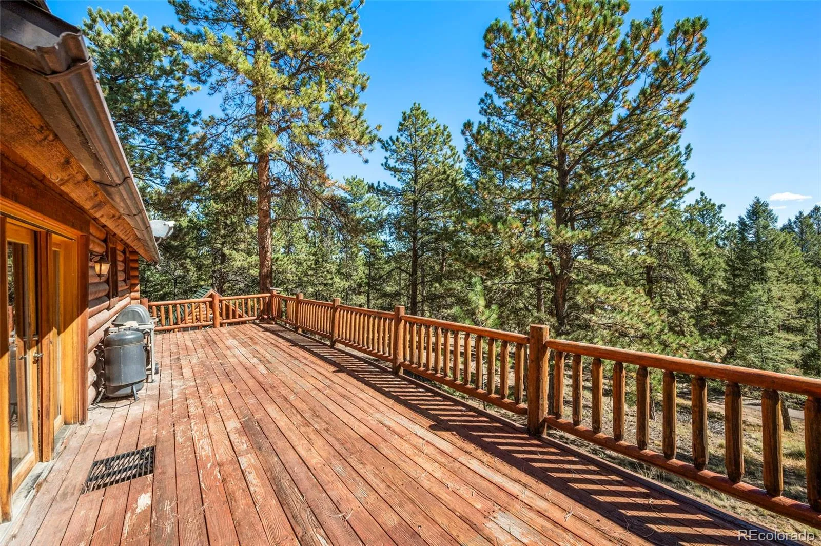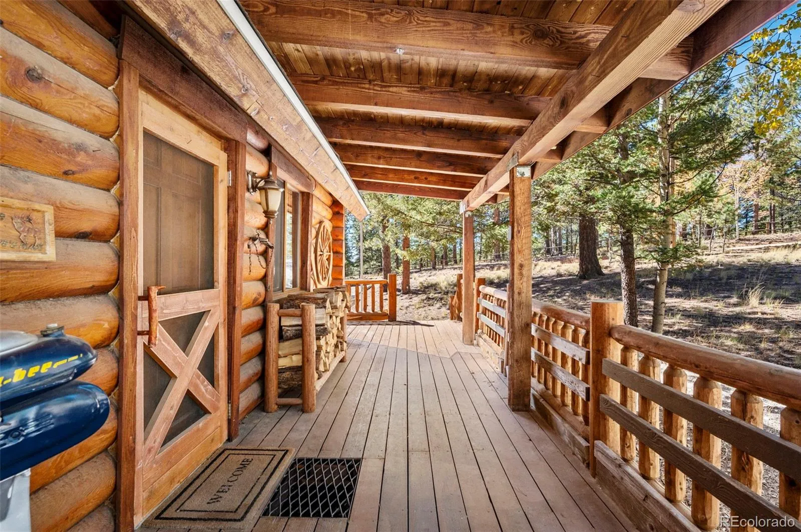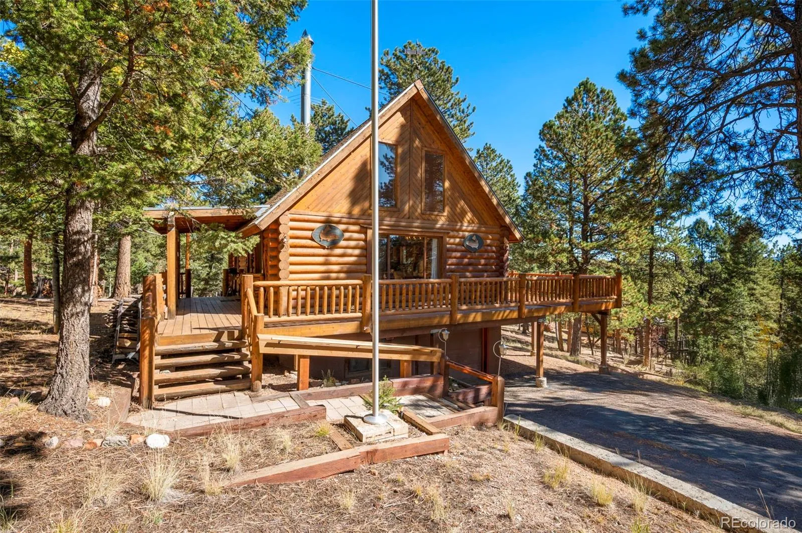 Tucked among mature spruce and pine on just over a full acre, this welcoming log cabin captures the essence of Colorado mountain living. An asphalt driveway leads to the attached one-car garage, while a wraparound deck and covered entry welcome you inside. Unique metal boot grates at the front and back doors add both function and rustic flair. In the great room you will find soaring tongue-and-groove ceilings with exposed beams, a wood-burning stove, and expansive windows that frame the surrounding forest and offer a view of Pikes Peak. The dining area sits beneath an impressive antler chandelier and flows into the kitchen with knotty wood cabinetry, ample counter space, and modern appliances. Upstairs, a versatile loft overlooks the living room – ideal for a lounge, office, or guest retreat. The finished basement offers two comfortable bedrooms, a full bath, laundry area, and direct access to both the garage and outdoors, making it perfect for family living or hosting guests. In addition, a 108 sq ft shop provides valuable extra space. Outdoor living shines with the expansive wraparound deck, abundant wildlife, and nearby access to private fishing lakes. As part of the Highland Lakes community, you’ll enjoy shared amenities including nine recreational lakes for fishing, hiking trails, playground, and a community building. Whether for full-time living or a weekend retreat, this home blends mountain charm with thoughtful details and timeless comfort.