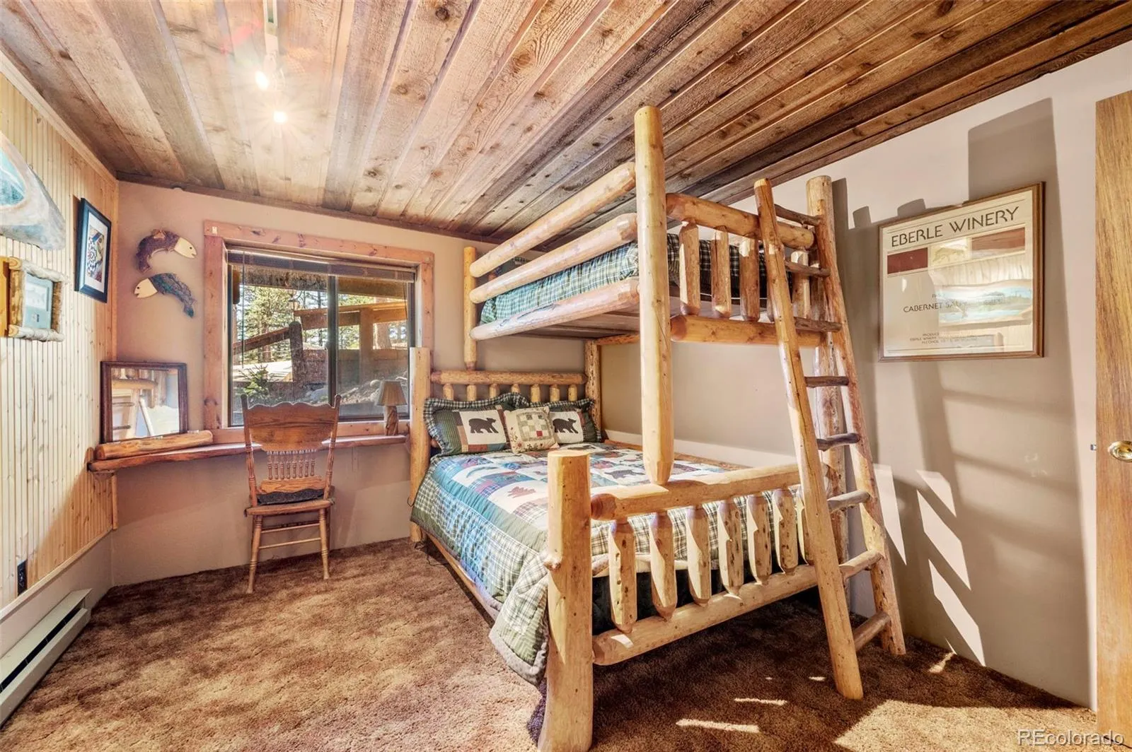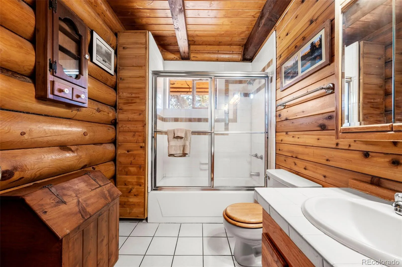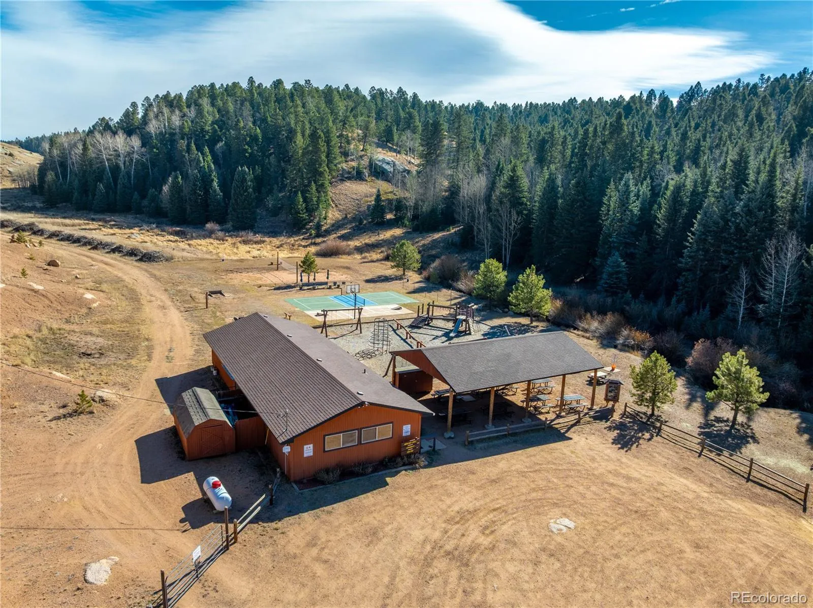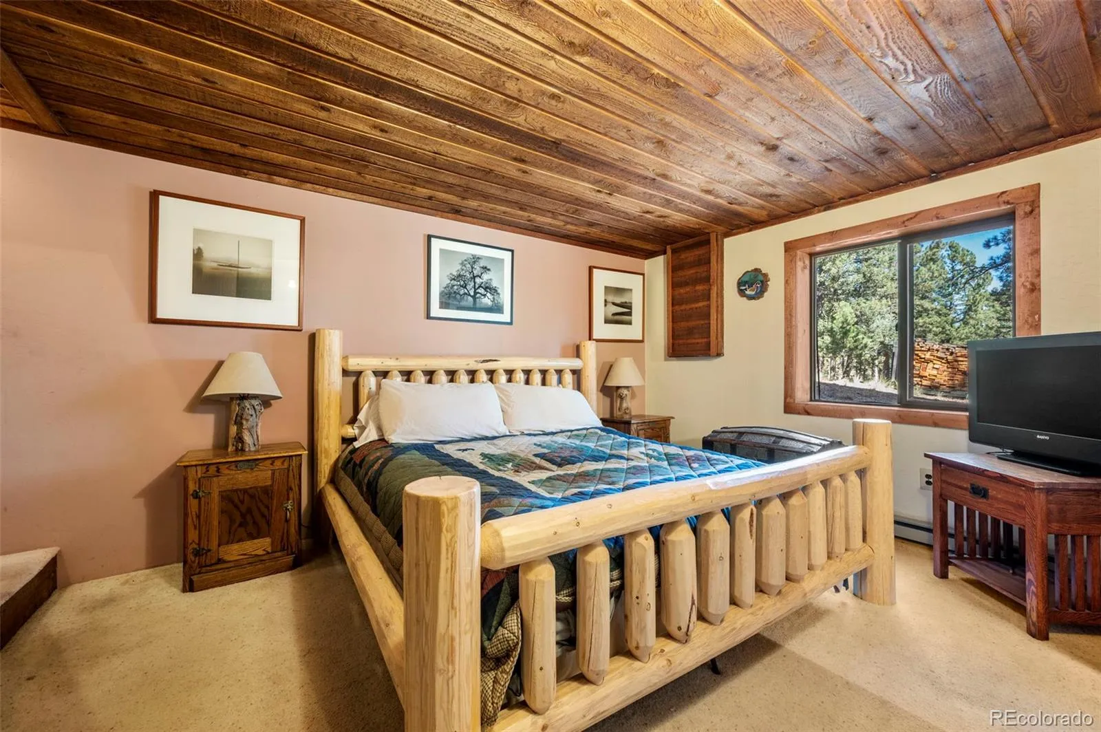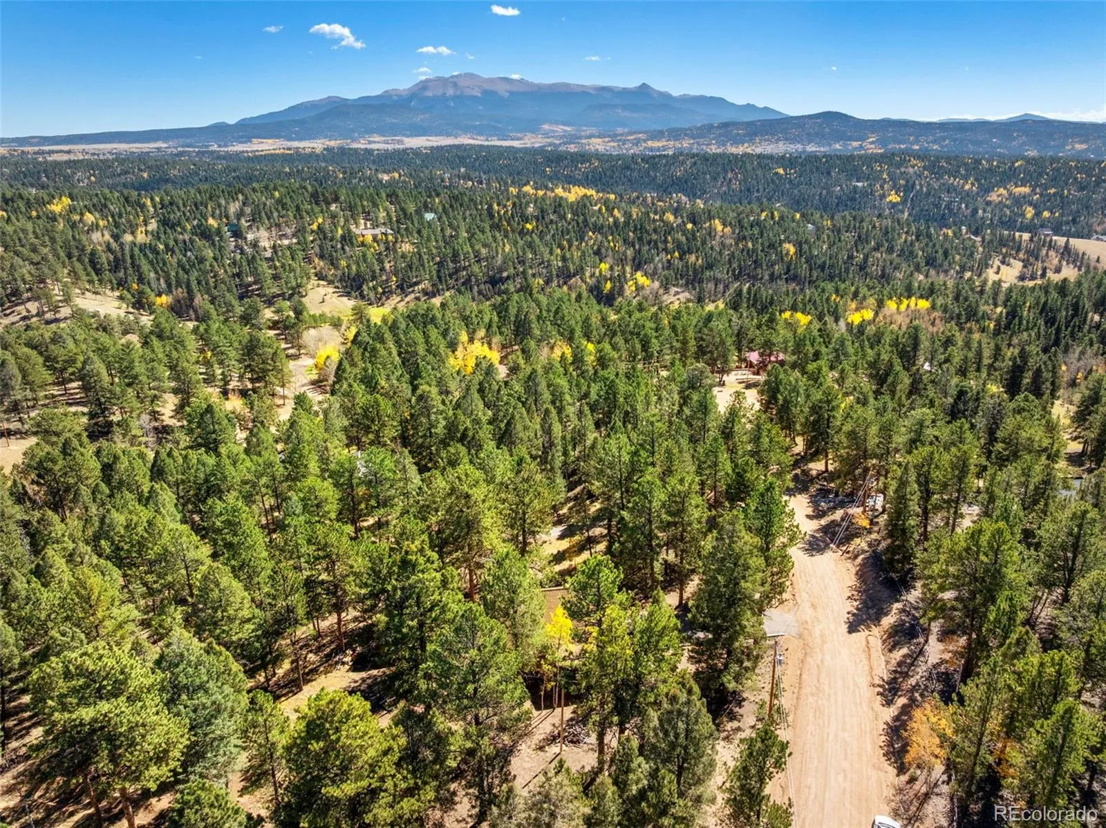 Tucked among mature spruce and pine on just over a full acre, this welcoming log cabin captures the essence of Colorado mountain living. An asphalt driveway leads to the attached one-car garage, while a wraparound deck and covered entry welcome you inside. Unique metal boot grates at the front and back doors add both function and rustic flair. In the great room you will find soaring tongue-and-groove ceilings with exposed beams, a wood-burning stove, and expansive windows that frame the surrounding forest and offer a view of Pikes Peak. The dining area sits beneath an impressive antler chandelier and flows into the kitchen with knotty wood cabinetry, ample counter space, and modern appliances. Upstairs, a versatile loft overlooks the living room – ideal for a lounge, office, or guest retreat. The finished basement offers two comfortable bedrooms, a full bath, laundry area, and direct access to both the garage and outdoors, making it perfect for family living or hosting guests. In addition, a 108 sq ft shop provides valuable extra space. Outdoor living shines with the expansive wraparound deck, abundant wildlife, and nearby access to private fishing lakes. As part of the Highland Lakes community, you’ll enjoy shared amenities including nine recreational lakes for fishing, hiking trails, playground, and a community building. Whether for full-time living or a weekend retreat, this home blends mountain charm with thoughtful details and timeless comfort.