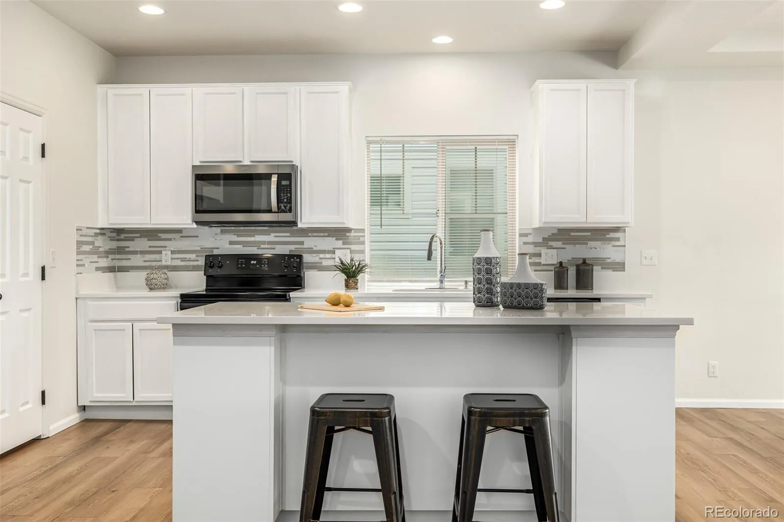 The open-concept kitchen provides recessed lighting, stainless steel appliances, plenty of white cabinetry, stylish tile backsplash, built-in microwave, quartz counters, and a center island equipped with a breakfast bar. There’s also a huge walk-in pantry with double doors!