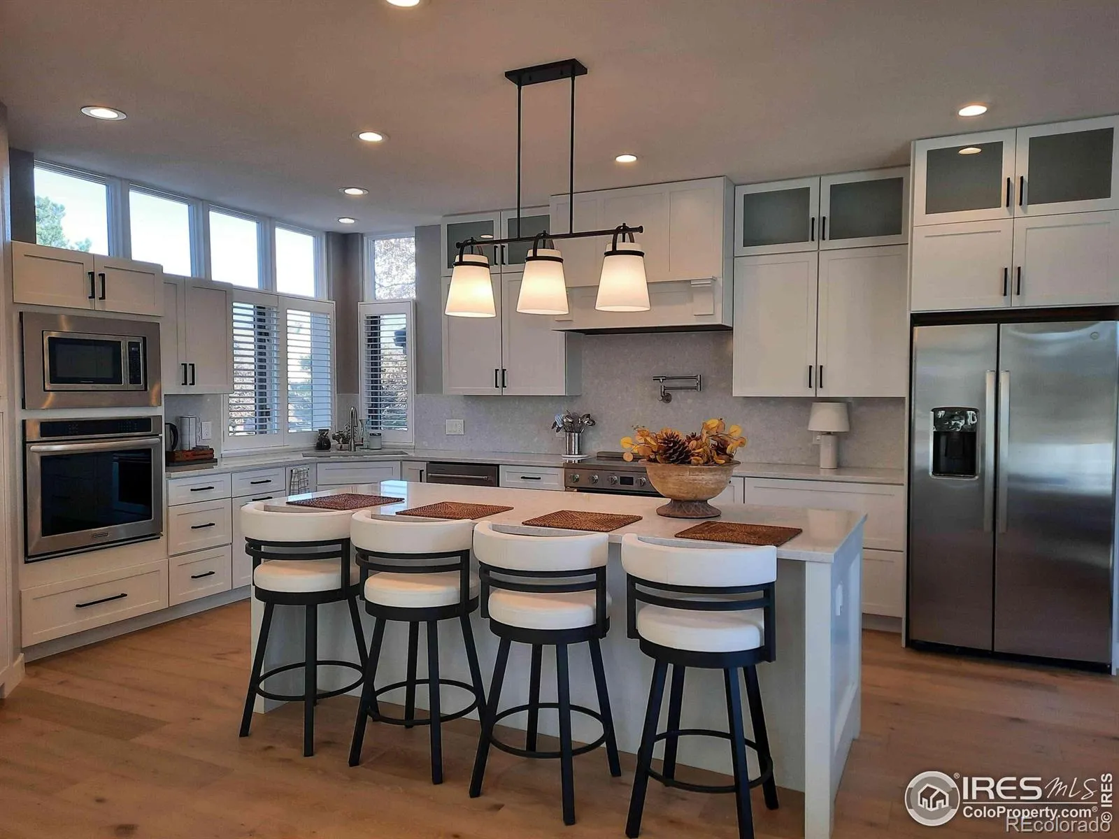 Fantastic Colorado Mountain views in the highly desired Coal Creek Golf Course Island Subdivision in the beautiful town of Louisville. Over 2000 sq ft of flexible living on the main floor with 18 ft vaulted ceilings and a spectacular wall of windows. The main floor includes a guest bedroom with private bathroom, office/Zoom room, walk in pantry, family room with half bath, and laundry room with utility sink. Custom folding glass doors off of the spectacular kitchen lead to a screened in porch for the best of indoor/outdoor living. The lower level has potential ADU for nanny, student rental or in-law space. Side entry 3 car garage with storage area for all your recreational equipment. All rooms have Modern updating and the new circle driveway gives a pleasant boost to the curb appeal. New patio with updated landscaping creates a tranquil space to relax and enjoy nature listening to the rock stream and taking in the resort feel views. Unique features include: 3 fireplaces, custom boot bench, double ovens, 36 inch induction stove, laundry chute, central vacuum, concrete tile roof, solar panels and an abundance of storage space. Mountain views from multiple rooms through out this custom house with community amenities including swimming pool, tennis courts, and clubhouse. Easy access to walking/bike trails and multiple parks. Cul-de-Sac Golf course lot completes the luxury living lifestyle everyday of the year.