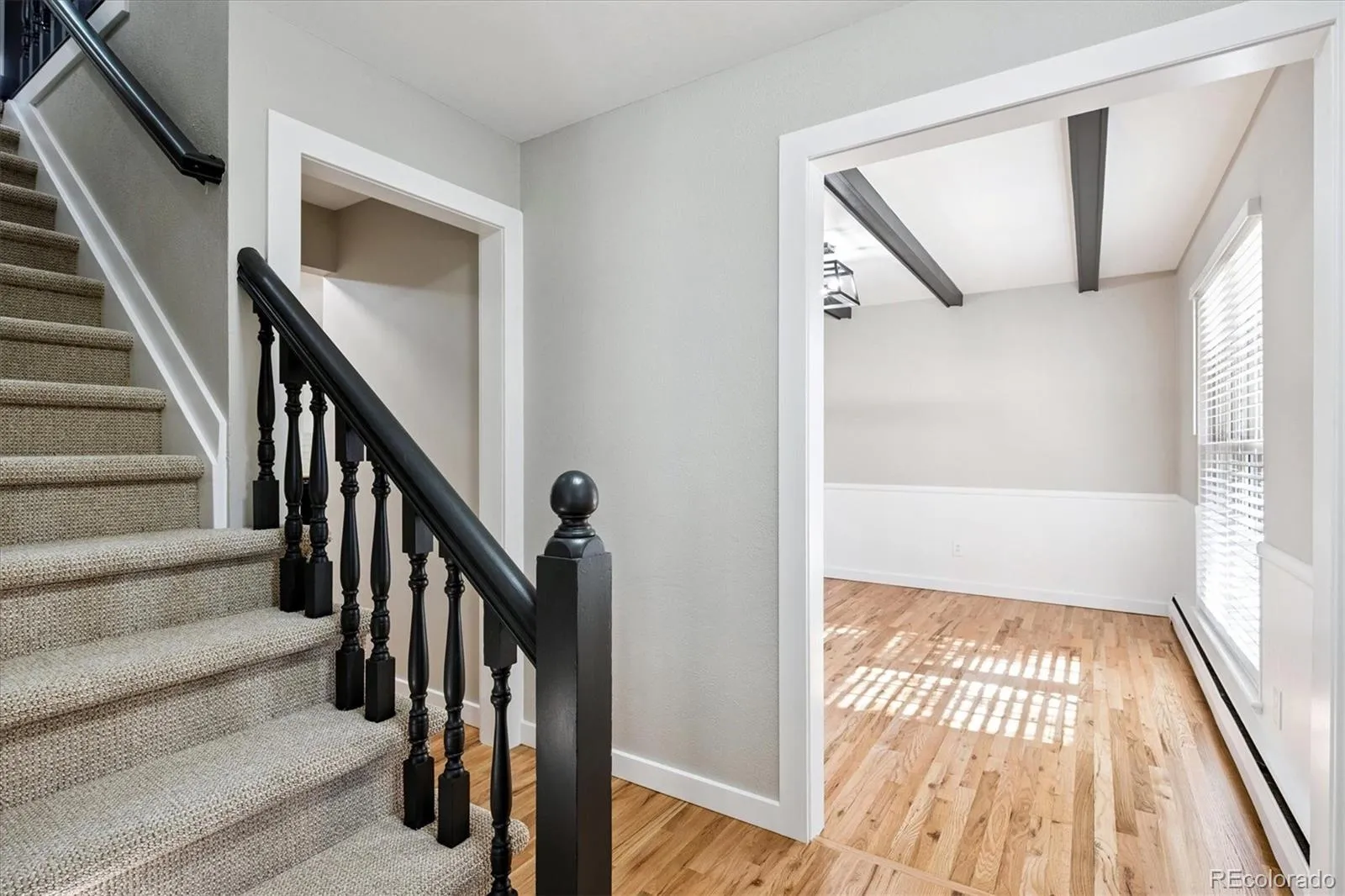 Tucked mid-block on a sunny, south-facing lot in the desirable Holly Hills neighborhood, this beautifully updated two-story offers charm, space, and location. Enjoy a Denver address with lower Arapahoe County taxes, access to Cherry Creek Schools, and direct backyard entry to the scenic High Line Canal Trail. Inside, a traditional yet flexible layout features newly finished natural wood floors, fresh paint, updated trim, stylish black hardware, modern light fixtures, and new window blinds throughout the main and upper levels. The sunlit living room with gas fireplace is large enough to accommodate multiple uses including formal seating, dining, or a music space. A formal dining room with ceiling beams and wall paneling offers versatility and could serve as a study or office. The adjacent kitchen boasts Pure White cabinetry, new tile backsplash, solid-surface counters, black appliances, and space for casual dining. A fully remodeled powder room completes the main floor. The upstairs offers four spacious bedrooms, including a primary with wall-to-wall closets and private access to a vintage full bath. Two secondary bedrooms feature French doors to a covered front balcony. A retro three-quarter bath and laundry chute add charm and function. The finished basement includes a family room with wood-burning fireplace, game area (or potential 5th bedroom), and a generous laundry/mechanical room with storage. Outside, enjoy an expansive, private backyard with a gate to the trail, a covered patio for relaxing, and room to garden or play. I-25 is just minutes away. This one is truly special—don’t miss it!