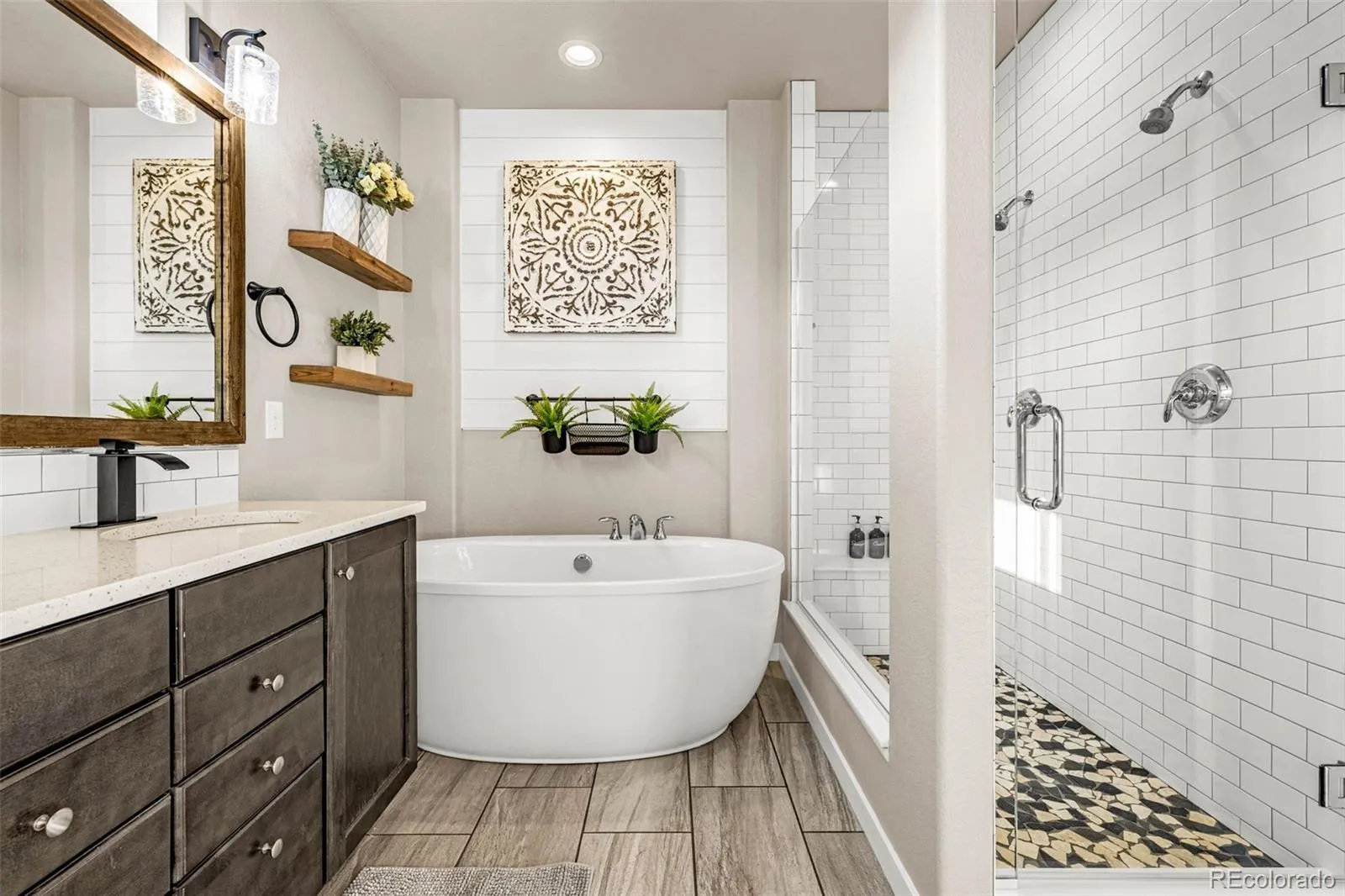 soaking tub, oversized shower with dual shower heads, and a spacious walk-in closet that conveniently flows into the mainlevel laundry room—a thoughtful design for everyday living. Upstairs, you’ll find a large loft with an open walkway