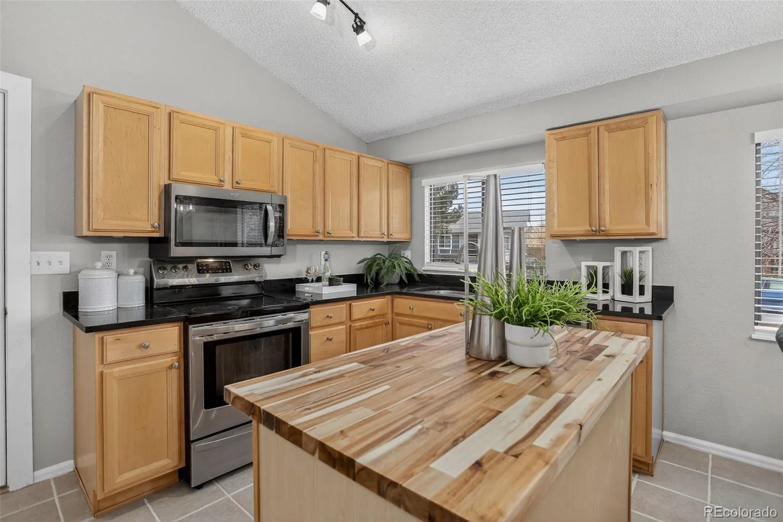 This stunning 3-bedroom, 2.5-bath home shows like a model with updates throughout. Step into the spacious living room with vaulted ceilings, where natural light fills the space and modern stair balusters create an open, contemporary feel. The main level flows seamlessly into a chef’s kitchen with granite countertops and a center island with a new butcher block counter—perfect for cooking and entertaining.