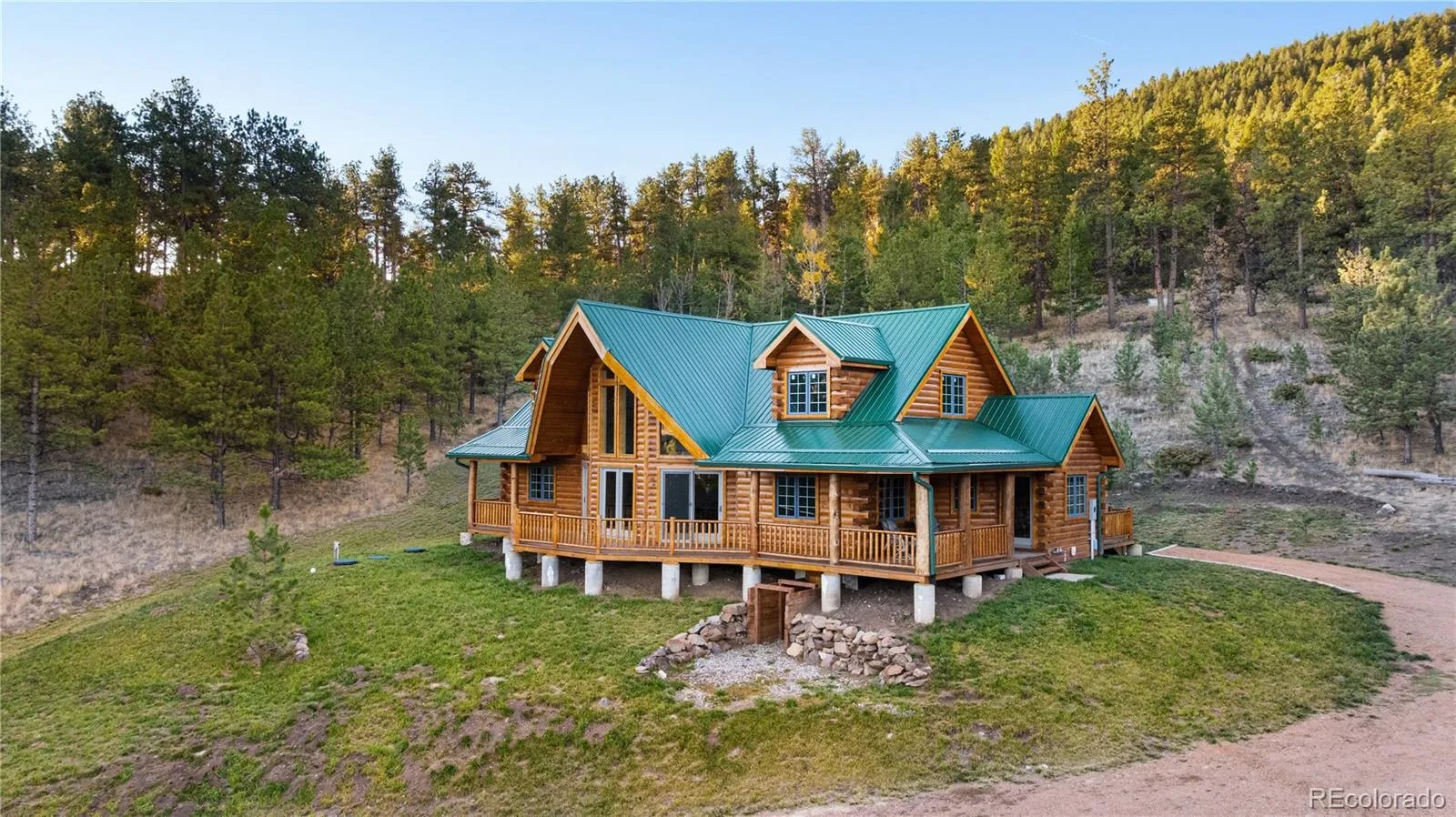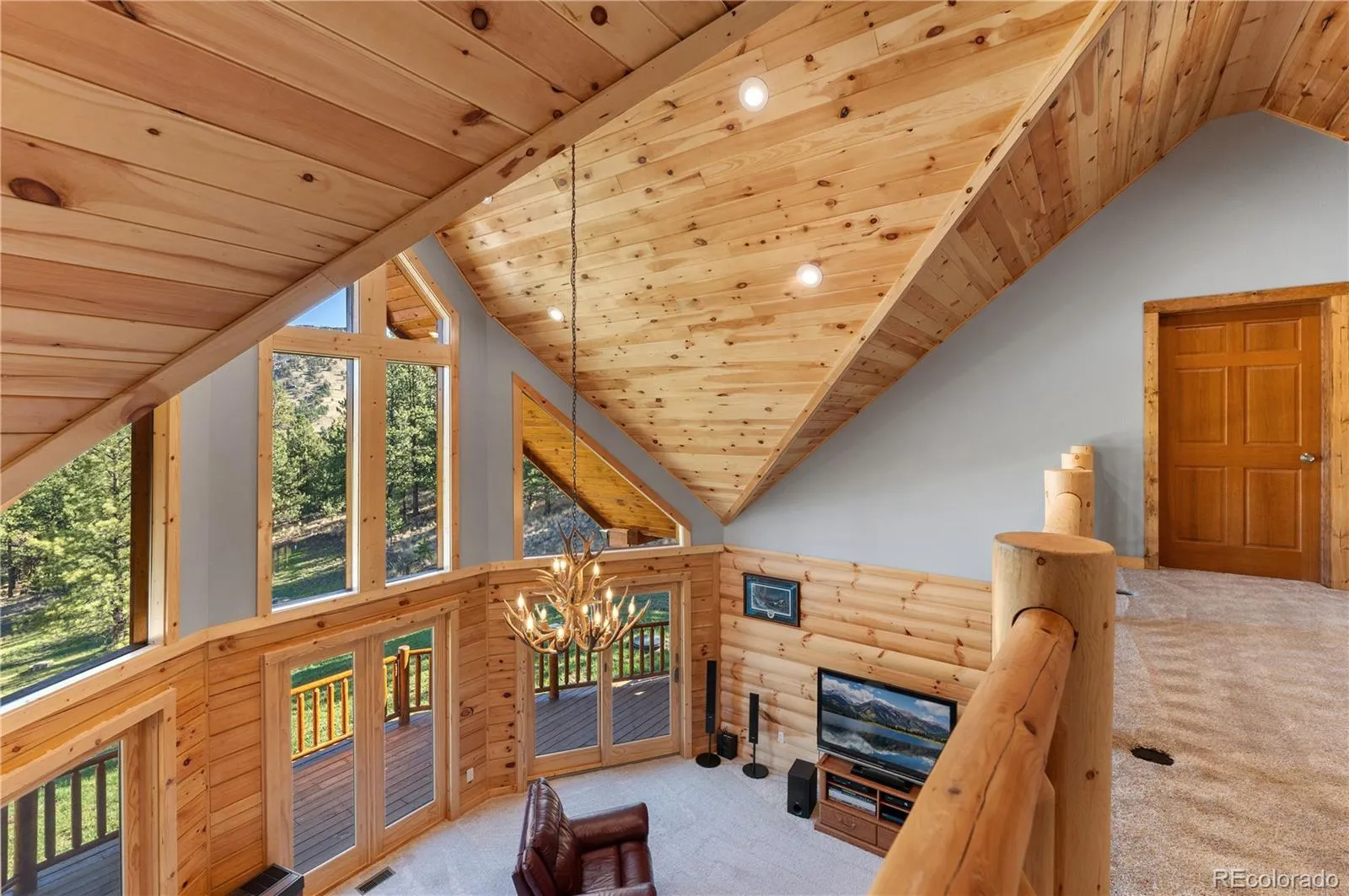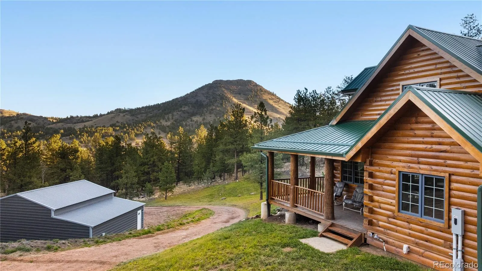 The handcrafted home showcases classic Colorado log cabin architecture with a striking green metal roof and full-length covered porches on both the front and back—ideal for relaxing and soaking in the natural beauty. Inside, an open-concept main level welcomes you with soaring vaulted ceilings, tongue-and-groove wood finishes, and expansive windows that flood the great room with natural light.