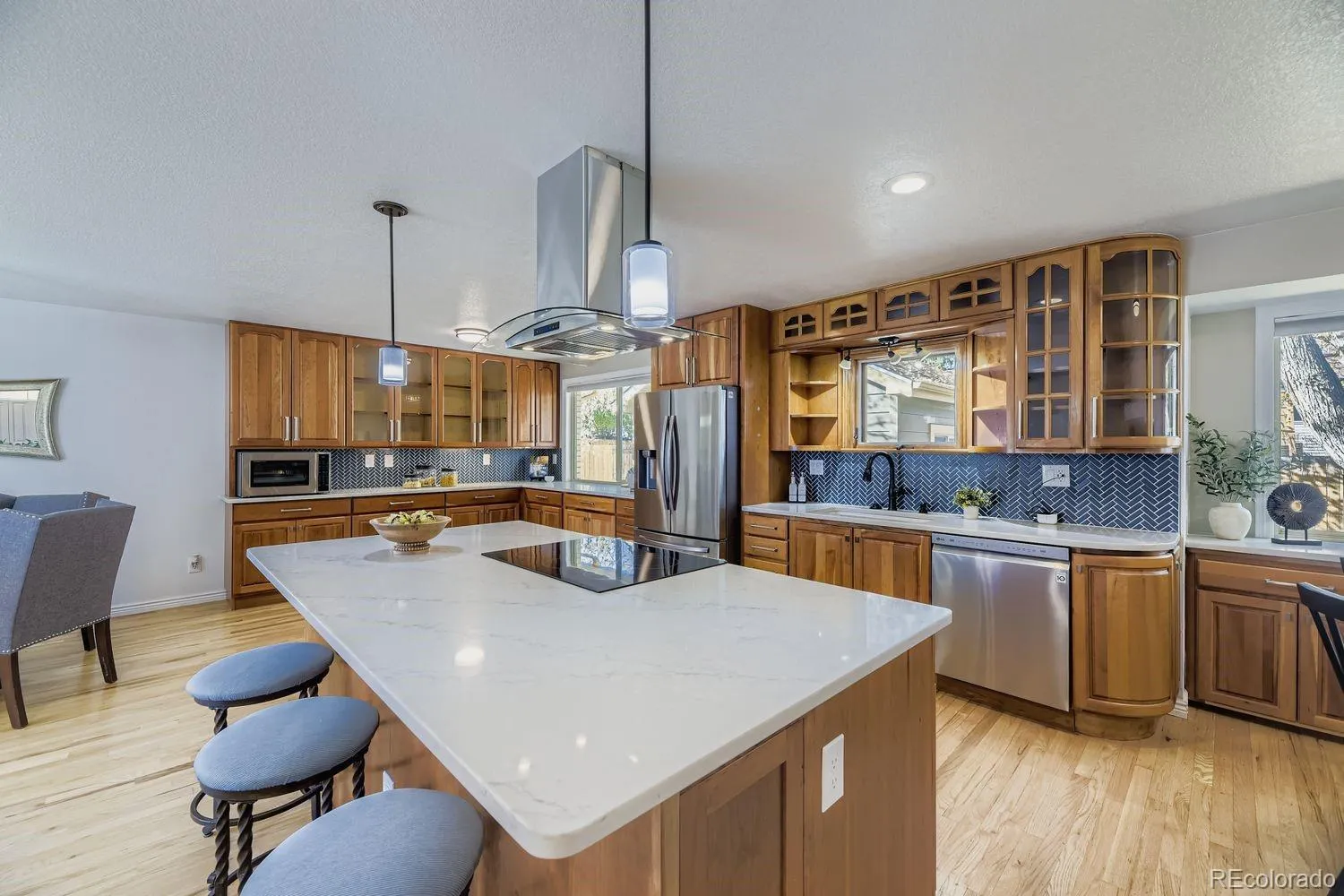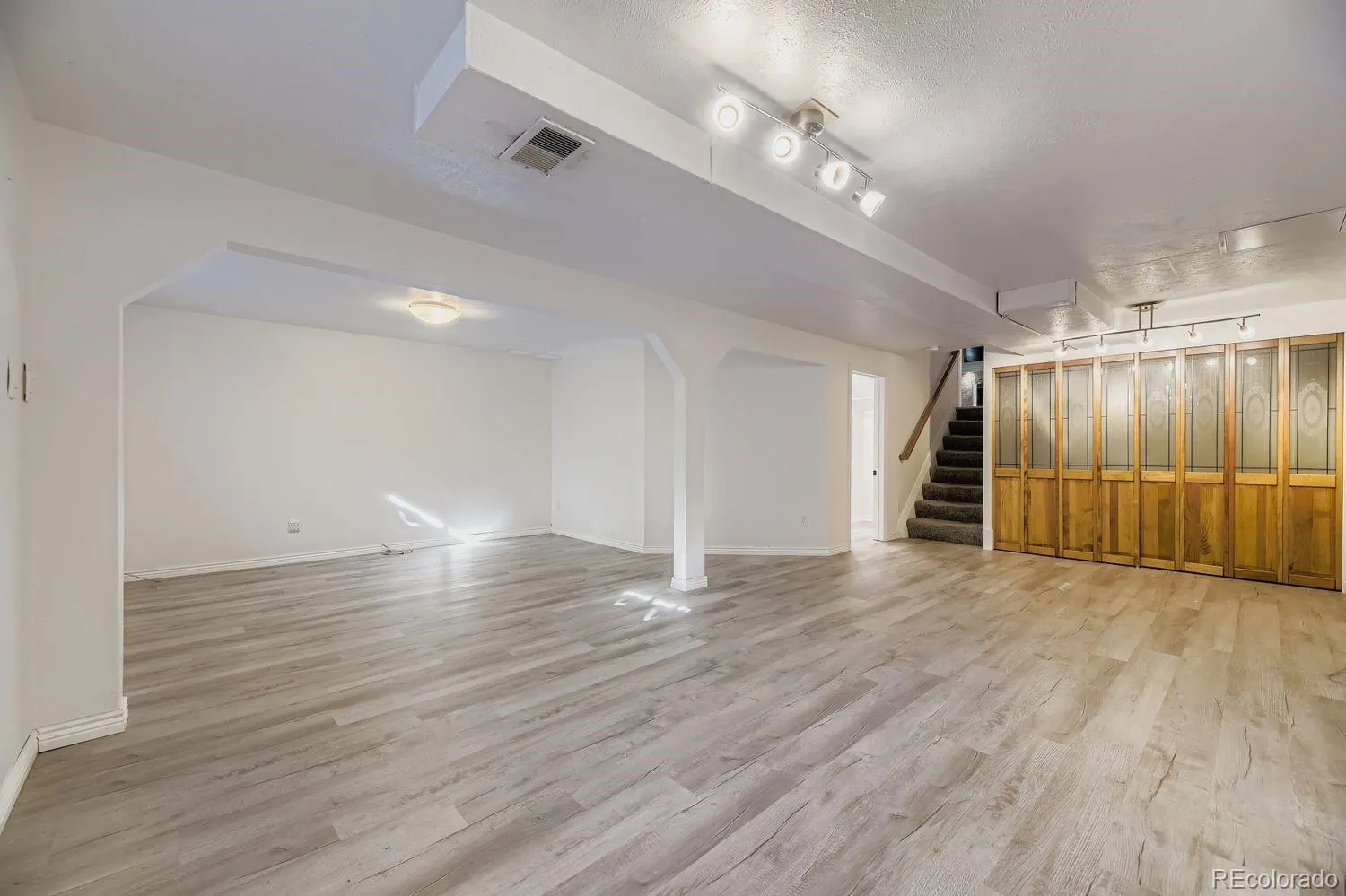 Located in the heart of Lakewood, close to shopping, bus, Belmar, schools and C-470. This fabulous craftsman home demonstrates true pride in ownership! It has been fully remodeled & meticulously maintained to include an open concept kitchen/dining area showcasing 24 custom cherry wood, soft-close cabinets, a kitchen island with stove, storage and vented range hood, quartz countertops, stainless steel appliances, under cabinet lighting and stunning hardwood floors. The light & bright primary bedroom is oversized and includes an en suite bath with walk-in shower, double sinks and a large walk-in closet. The second-floor guest bath includes a deep soaker tub with shower, vessel sink, floating vanity, under vanity lighting and gorgeous tile décor. After a long day, relax by the wood burning fireplace in the cozy family/TV room with built-in Bose speaker system, big-screen TV and easy-to-maintain luxury vinyl flooring. Next to the family/TV room, you’ll find the powder bath and plumbed space for full-sized washer and dryer. Pop down to the fully finished basement with luxury vinyl flooring and a 120 sq. ft. storage room. Walk out to the lovely landscaped & fully fenced backyard with redwood deck, covered patio, tool shed and flowing water feature. A bonus detached workshop measuring approximately 18’x19’, is heated with a concrete floor and many power outlets for serious makers. Property includes a 2-car attached garage. Newer Low-E vinyl windows throughout. Exterior is brick and stucco, all recently repainted (2024). Sprinkler systems front and back. No HOA and plenty of room for RV parking. The home is on a quiet street with many mature trees. Definitely a must see! It won’t last long!