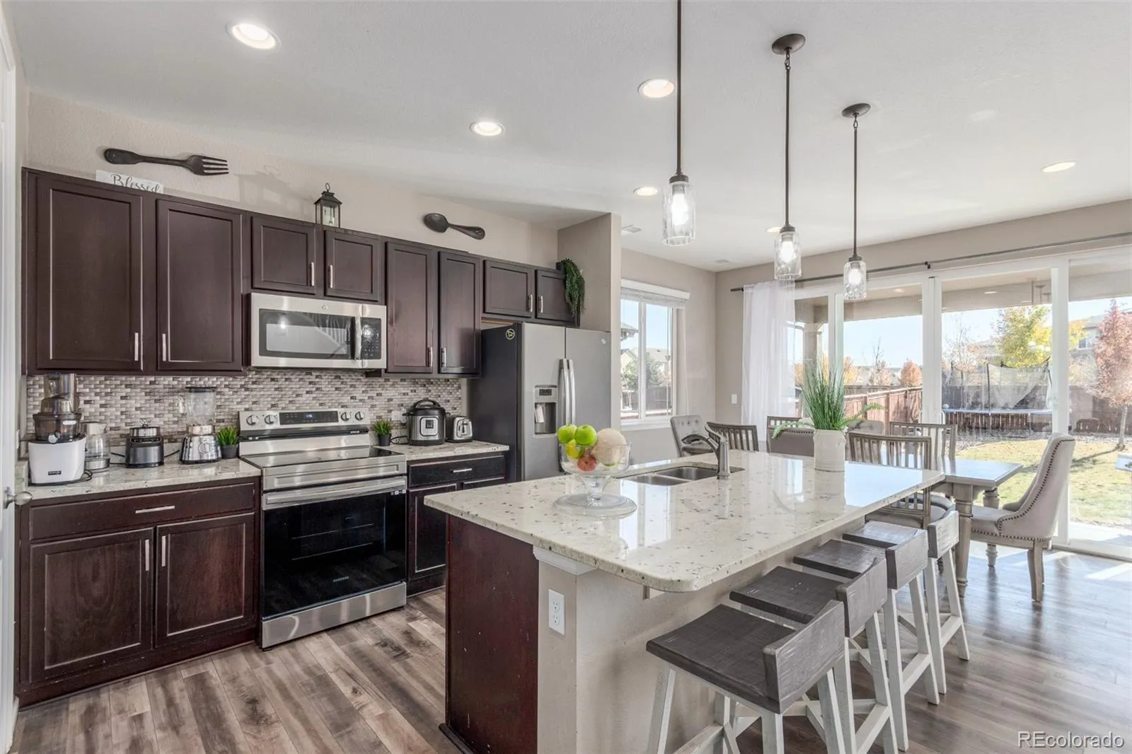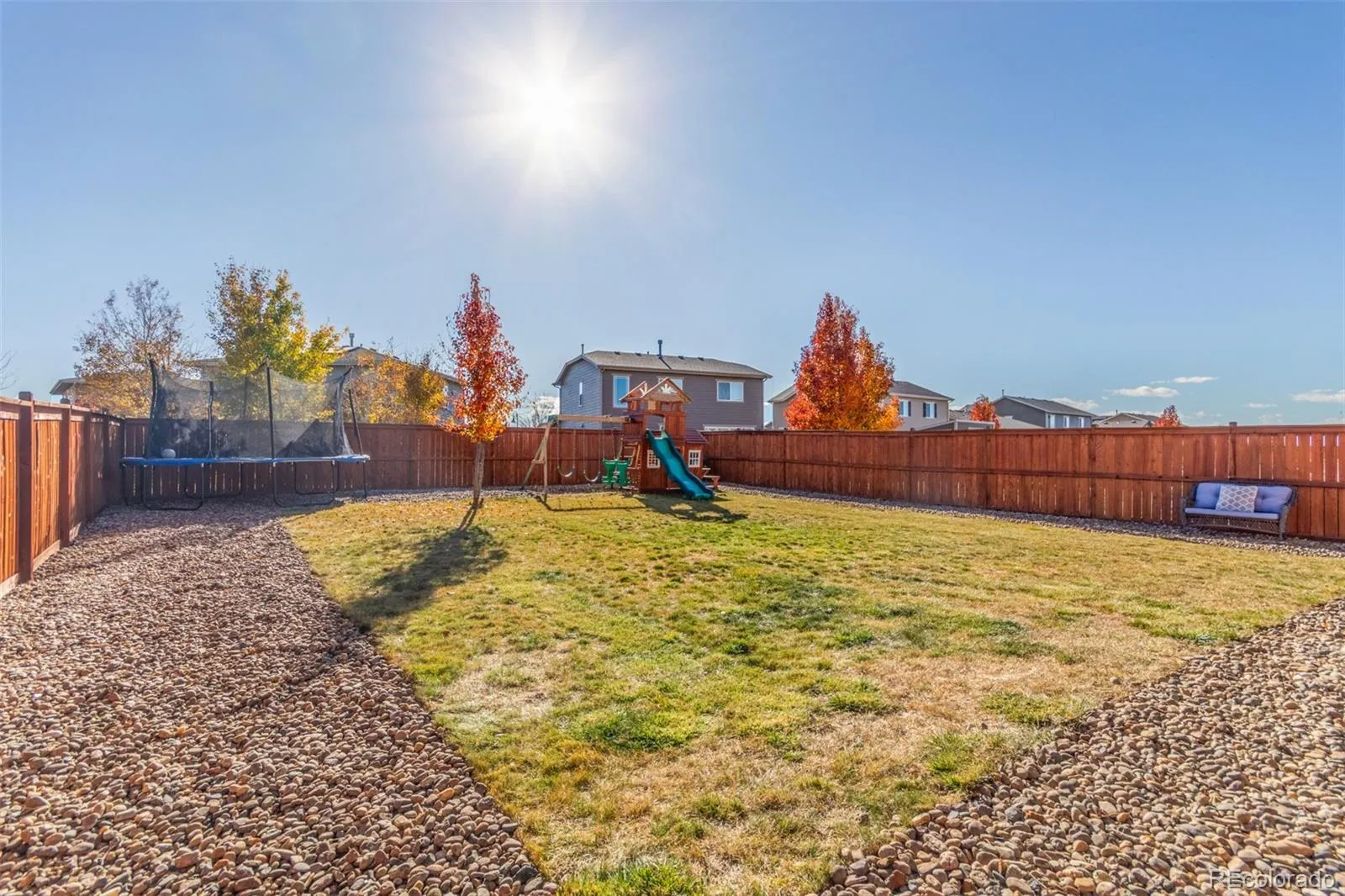 The search is finally over! This delightful 4-bedroom home welcomes you with a 2-car garage, tasteful stone accents, and a manicured front lawn. Discover a serene open layout with high ceilings, a soothing palette, blinds, and a harmonious blend of soft carpeting and wood-look flooring. The gourmet kitchen comes with granite counters, ample wood cabinets, pendant/recessed lighting, a striking tile backsplash, stainless steel appliances, a pantry, and an island with a breakfast bar. The cozy main bedroom features an ensuite with dual sinks and a walk-in closet. Unwind in the lovely backyard, boasting a covered patio, lush natural turf, and a playground for outdoor fun. Don’t miss out on this gem!