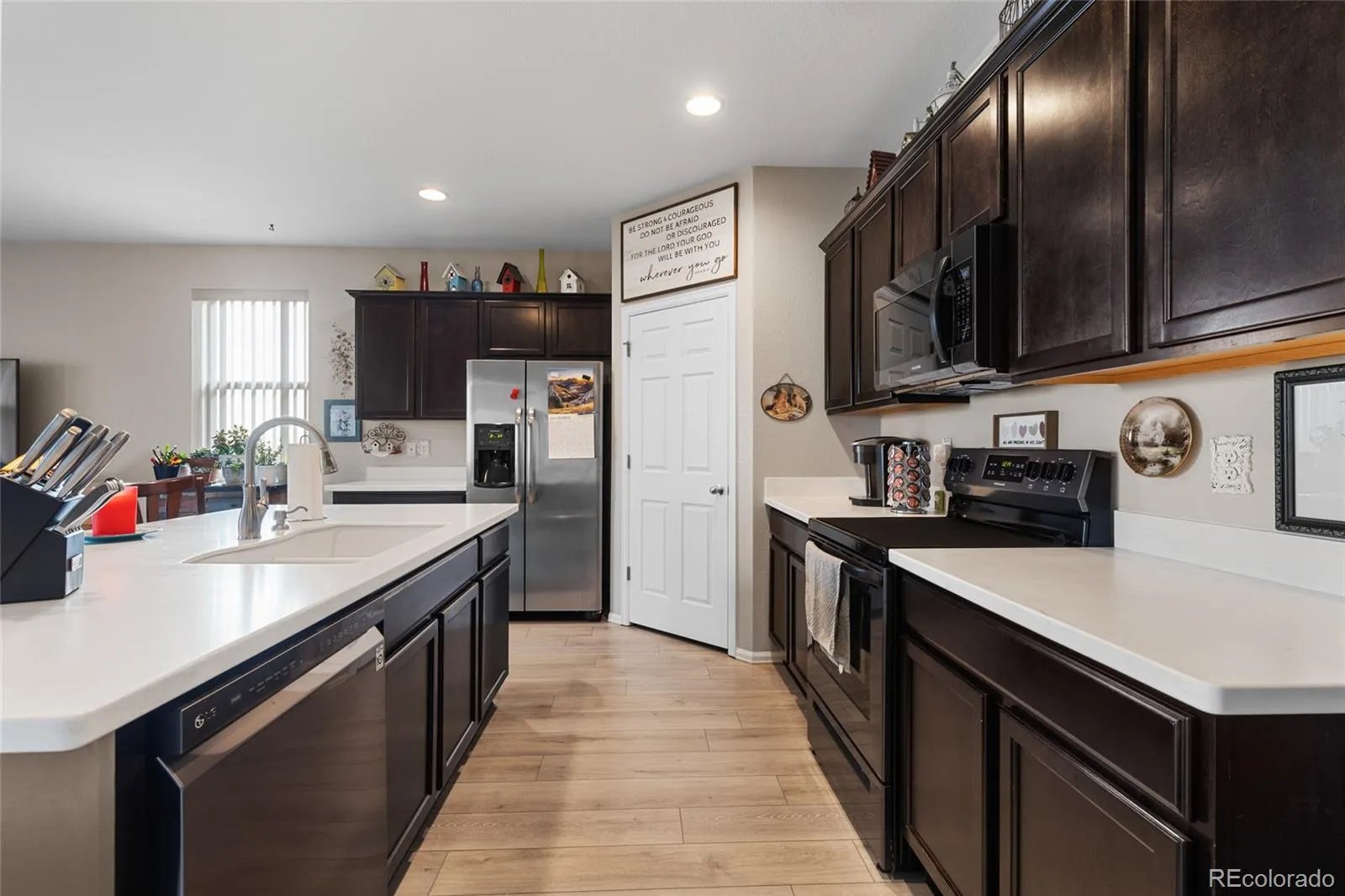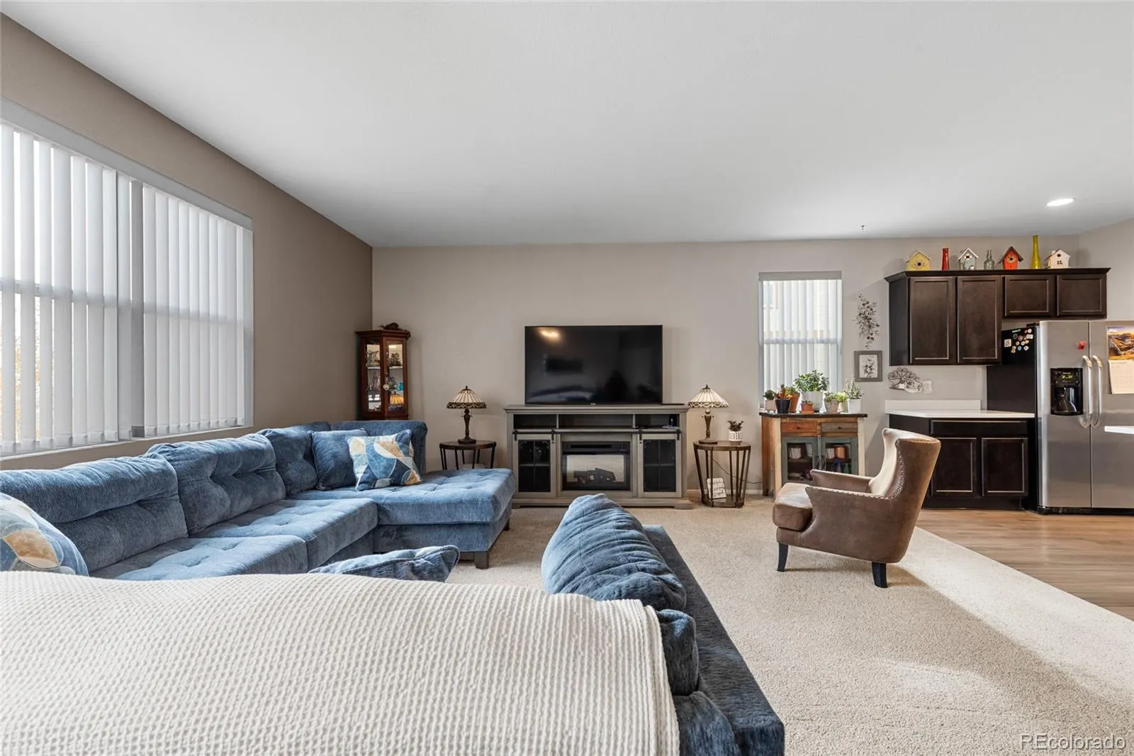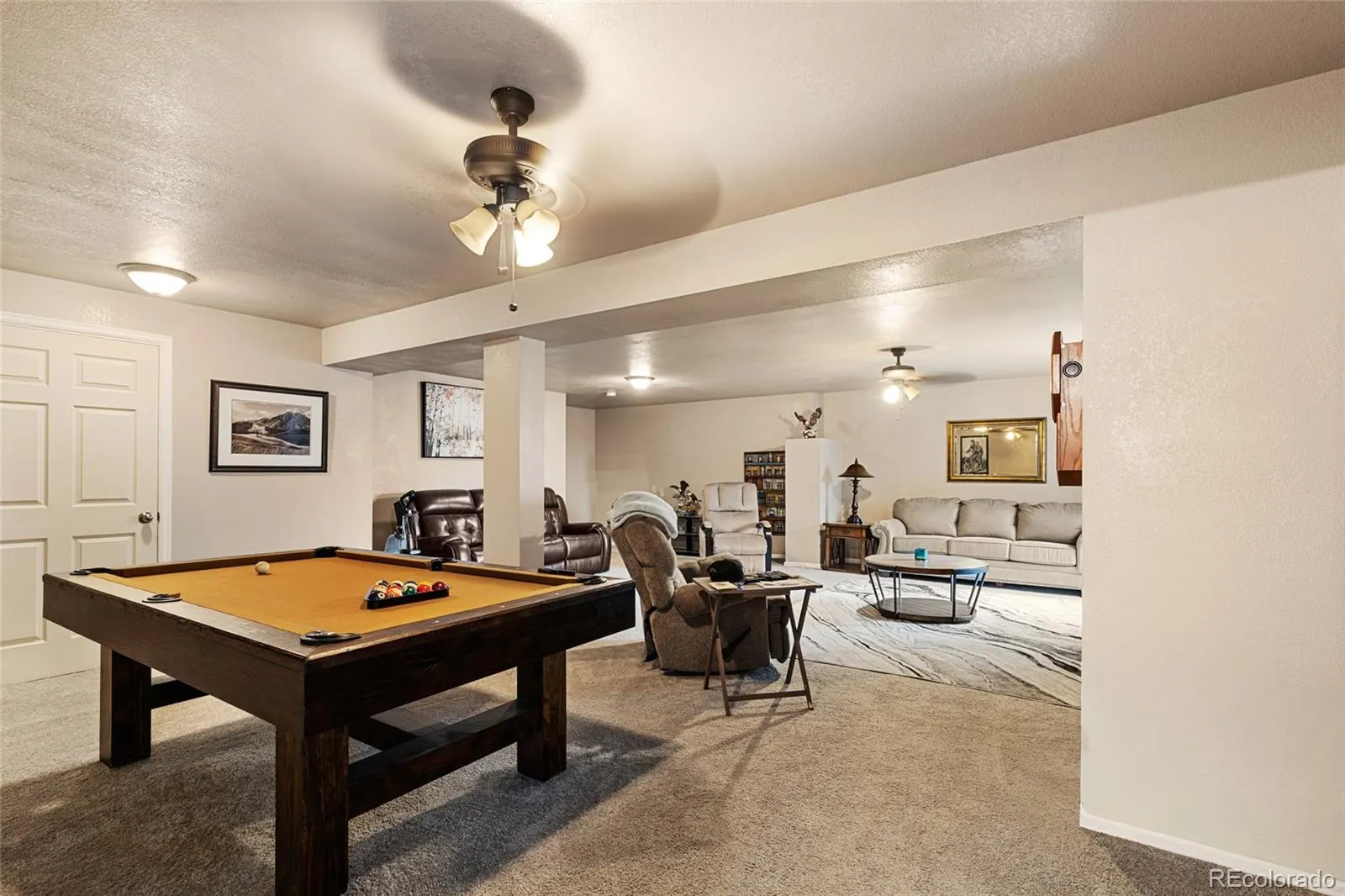Welcome home! This gorgeous ranch-style property offers 4 bedrooms, 3 bathrooms, a 2-car garage, and a full finished basement, with new interior features that set it apart from similar homes. The main living area showcases solid-surface flooring for easy maintenance, while the spacious kitchen includes a large built-in island, beautiful cabinetry, stainless steel appliances, quartz countertops, and recently updated counters, sink, and faucet. Enjoy the covered backyard patio, xeriscaped yard with sprinklers in front and back.. The sale includes the dining table with six chairs, upstairs couches including the full wrap-around blue sectional with throw pillows, a brown leather chair, the basement TV (approx. 60″–75″), basement couches and chairs, downstairs end and coffee tables, the pool table, the garage TV, window coverings, both sheds, bar stools, and both fire entertainment features. The roof is one month old, kitchen flooring is less than a year old, and the furnace, water heater, and A/C have been recently serviced and certified. Additional features include a back deck awning, epoxy-coated garage flooring which is less than two years old. Backyard sprinklers are currently turned off after being blown out.