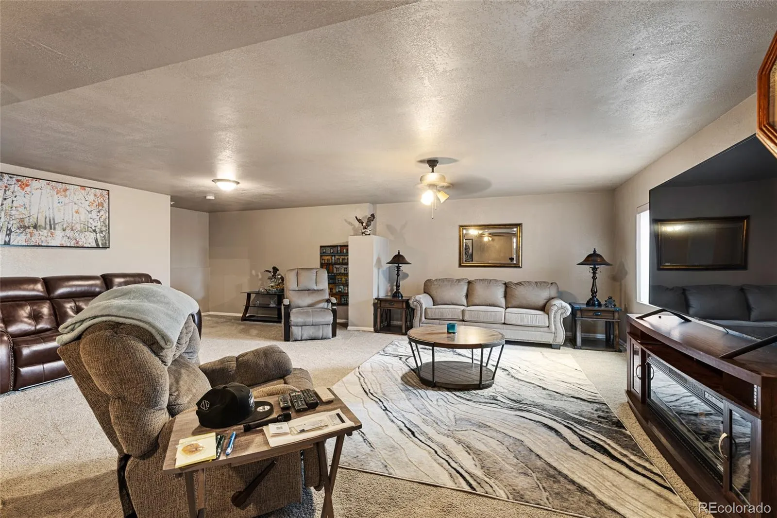 Welcome home! This gorgeous ranch-style property offers 4 bedrooms, 3 bathrooms, a 2-car garage, and a full finished basement, with new interior features that set it apart from similar homes. The main living area showcases solid-surface flooring for easy maintenance, while the spacious kitchen includes a large built-in island, beautiful cabinetry, stainless steel appliances, quartz countertops, and recently updated counters, sink, and faucet. Enjoy the covered backyard patio, xeriscaped yard with sprinklers in front and back.. The sale includes the dining table with six chairs, upstairs couches including the full wrap-around blue sectional with throw pillows, a brown leather chair, the basement TV (approx. 60″–75″), basement couches and chairs, downstairs end and coffee tables, the pool table, the garage TV, window coverings, both sheds, bar stools, and both fire entertainment features. The roof is one month old, kitchen flooring is less than a year old, and the furnace, water heater, and A/C have been recently serviced and certified. Additional features include a back deck awning, epoxy-coated garage flooring which is less than two years old. Backyard sprinklers are currently turned off after being blown out.
