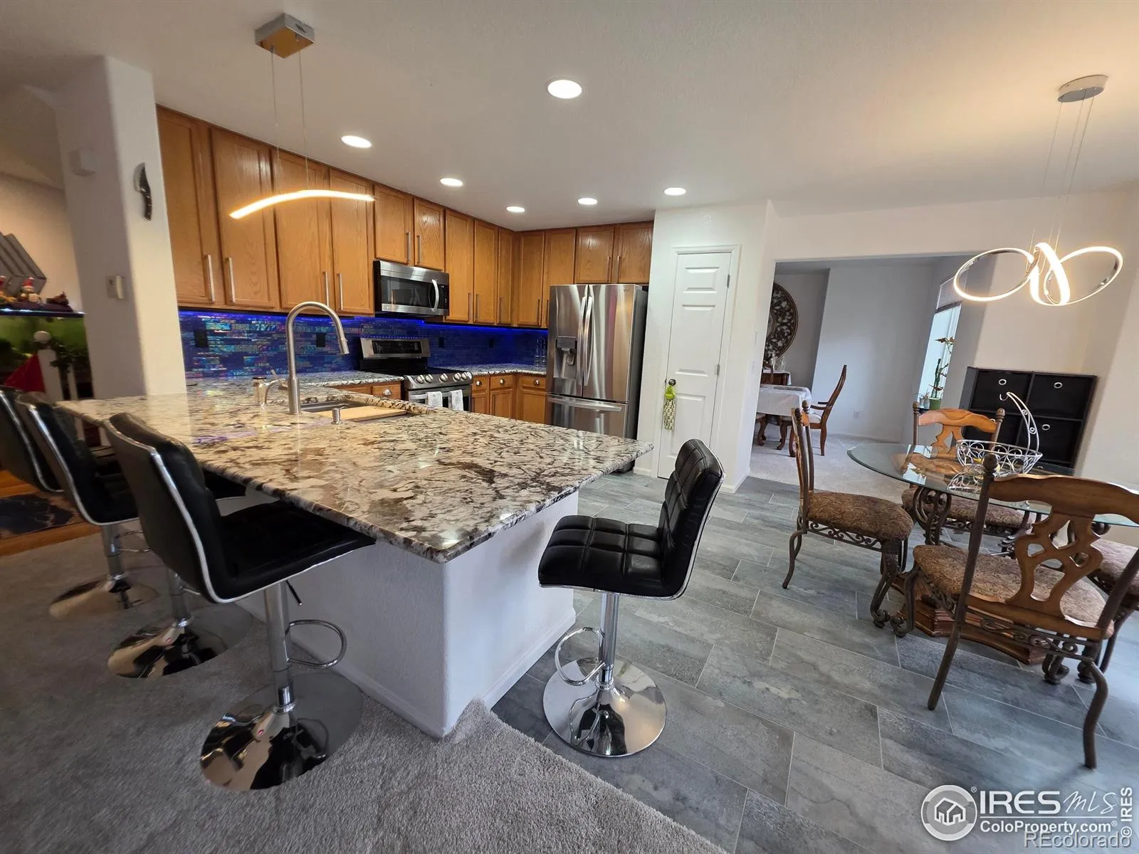 Pride of ownership shows in the one owner home that has been completely updated. Home has new carpet throughout, all modern light fixtures, granite kitchen tops, and modern tile for hard surfaces. Family room features a gas fireplace, entertainment center, and French Doors to the deck. Home abuts the community park, with gate access and lots of trees. Basement is finished with a bonus “hobby room”, bar, and entertaining area. Backyard has a deck and water feature overlooking the neighborhood park. 3 car garage includes overhead shelving for storage, room for toolboxes and toys. Newer solar system will be owned by the next owner ensuring affordable utilities for years to come. Commuting is very easy, as it’s close to C-470 and I-25 with future plans for light rail in the area. Primary bedroom is very large, open, and has a massive bathroom, with soaking tub, separate shower, dual sinks, walk-in closet, and spectacular views from the bay window. The 3 remaining upstairs bedrooms are nicely sized and share an updated bathroom. Basement has an additional bedroom, with private 3/4 bath. Pictures do not truly show how nice this home really is. Home is decorated for the holiday season and will truly put you in the spirit.