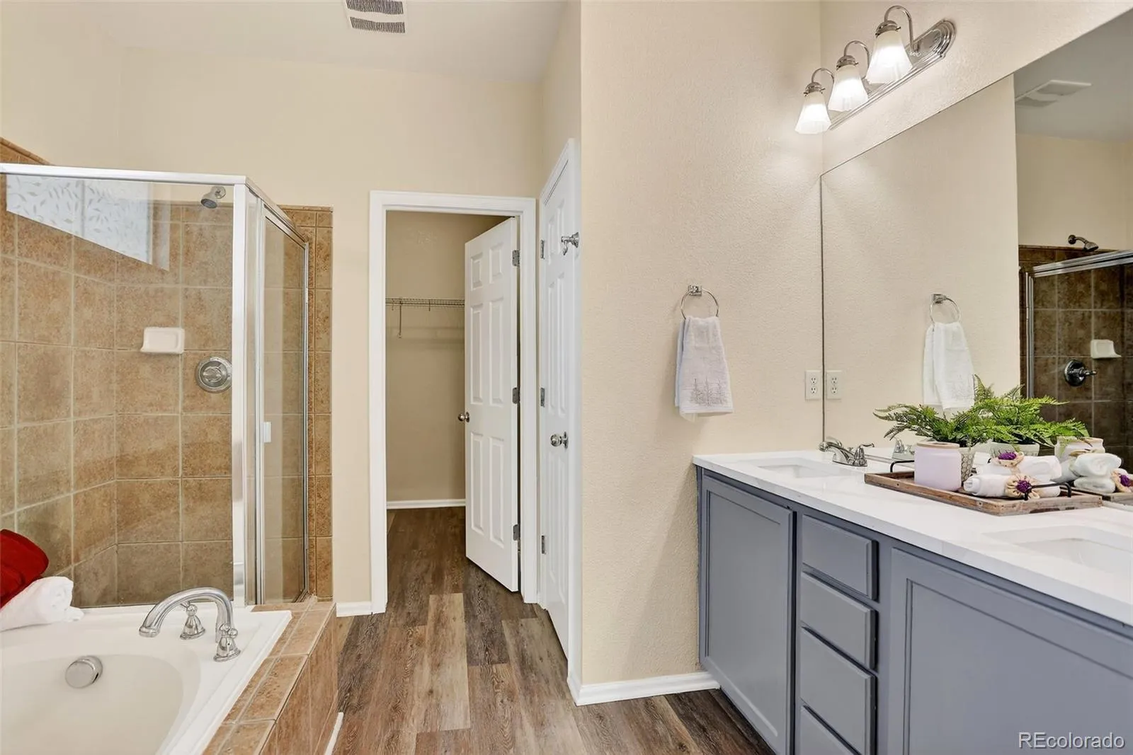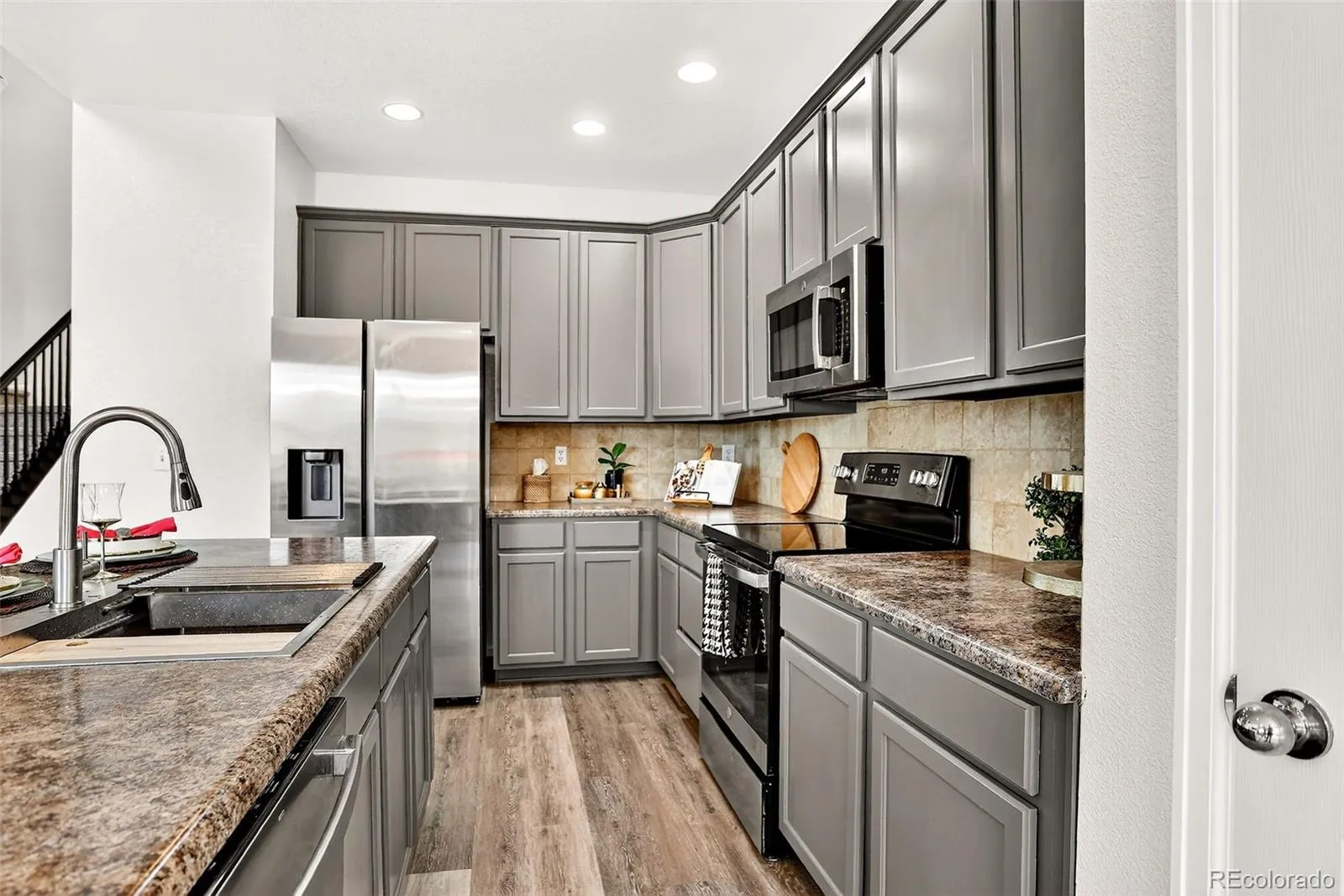 The updated kitchen is a showstopper, featuring stainless steel appliances, updated cabinets, new faucet, durable countertops, and a generous island that makes cooking and entertaining a joy. The main-floor primary suite offers a private retreat with a luxurious 5-piece bath, complete with soaking tub, dual vanities, a separate shower, and walk-in closet. Upstairs, you’ll find a versatile loft, three additional bedrooms, and a full bath with dual sinks perfect for families or guests. The finished basement provides even more living space, with a large recreation room, a wet bar/kitchenette, a fifth bedroom, and a private bathroom, ideal for movie nights, hobbies, or a guest suite. With a brand-new roof (2025), updated windows (8 in 2025), and refreshed bathrooms with new sinks and faucets and toilet seat, this home is truly move-in ready from top to bottom. Cross Creek residents enjoy a community pool, clubhouse, playground, and parks, all for a low HOA fee. Conveniently located near E-470, I-70, DIA, and Southlands Mall, this home offers easy access to shopping, dining, and entertainment. Best of all, quick possession is available, move in before Christmas and ring in the New Year in your beautiful new home! Don’t wait homes like this in Cross Creek sell fast. Schedule your showing today!
