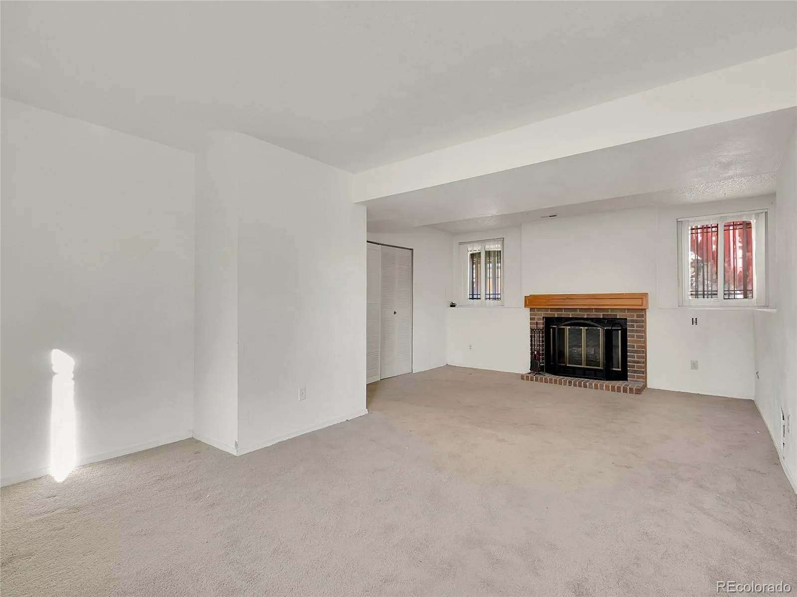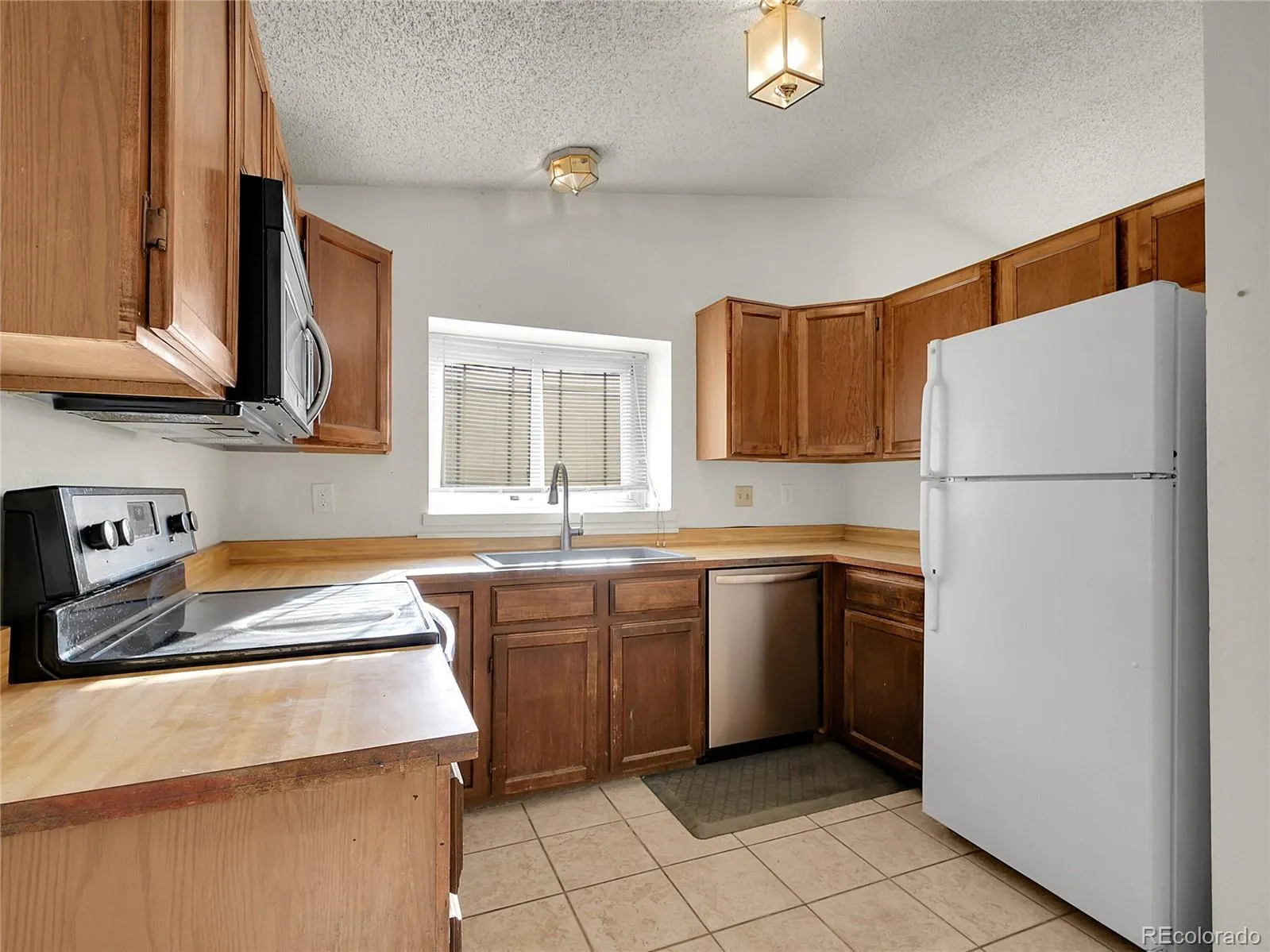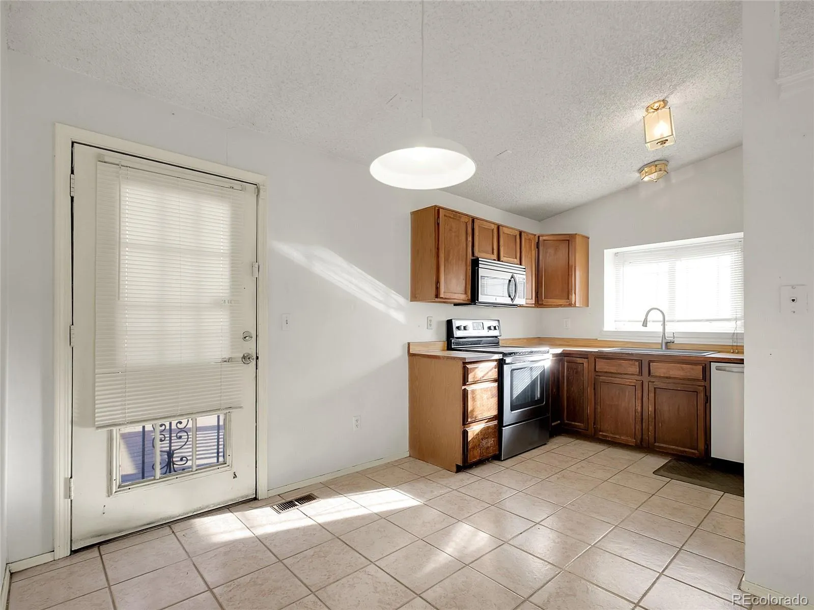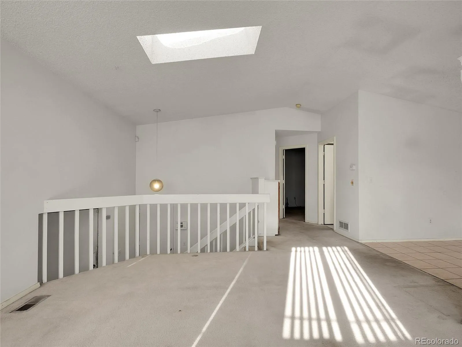 Upon entering, you’ll find a floor plan that includes a warm and inviting living room, complete with a beautiful masonry fireplace—perfect for cozy winter nights. The kitchen is designed for both functionality and style, showcasing modern appliances and rich brown cabinetry, complemented by light tile flooring that adds a welcoming touch. The vaulted ceilings create an open, airy feel, while skylights allow for an abundance of natural light to brighten the space.