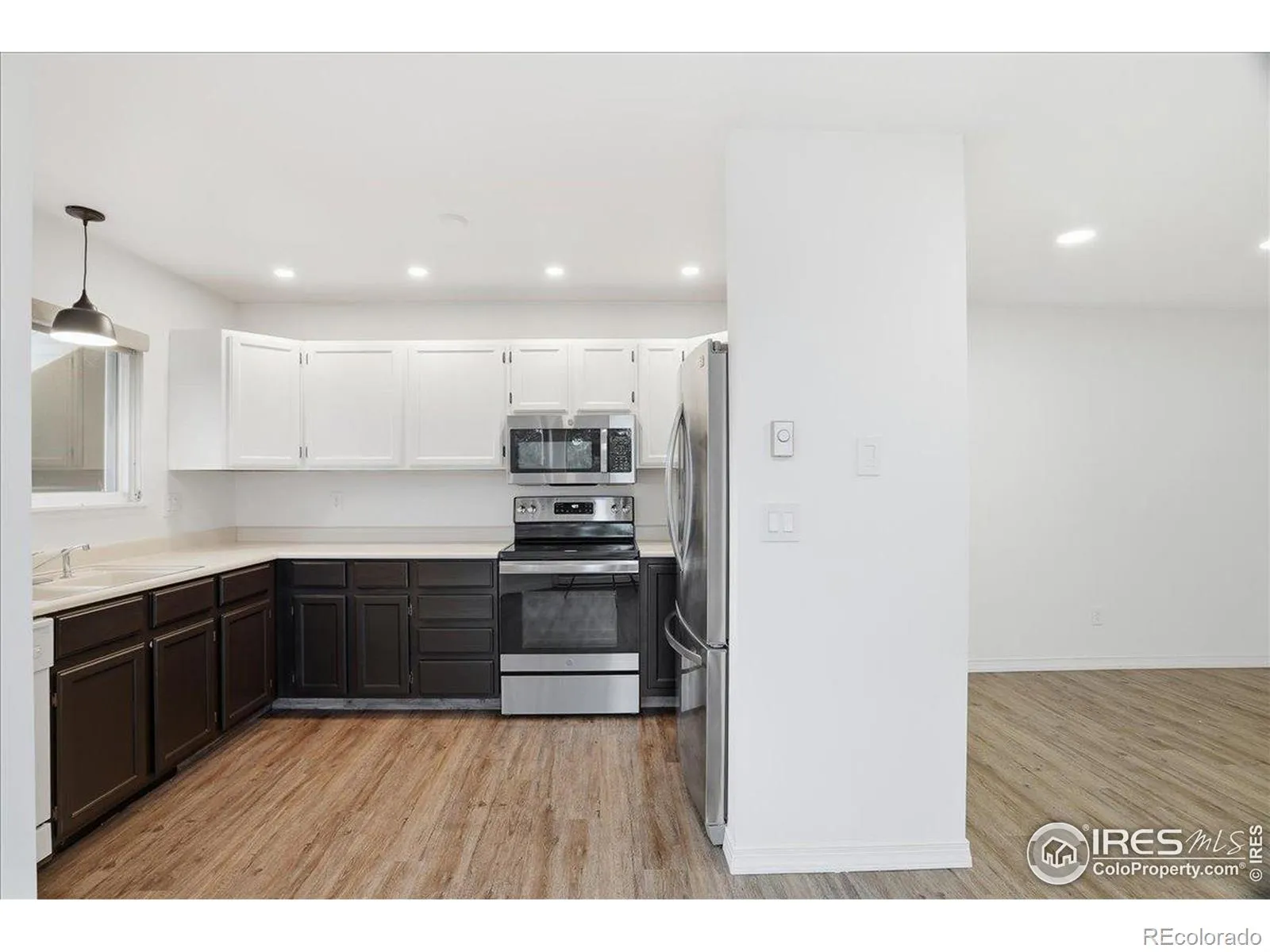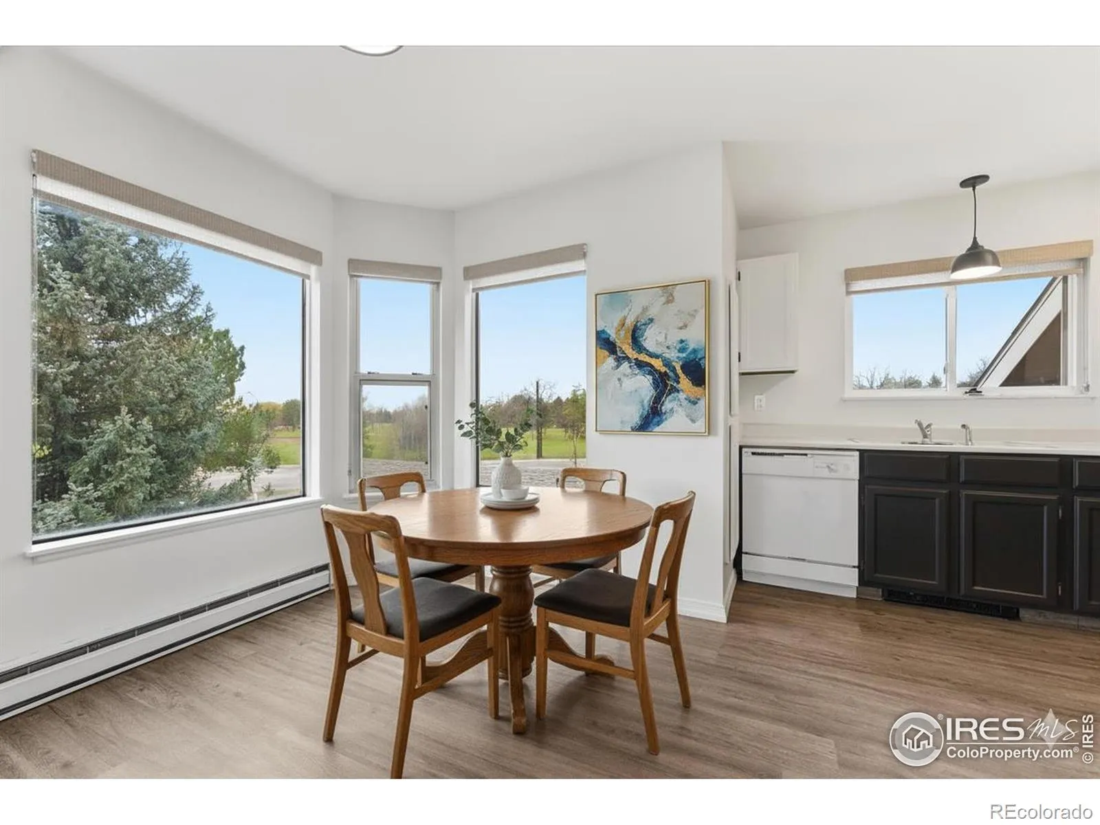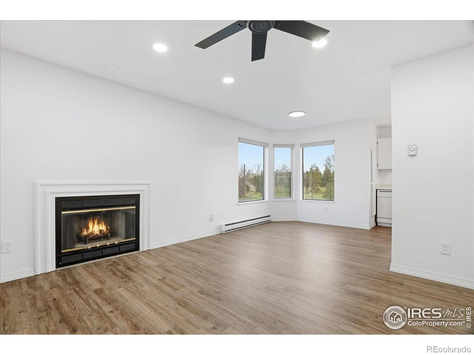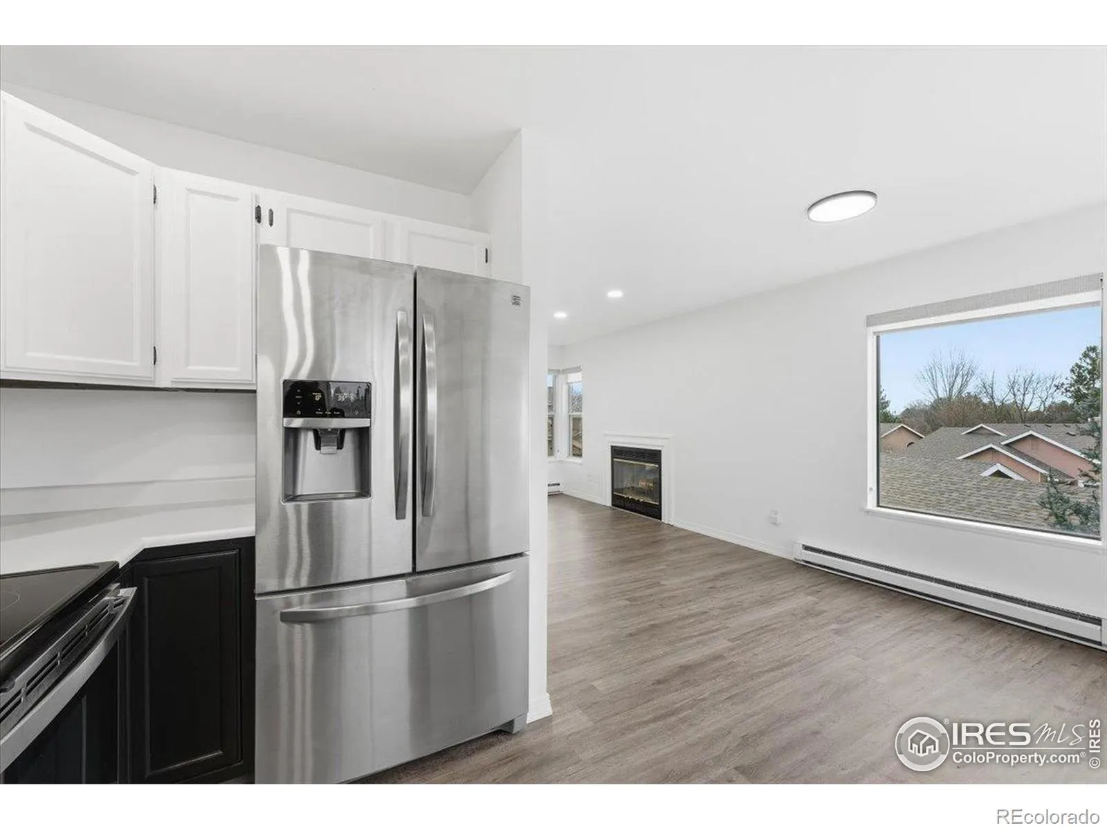 This top-floor 2-bed, 2-bath condo in the Peachtree/Collindale area features updated LVP flooring throughout, newer stainless steel appliances, ceiling fans in each bedroom and the living room, and a bright open layout centered around a wood fireplace. South-facing windows bring in consistent natural light and offer treetop views, while interior sightlines from the dining area provide views toward Collindale Golf Course. The private balcony faces northeast and overlooks mature trees and the surrounding community.The kitchen and dining area sit along a corner of windows that expand the sense of space and bring in morning light. The primary bedroom includes an en-suite bath, and the second bedroom is adjacent to a separate 3/4 bath for added flexibility. In-unit laundry hookups add everyday convenience, and the detached one-car garage provides secure parking and storage. Updated interior surfaces, newer appliances, and LVP flooring contribute to a low-maintenance, move-in-ready living experience. Well-suited as a primary home or investment property.Located near Collindale Golf Course, surrounding greenbelts, and nearby shops and services along Horsetooth and Lemay, this condo offers quick access to outdoor recreation and key Fort Collins amenities. Schools, trail corridors and open spaces are also located within the surrounding community.